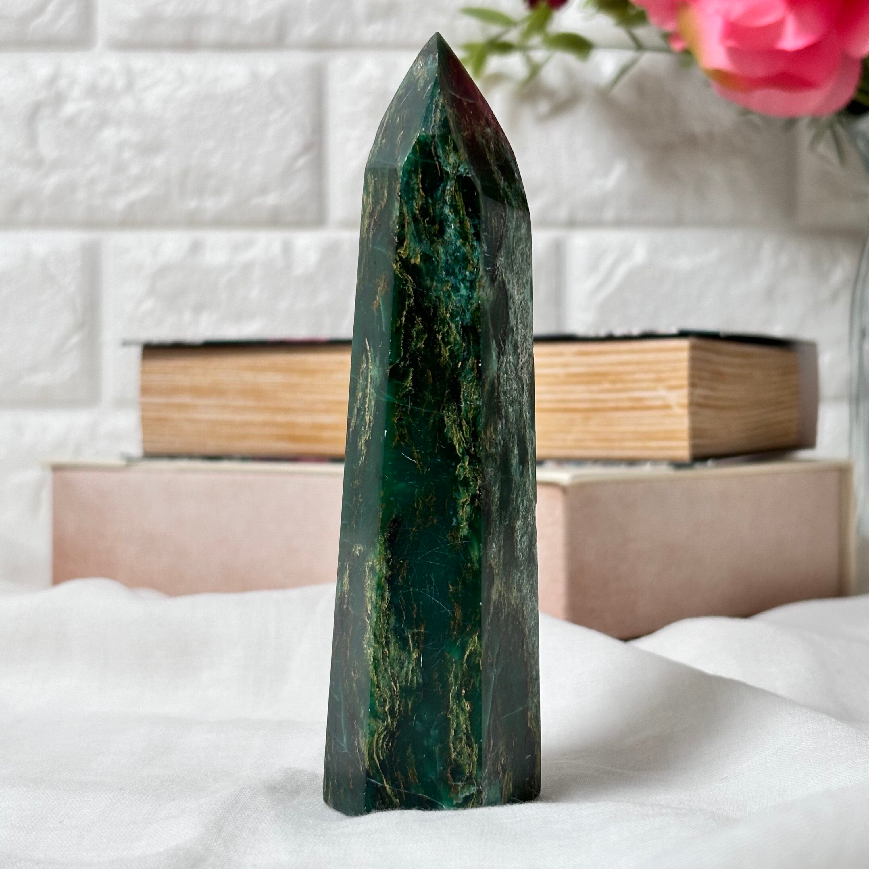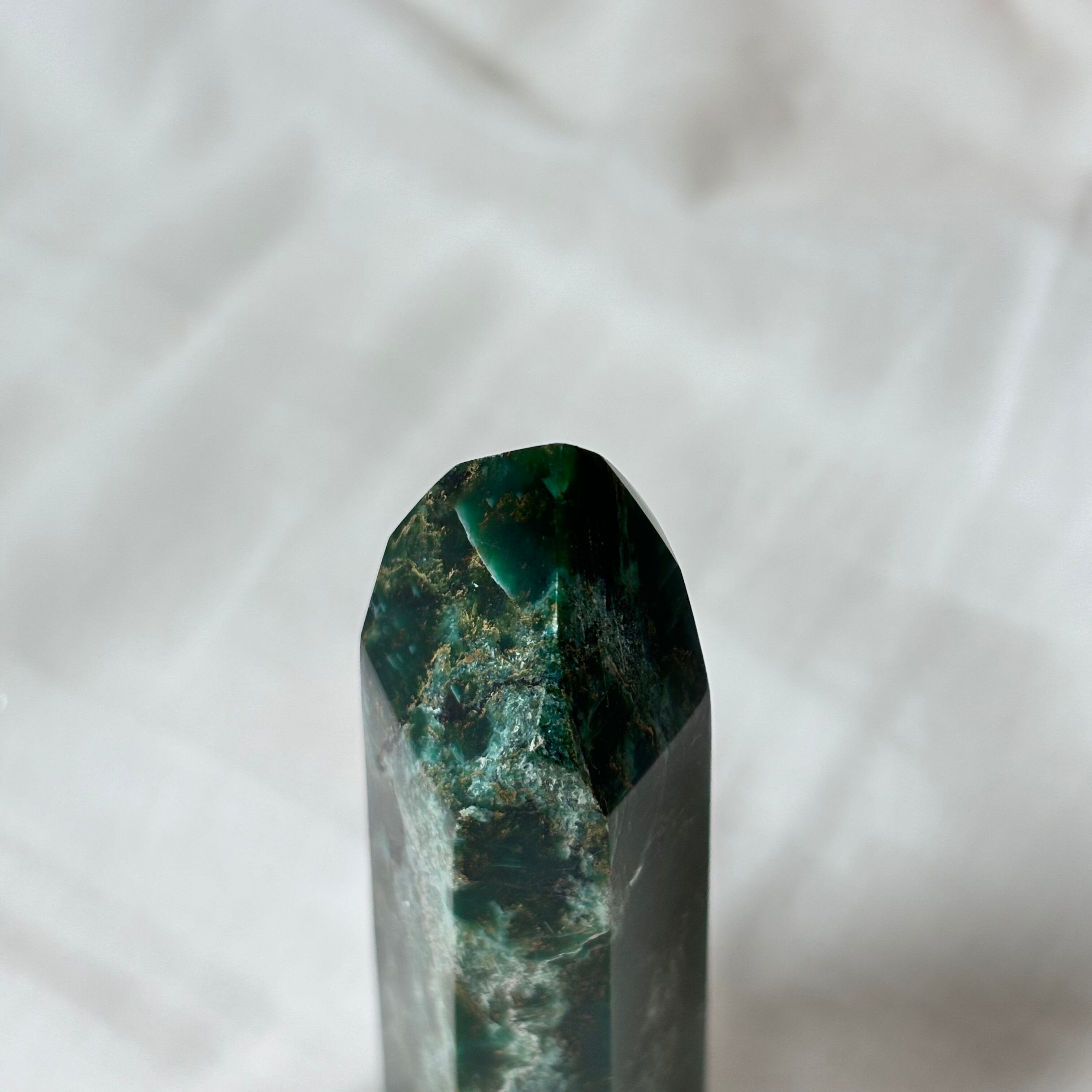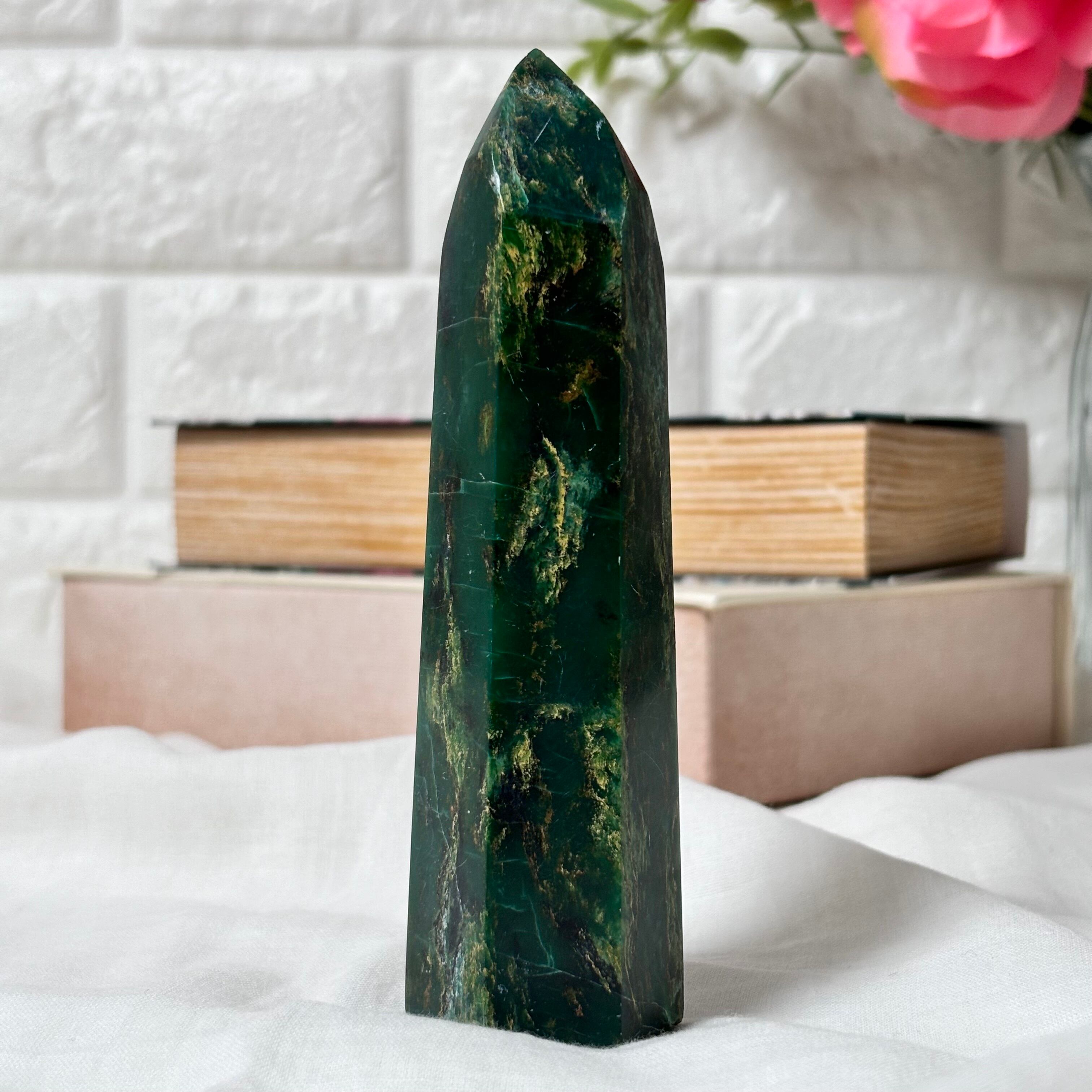 一つの石の中に、深い森のような安らぎと、澄んだ泉のような透明感を同時に感じられる、表情豊かなブラジリアンジェイドのタワーです。