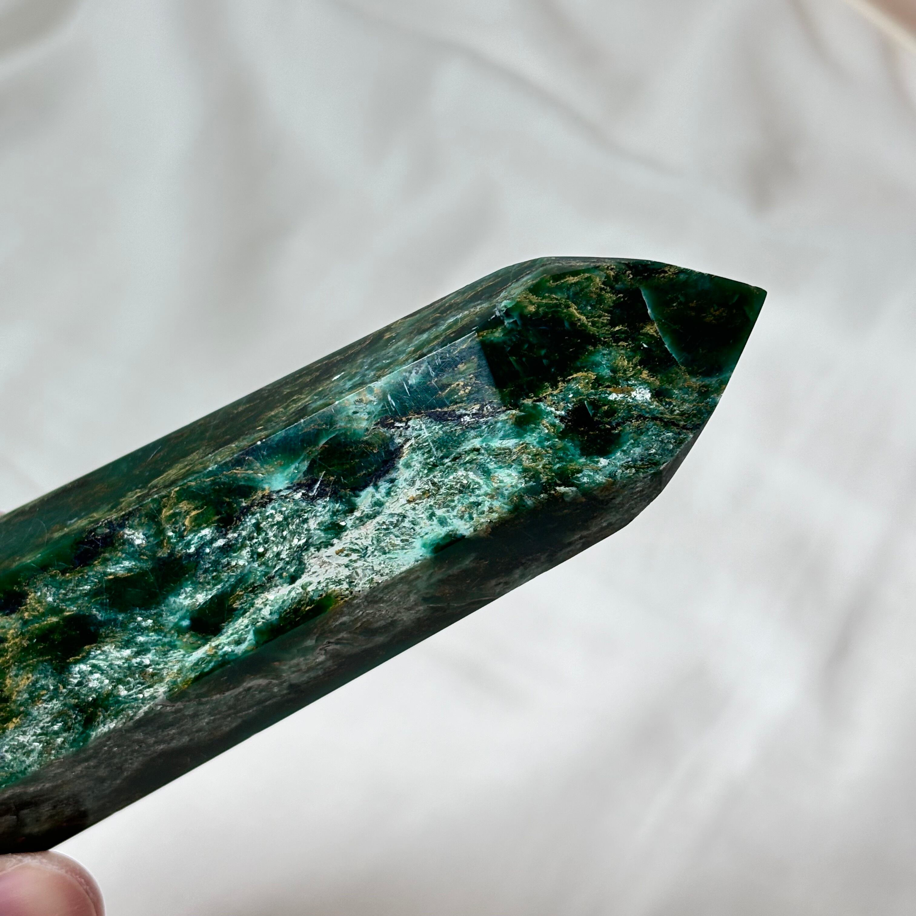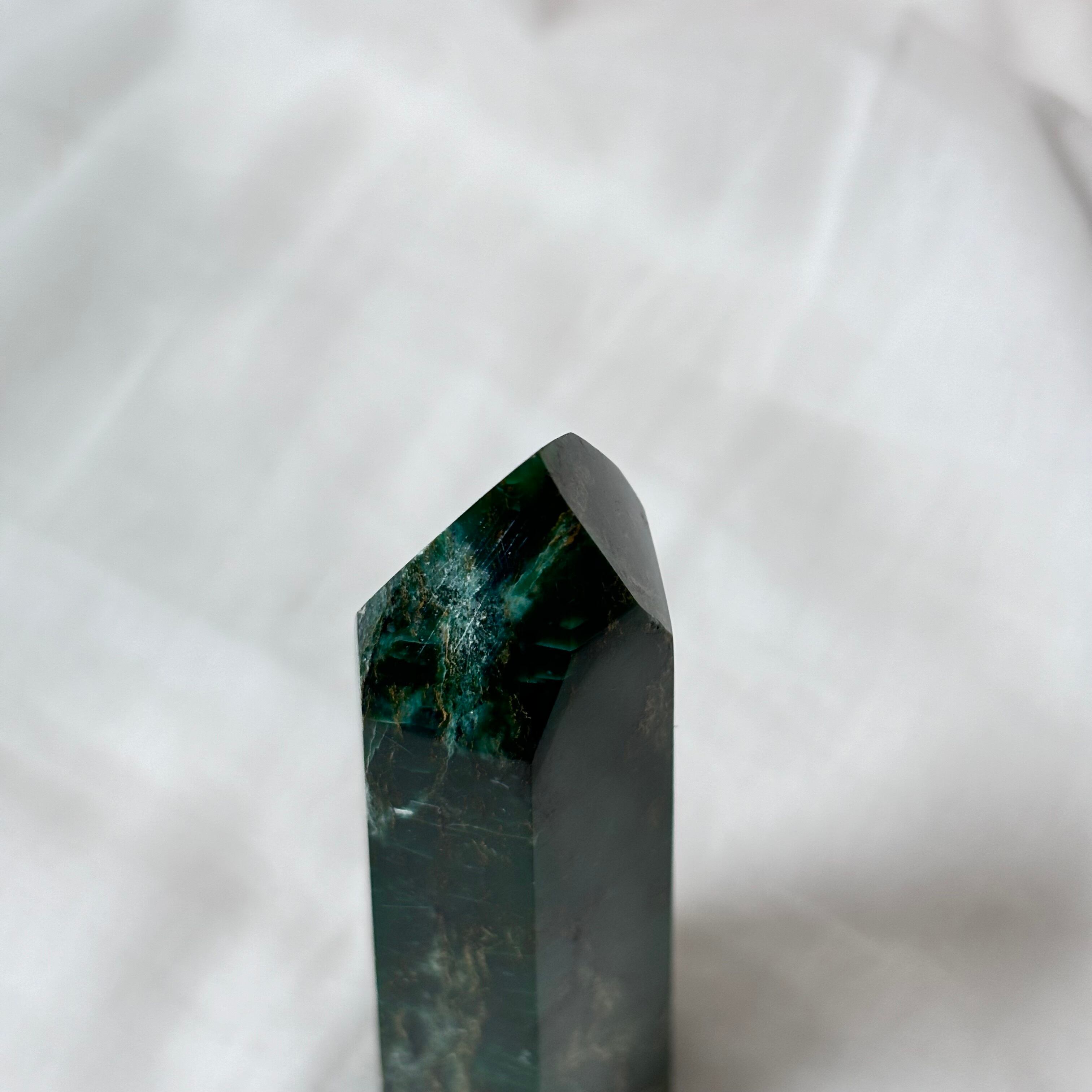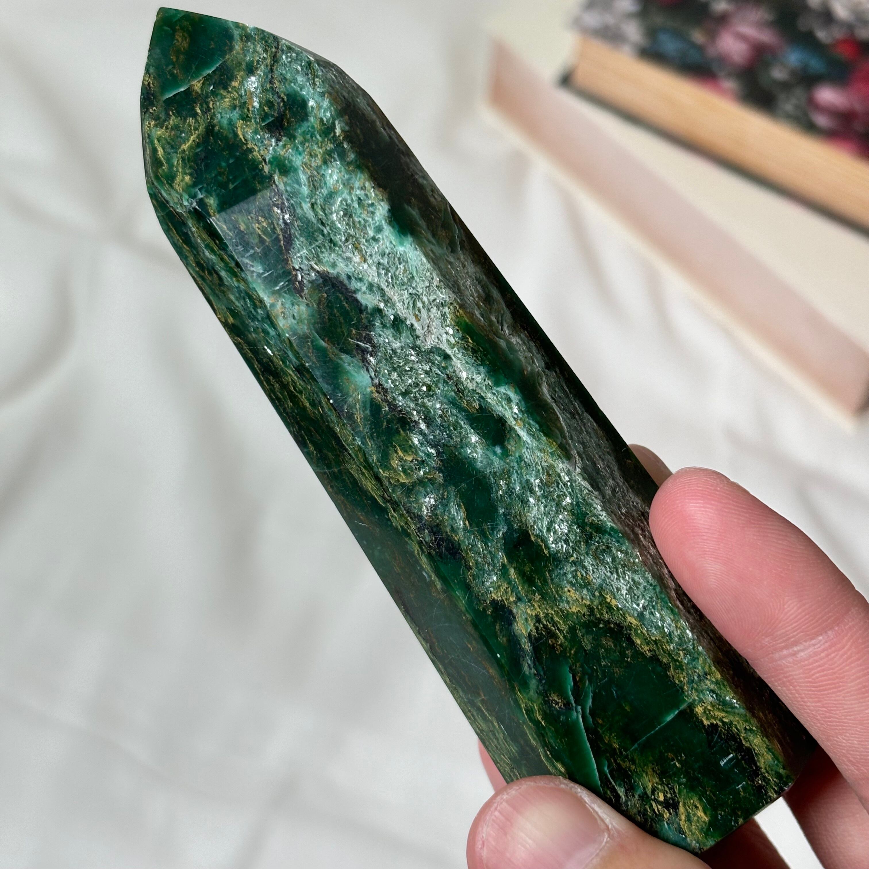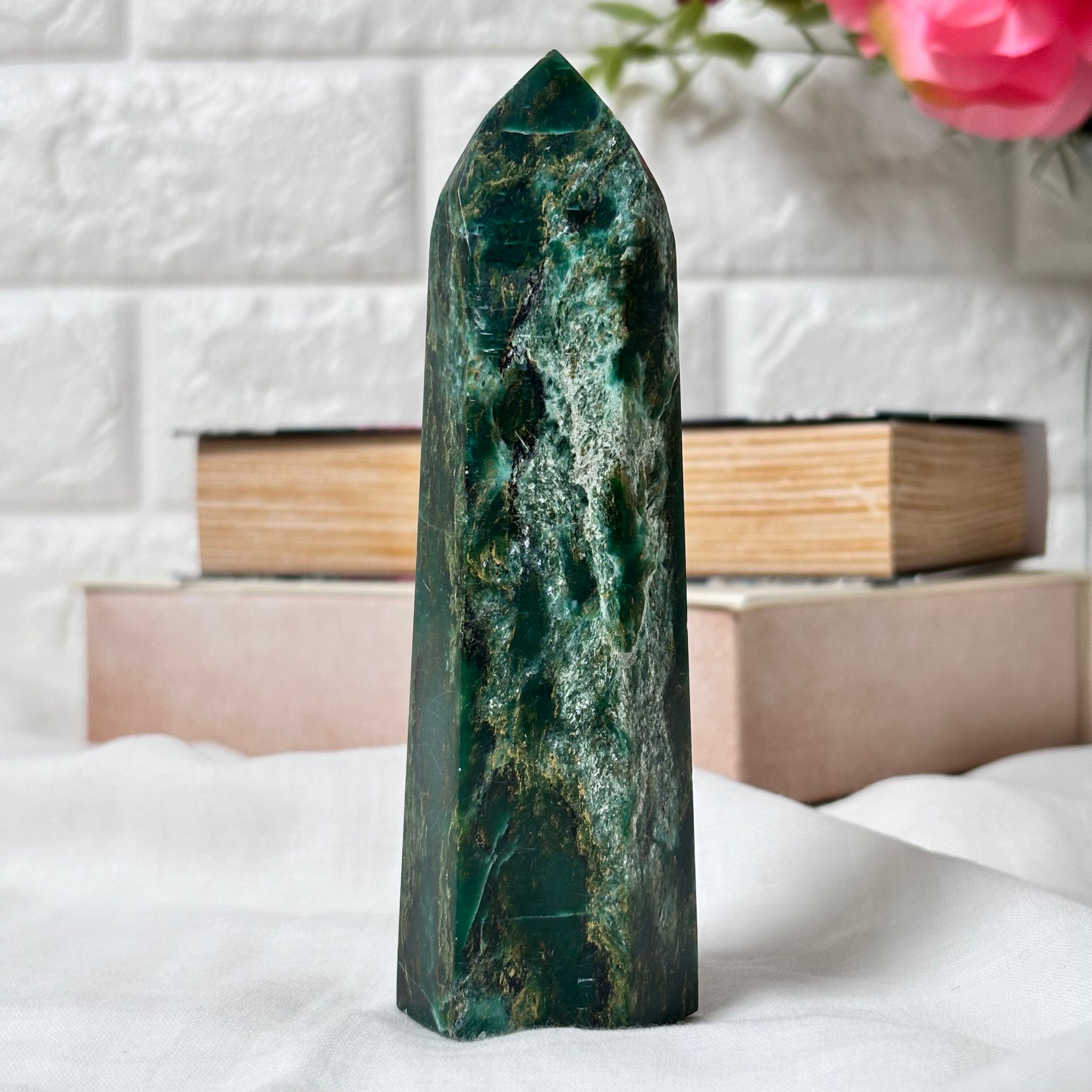 一つの石の中に、深い森のような安らぎと、澄んだ泉のような透明感を同時に感じられる、表情豊かなブラジリアンジェイドのタワーです。