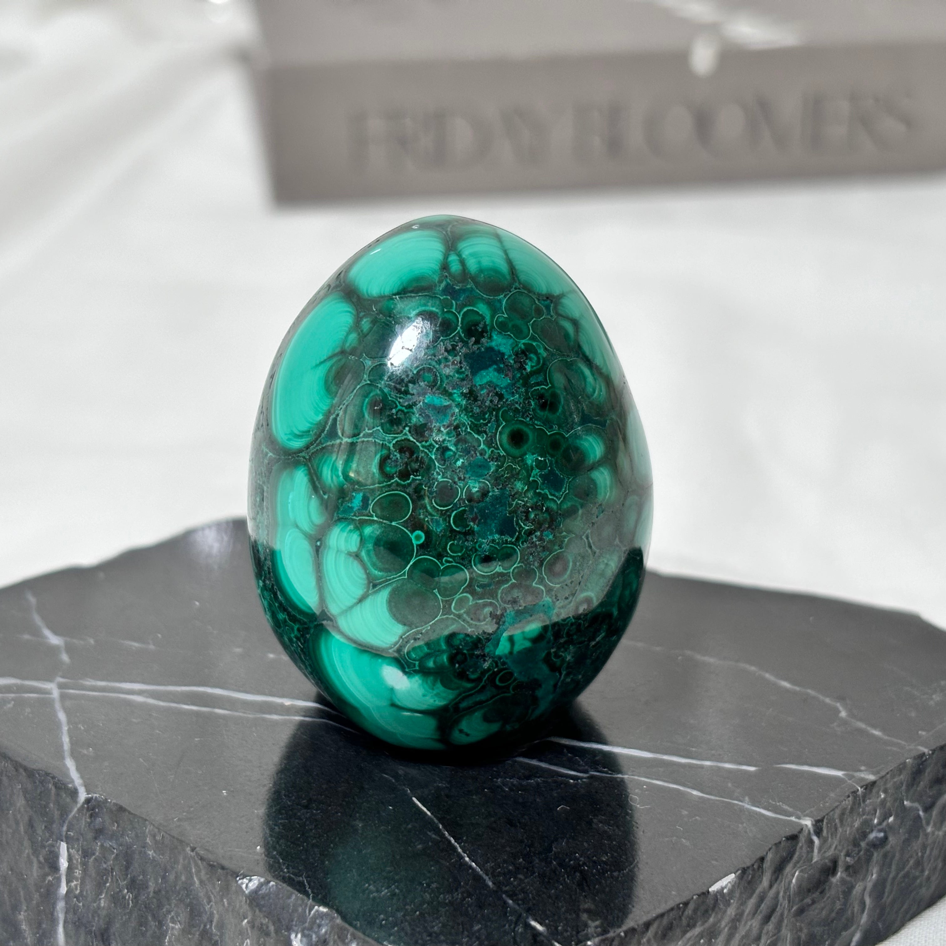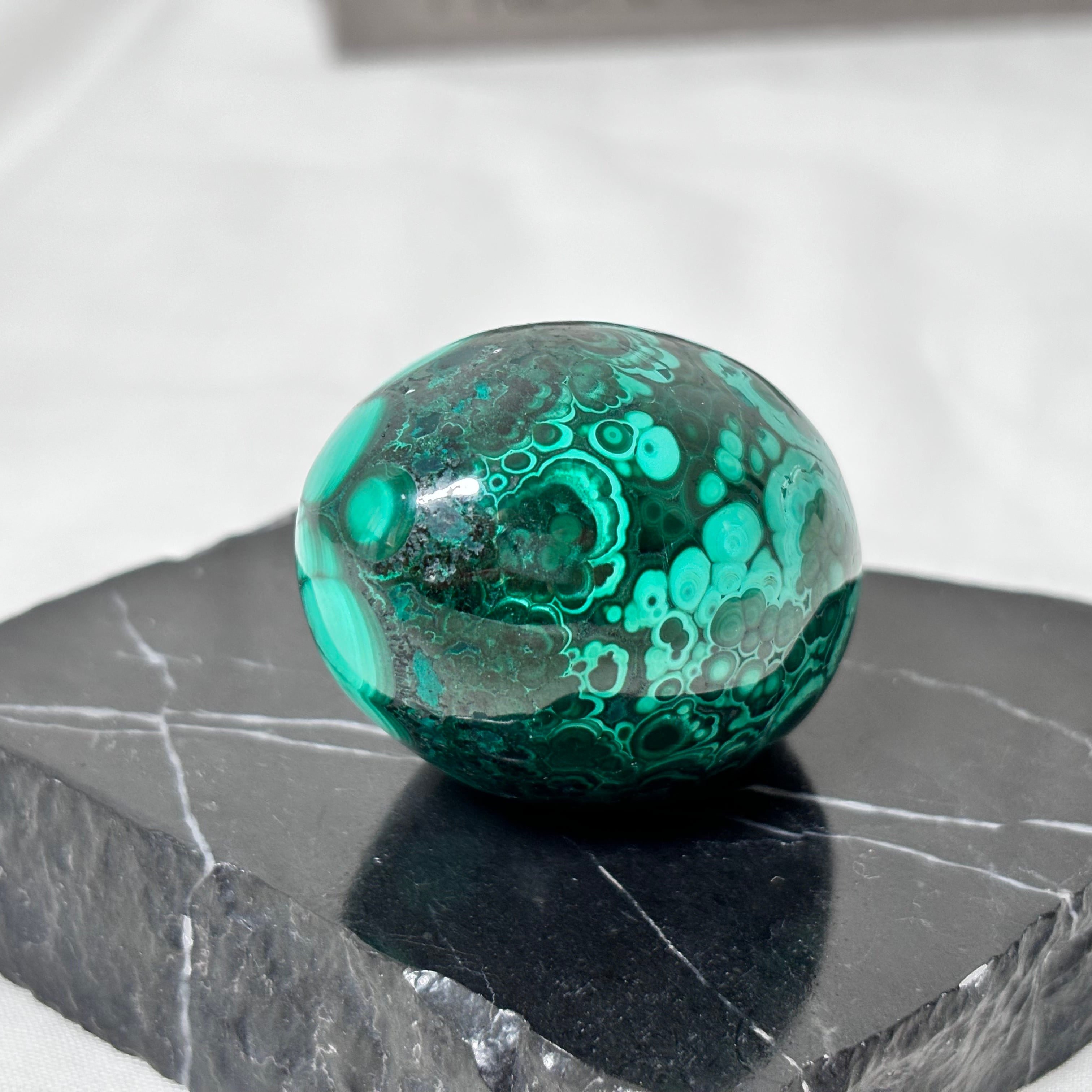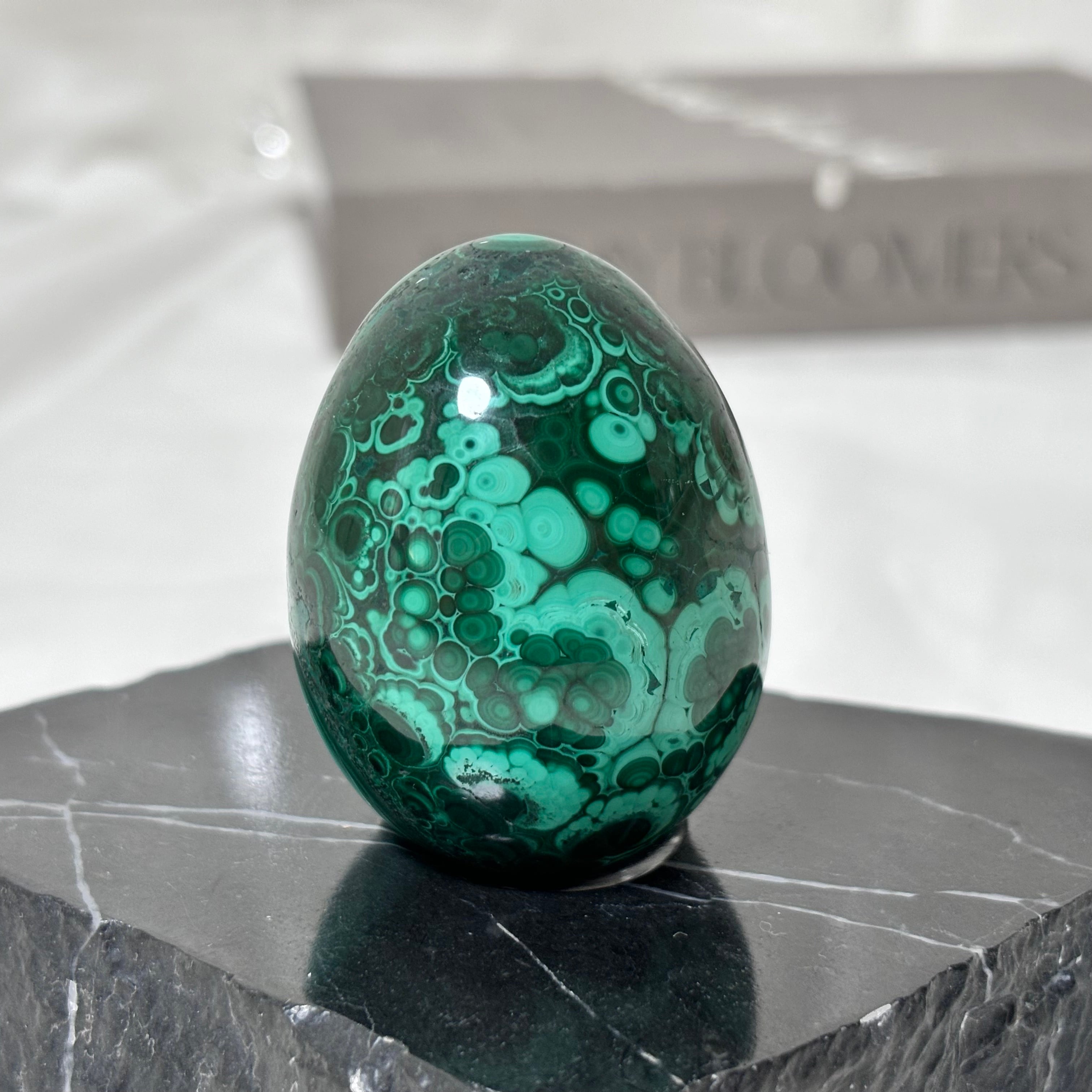 深く濃いグリーンをベースに、ミルキーグリーンの模様が流れるように描かれた、マラカイトのエッグ型オブジェ。