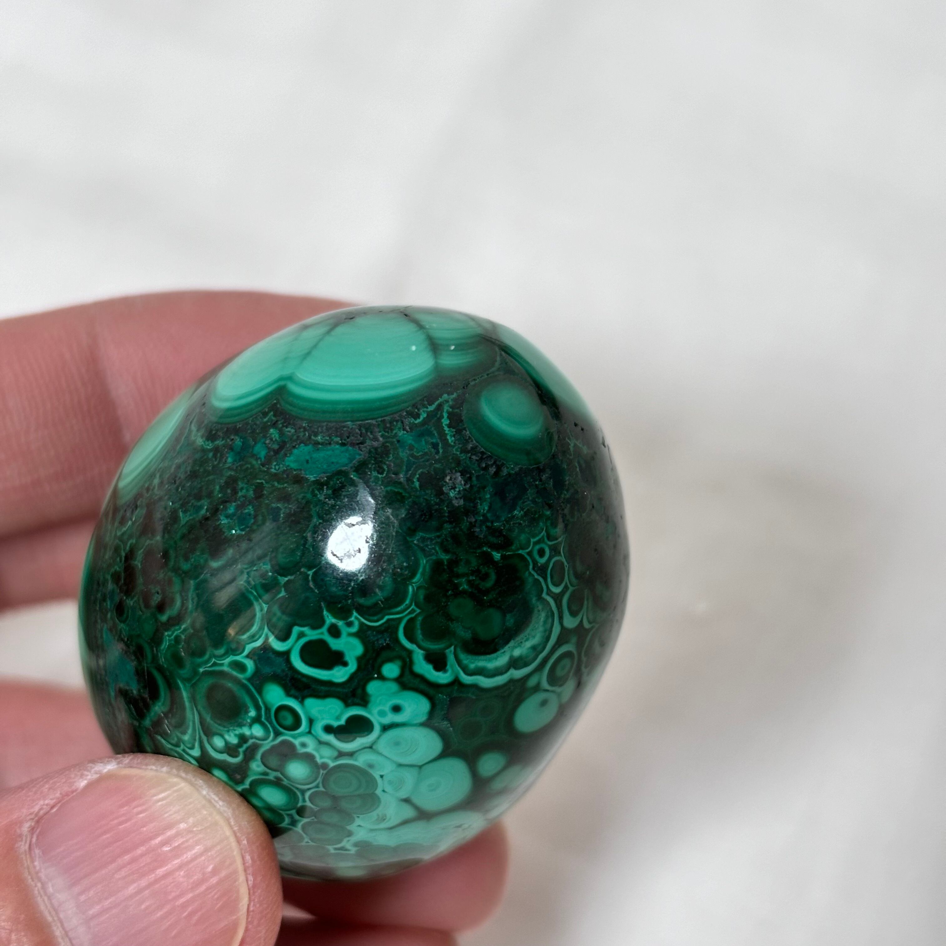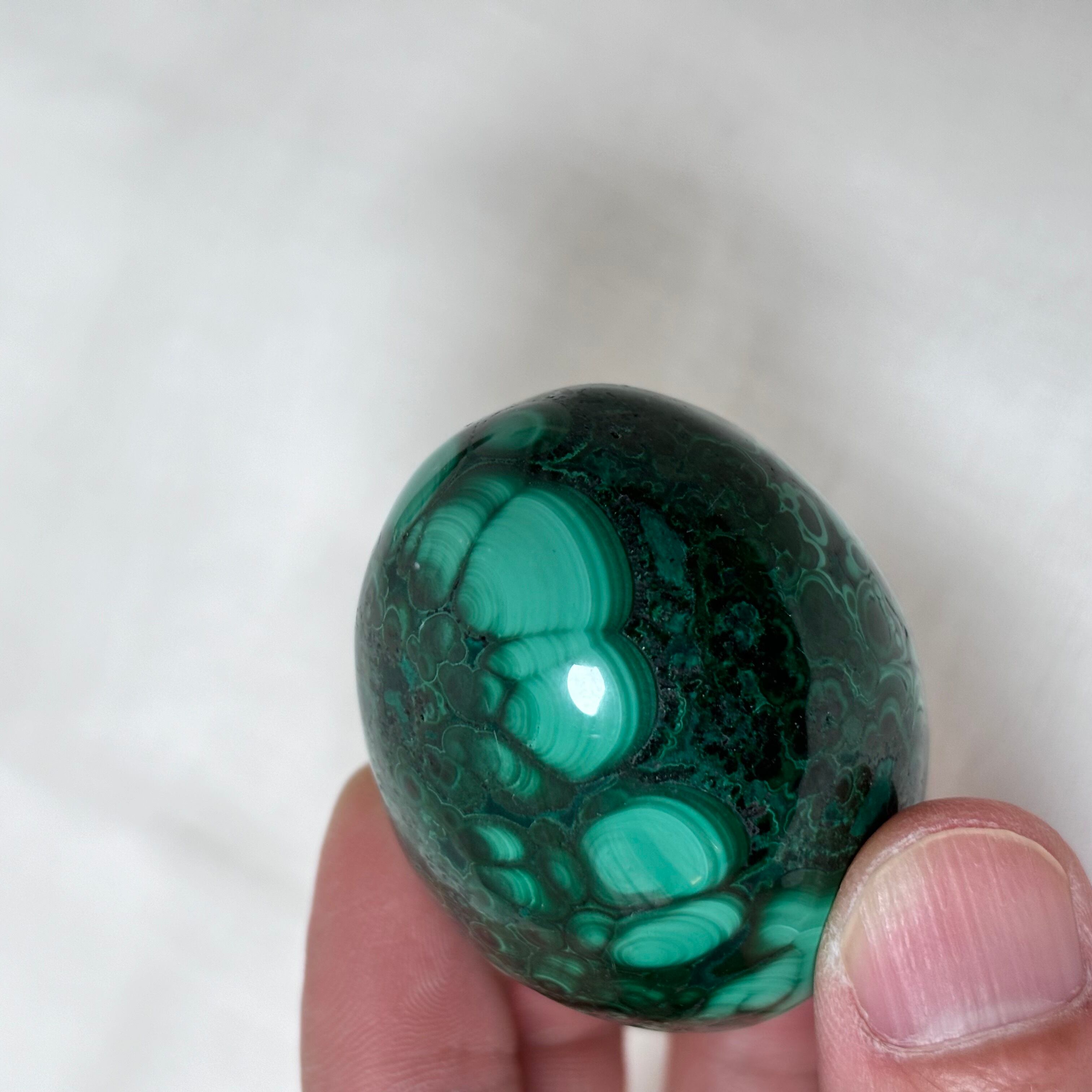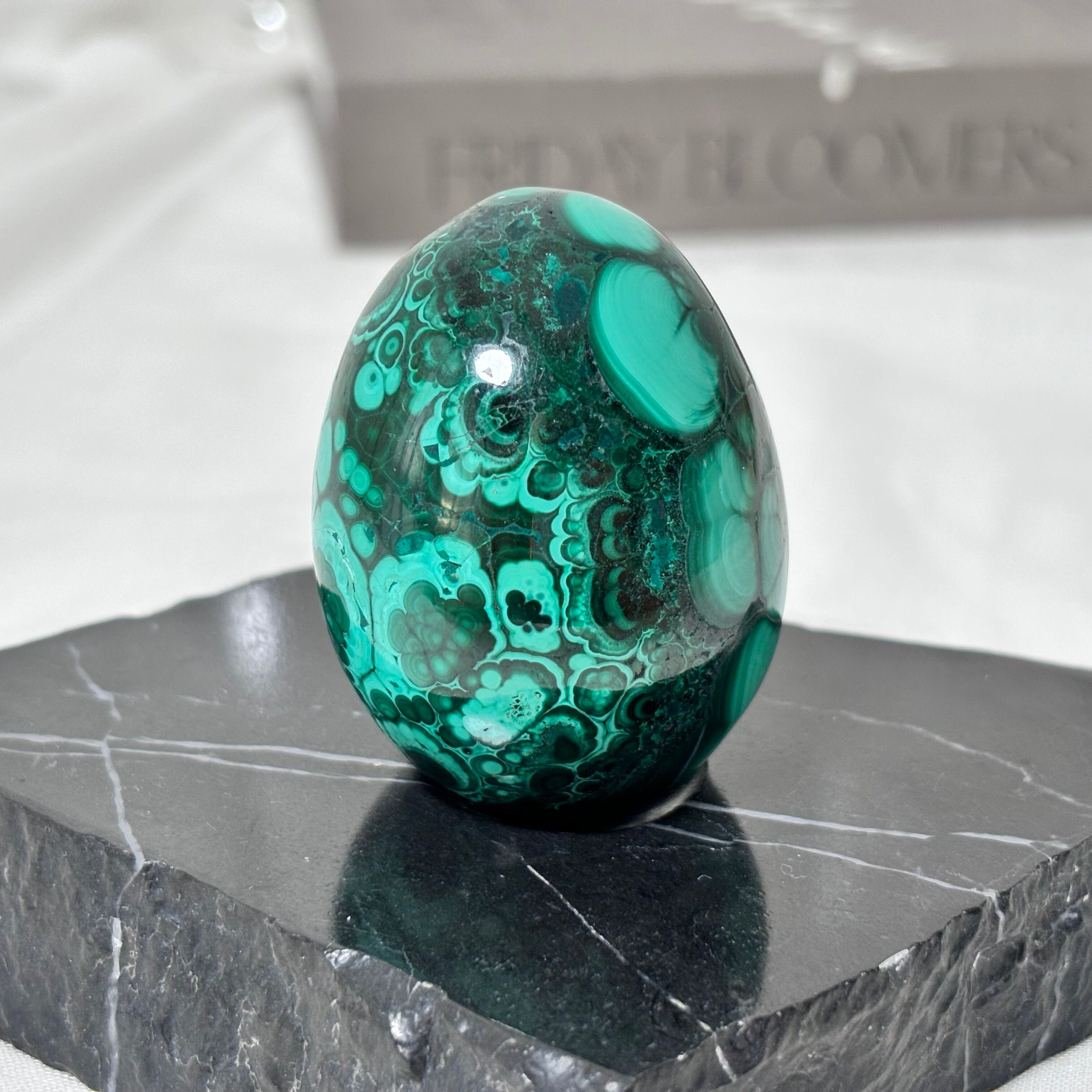 深く濃いグリーンをベースに、ミルキーグリーンの模様が流れるように描かれた、マラカイトのエッグ型オブジェ。