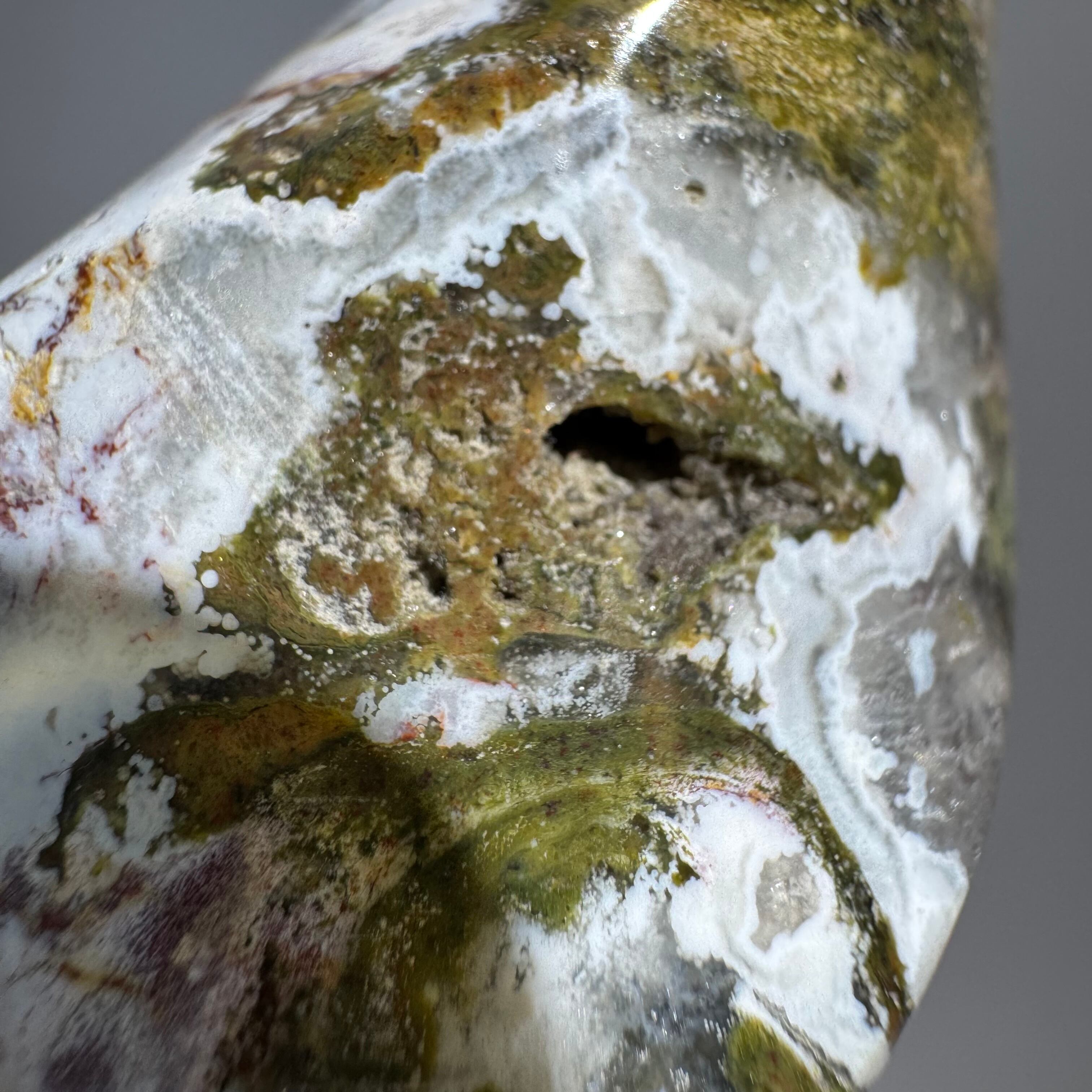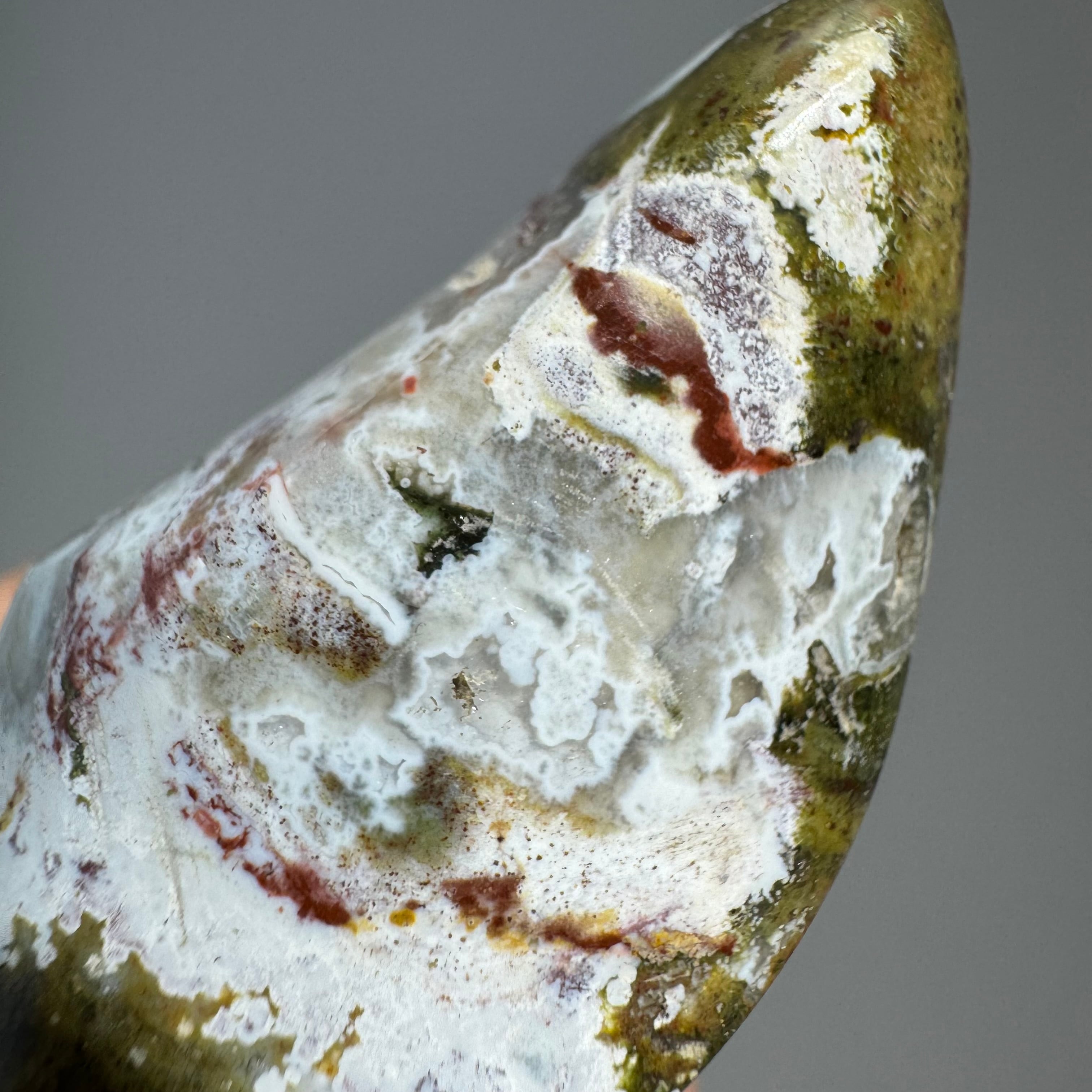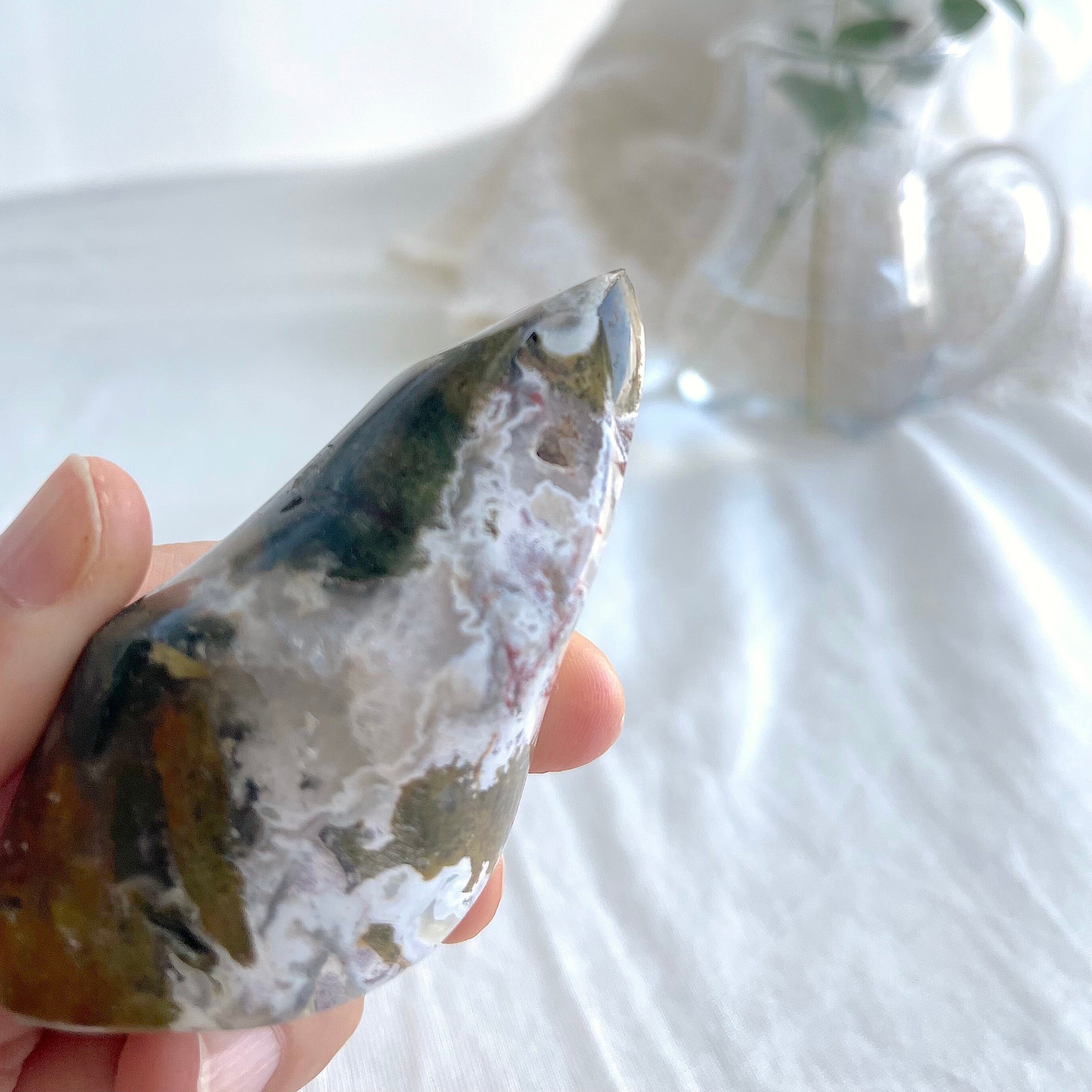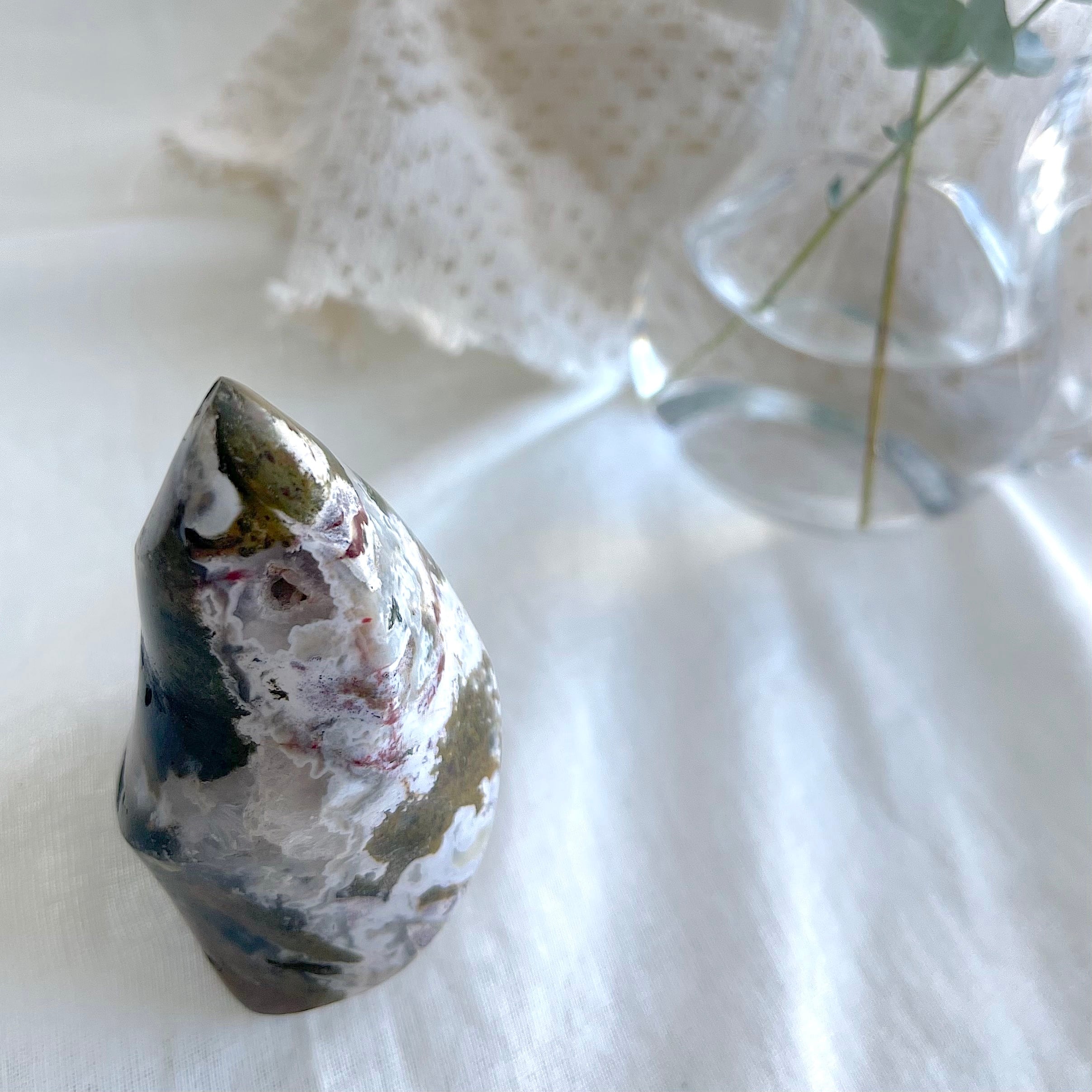 まるで潮風に磨かれた海辺の断片のように、柔らかな曲線と豊かな色彩が溶け合う、オーシャンジャスパーのフレイム。