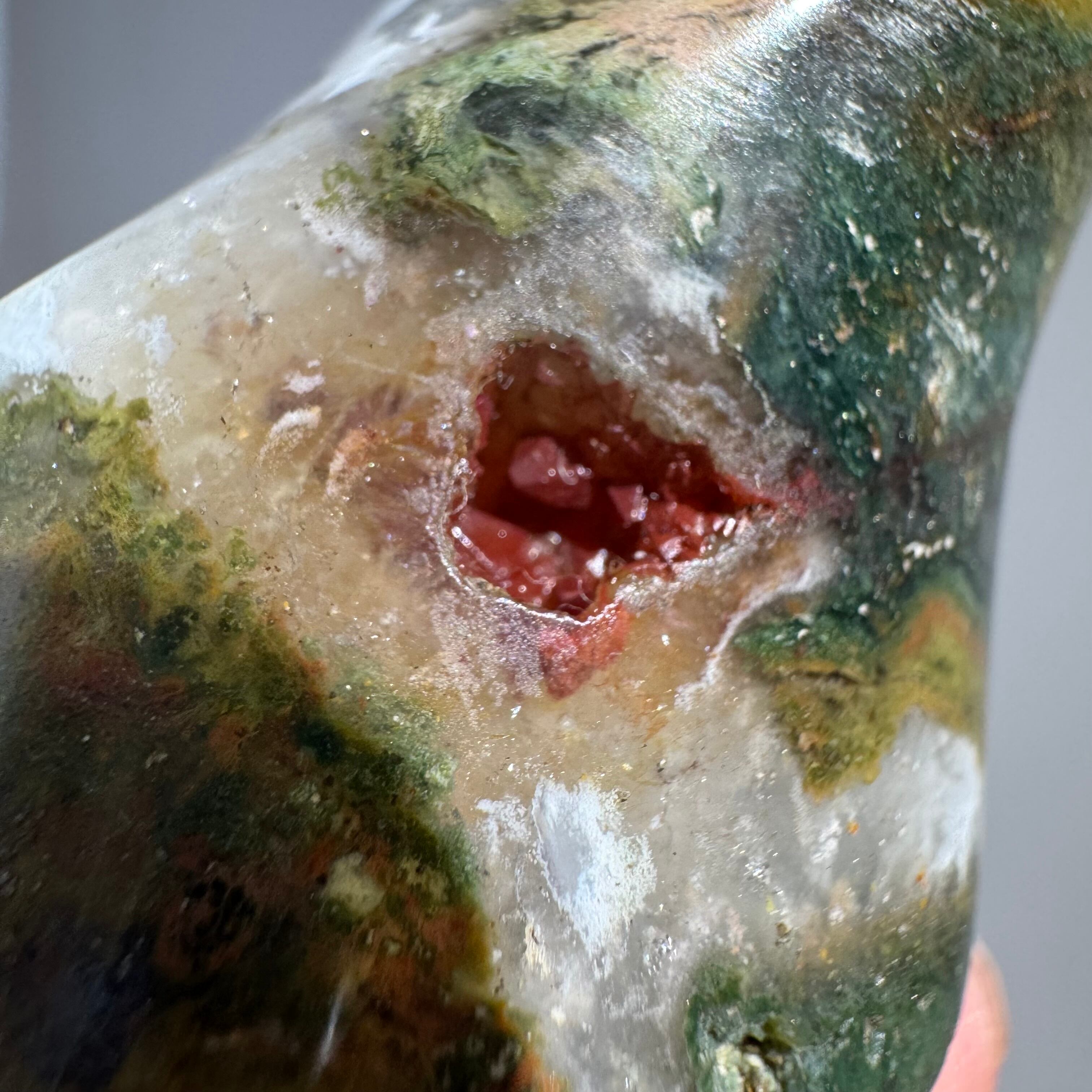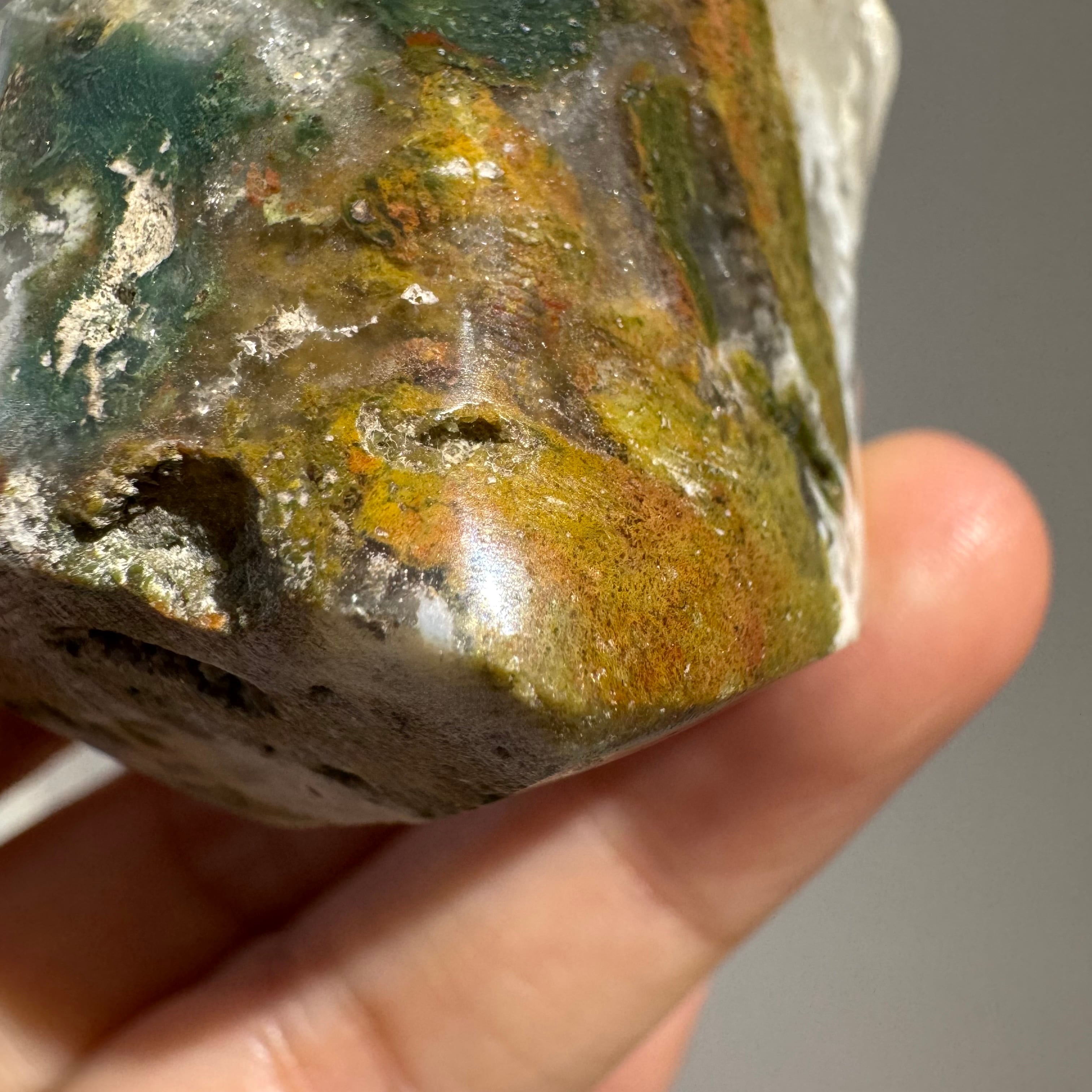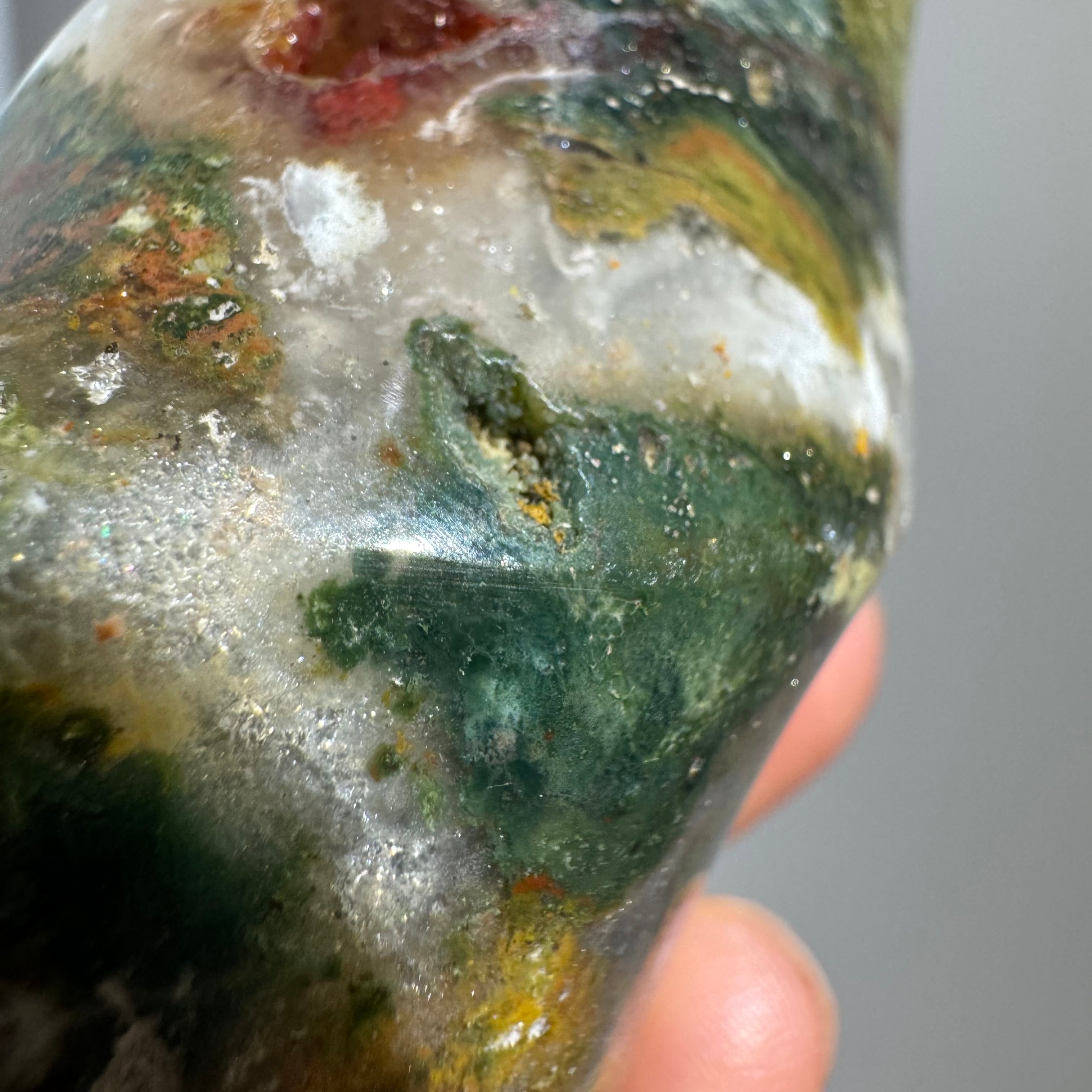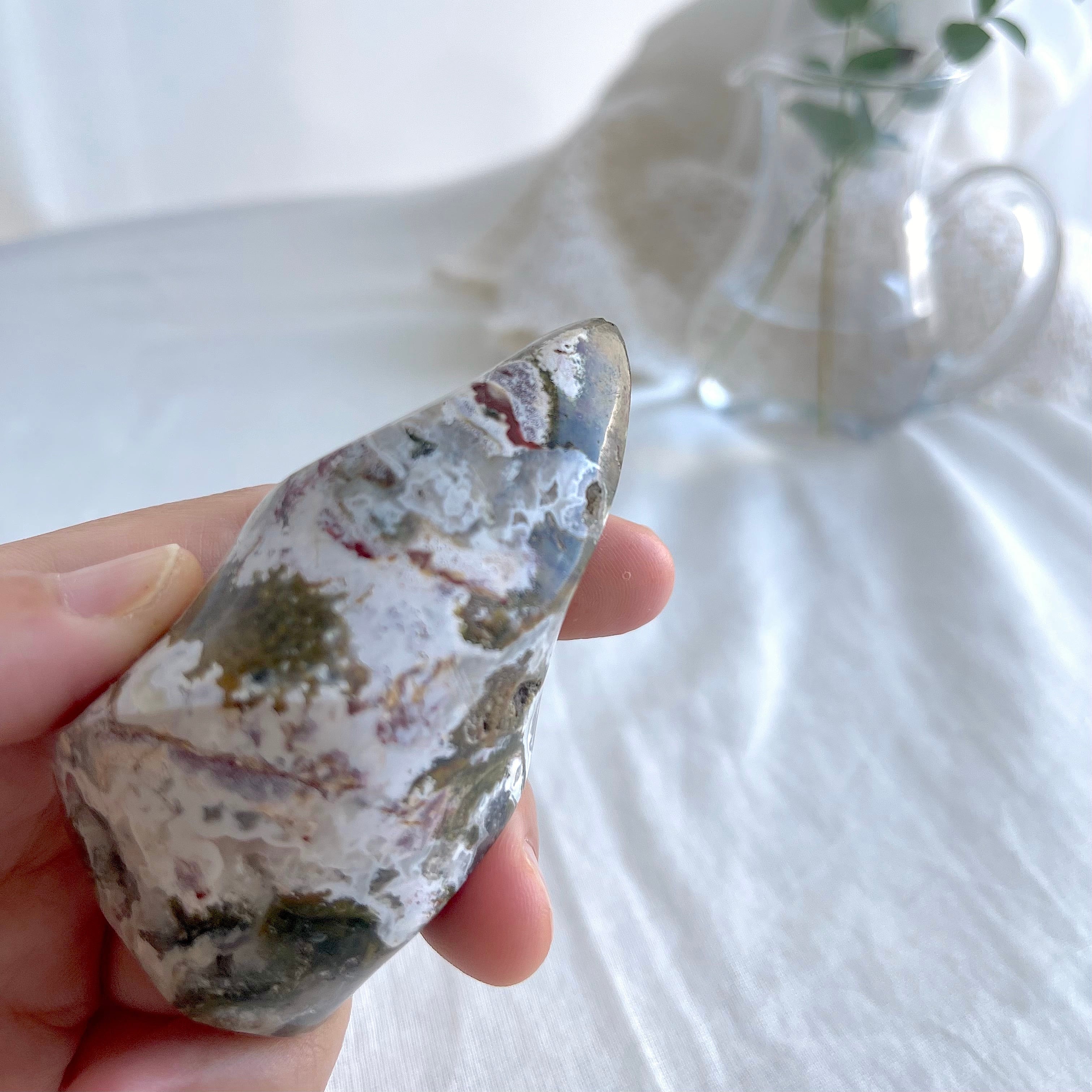 まるで潮風に磨かれた海辺の断片のように、柔らかな曲線と豊かな色彩が溶け合う、オーシャンジャスパーのフレイム。