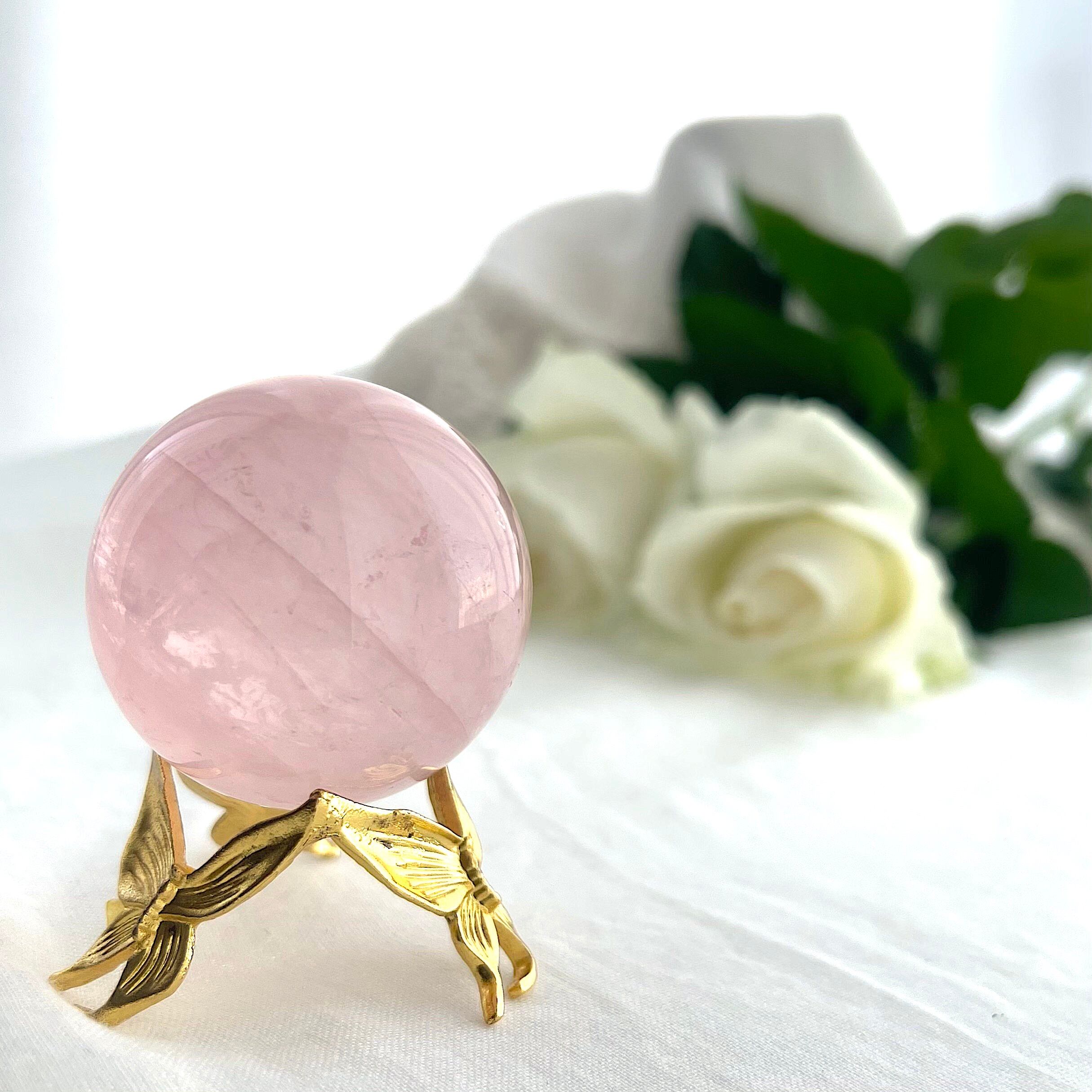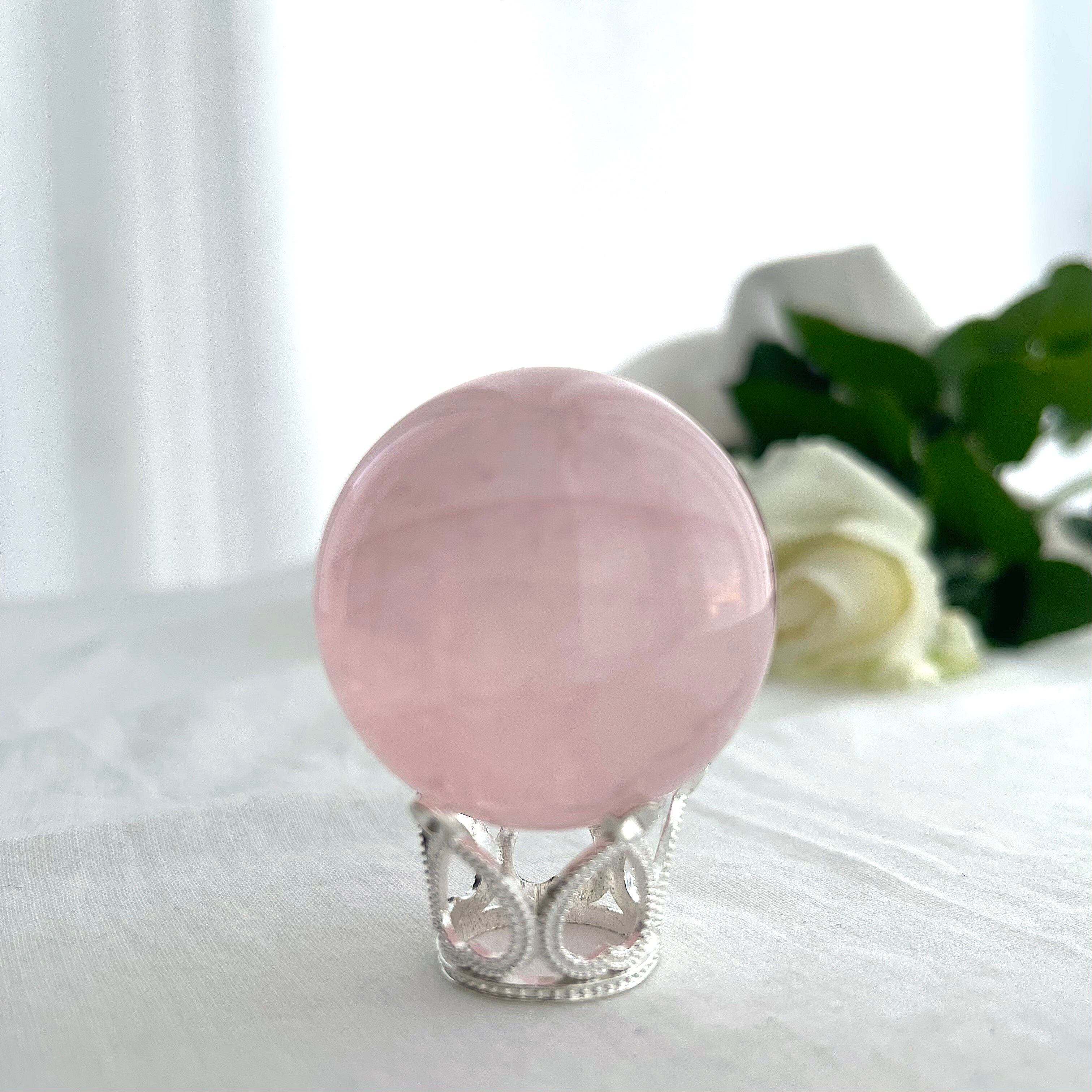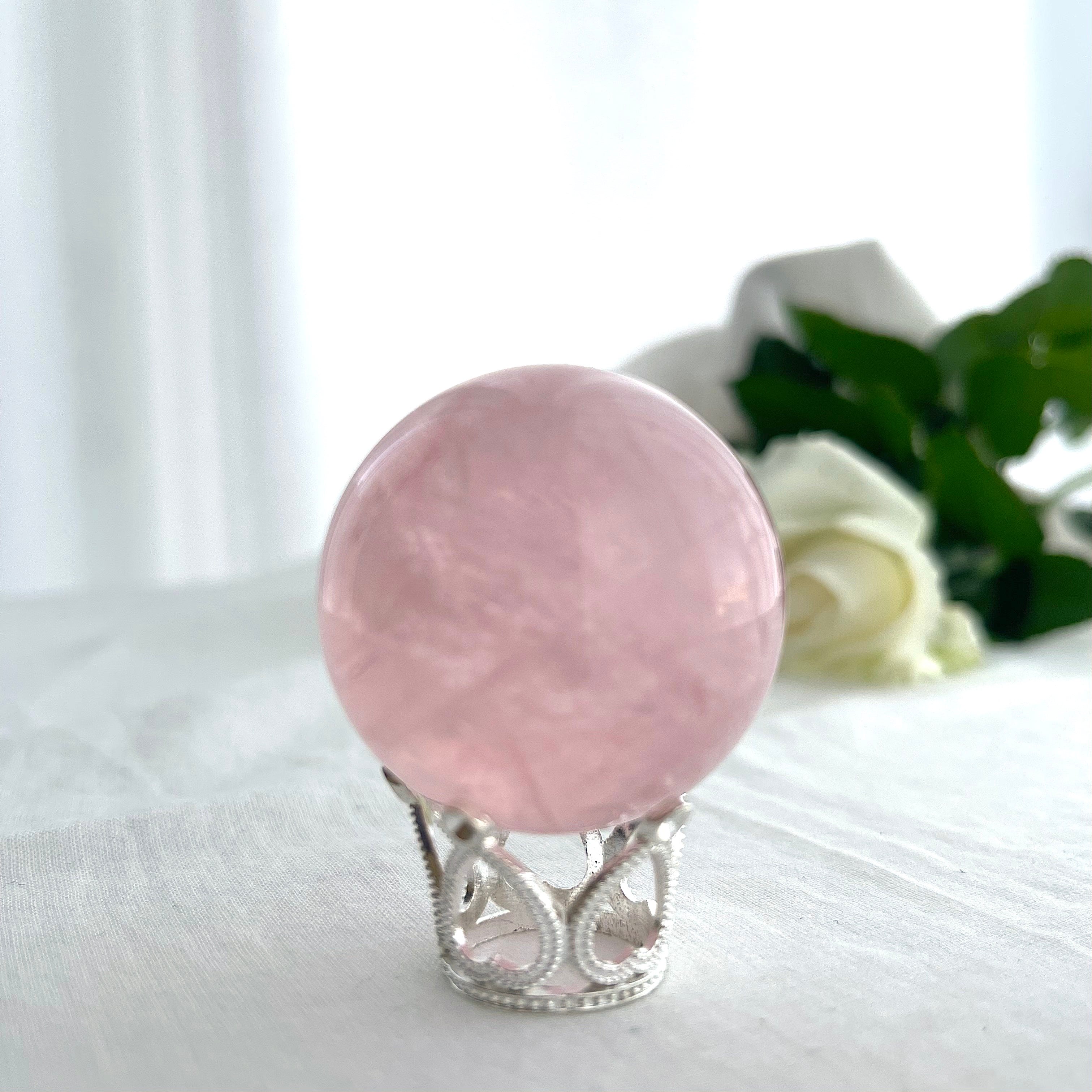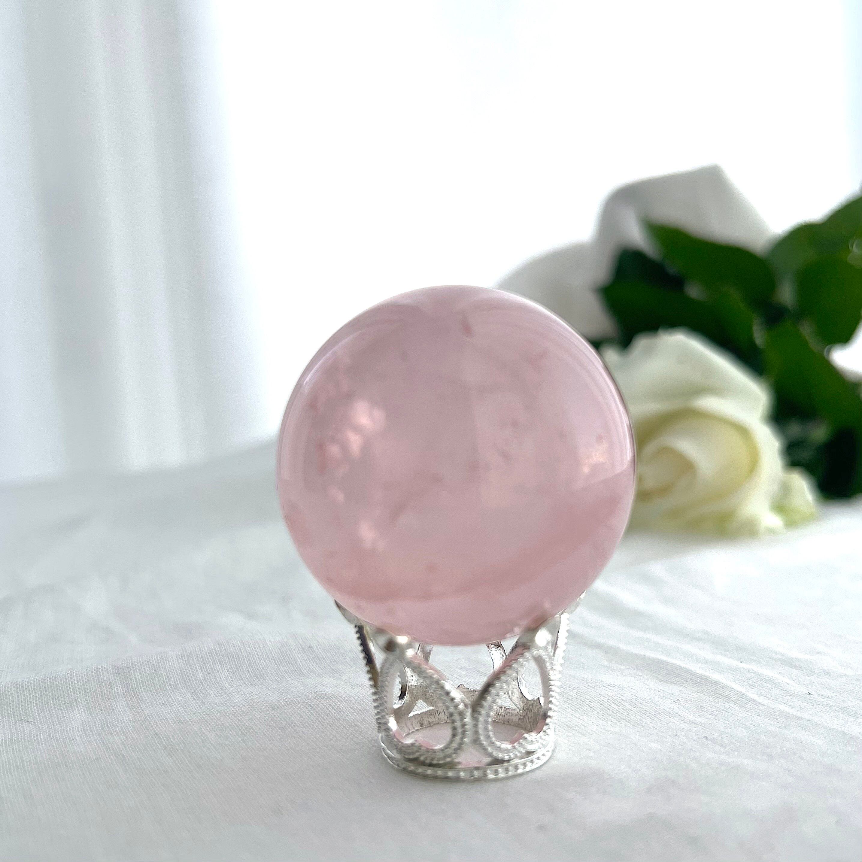 淡くやさしいピンクの中に、霧がかったようなインクルージョンが浮かぶ、詩的な美しさをたたえたスターローズクォーツのスフィア。