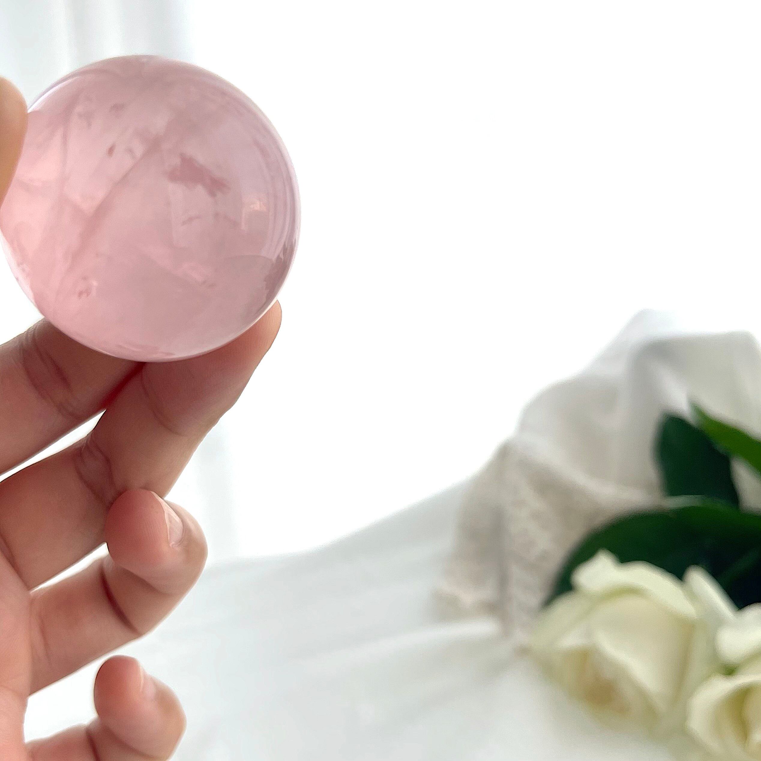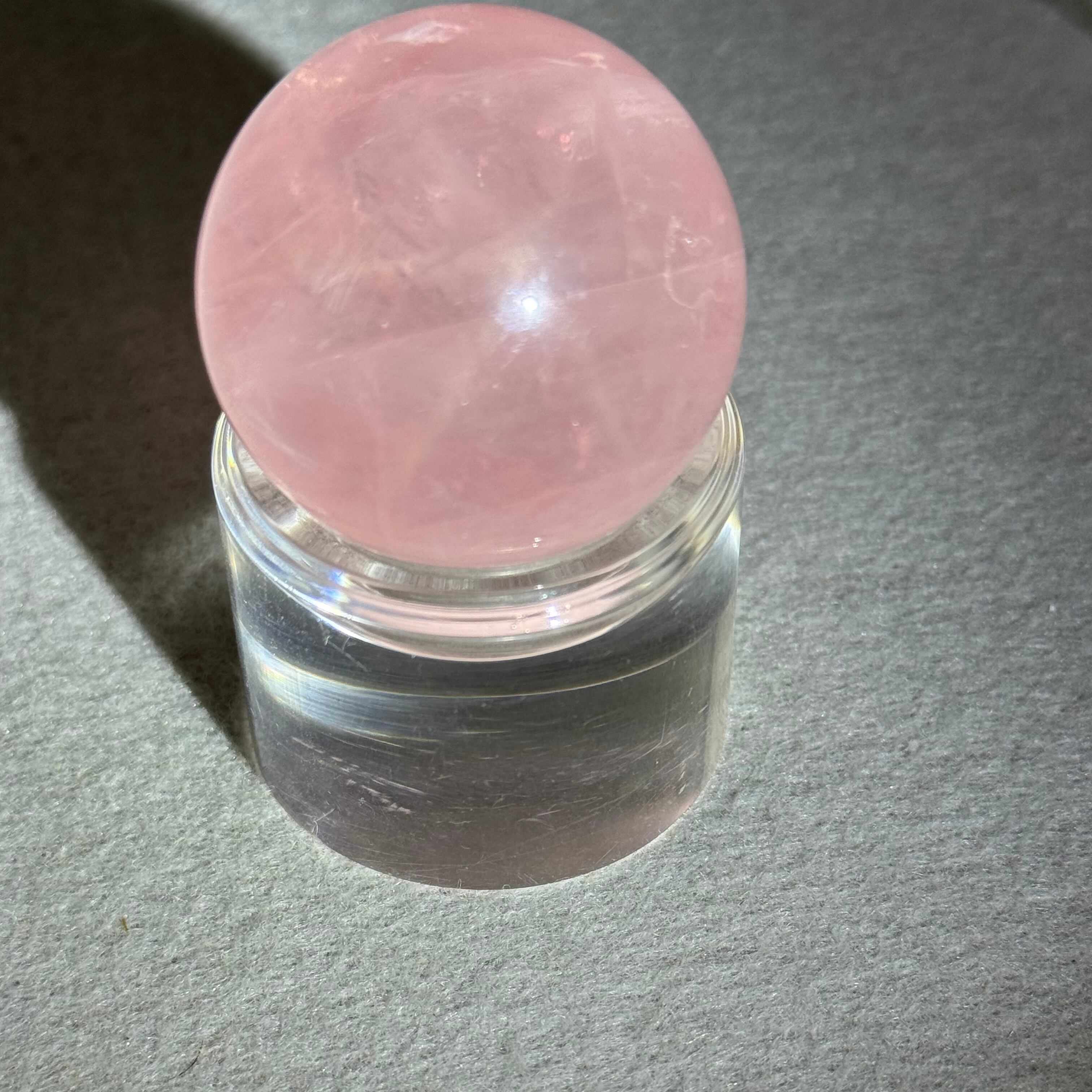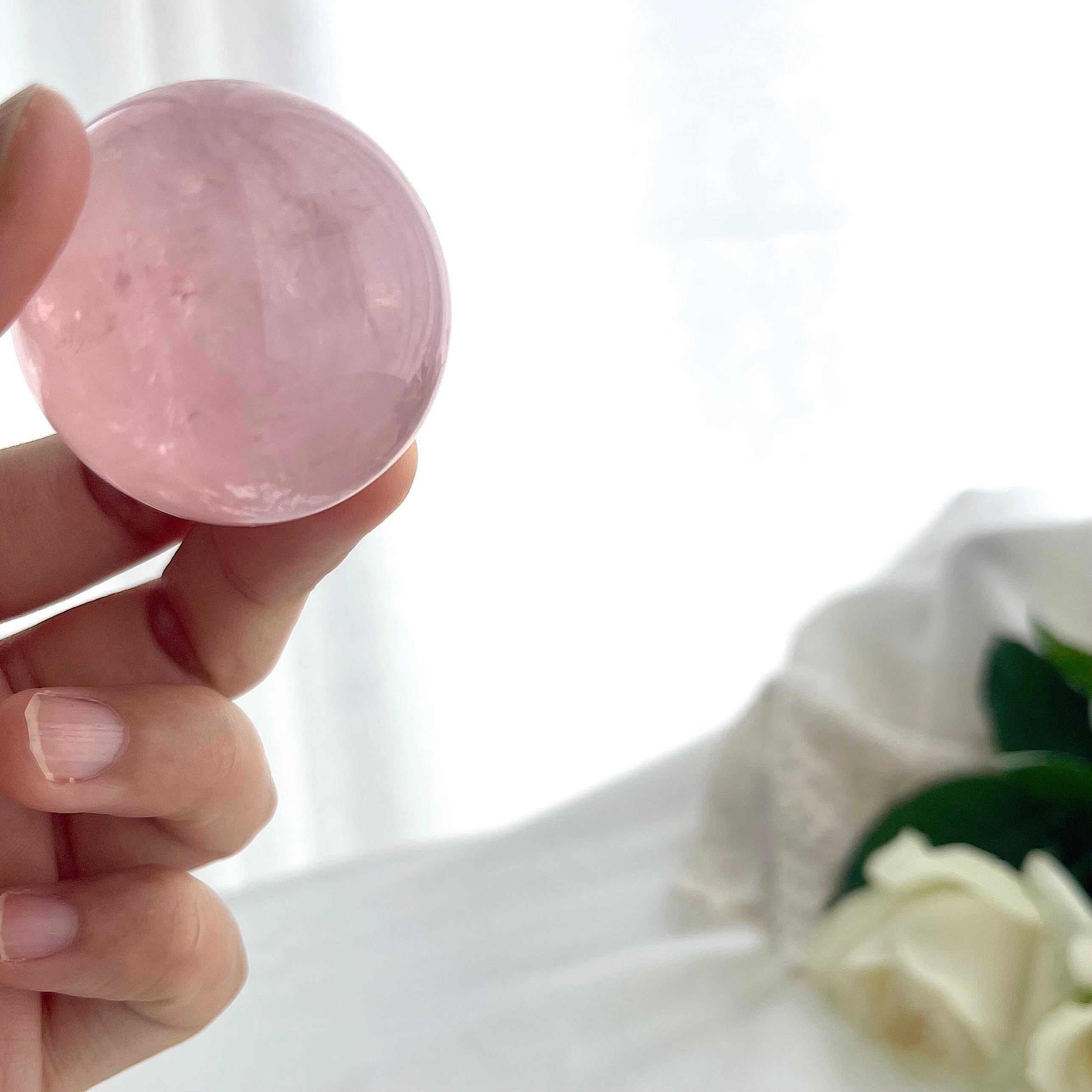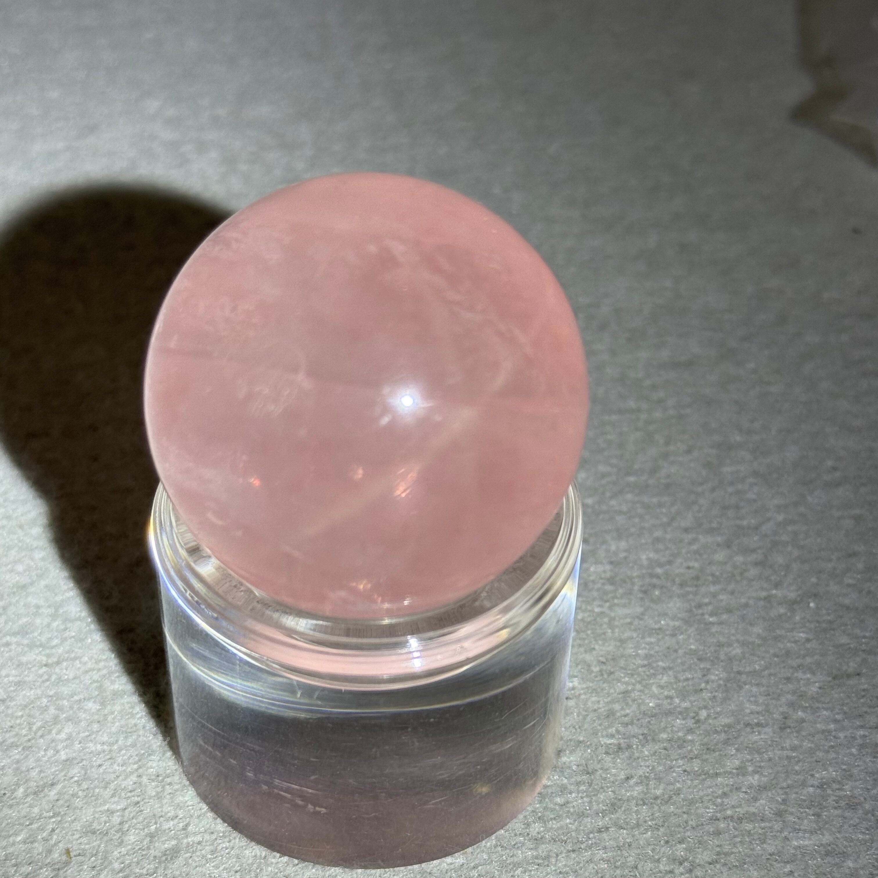 淡くやさしいピンクの中に、霧がかったようなインクルージョンが浮かぶ、詩的な美しさをたたえたスターローズクォーツのスフィア。