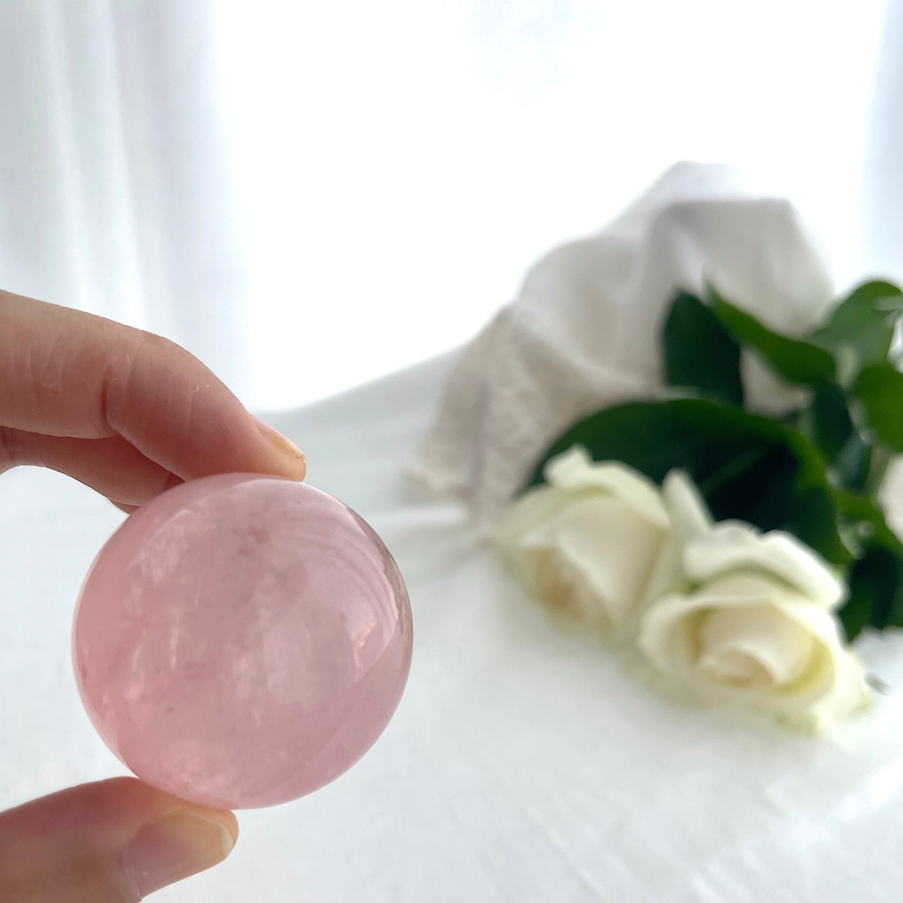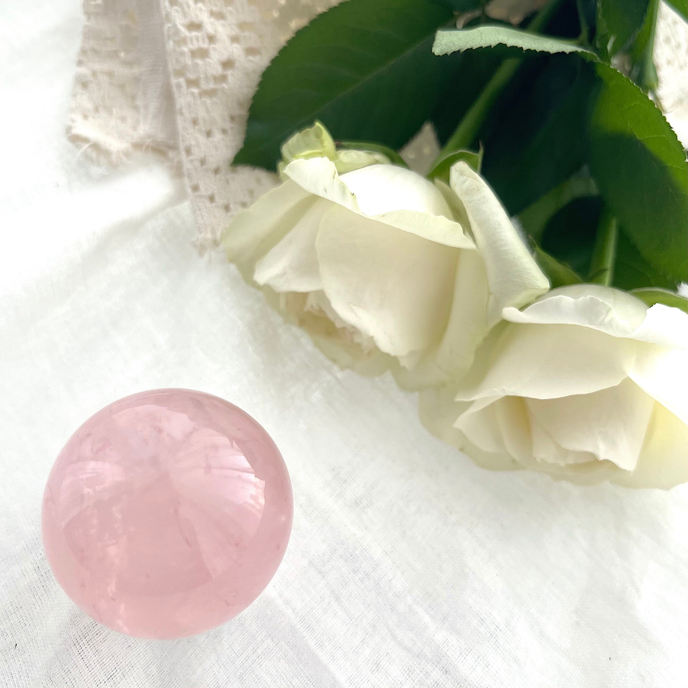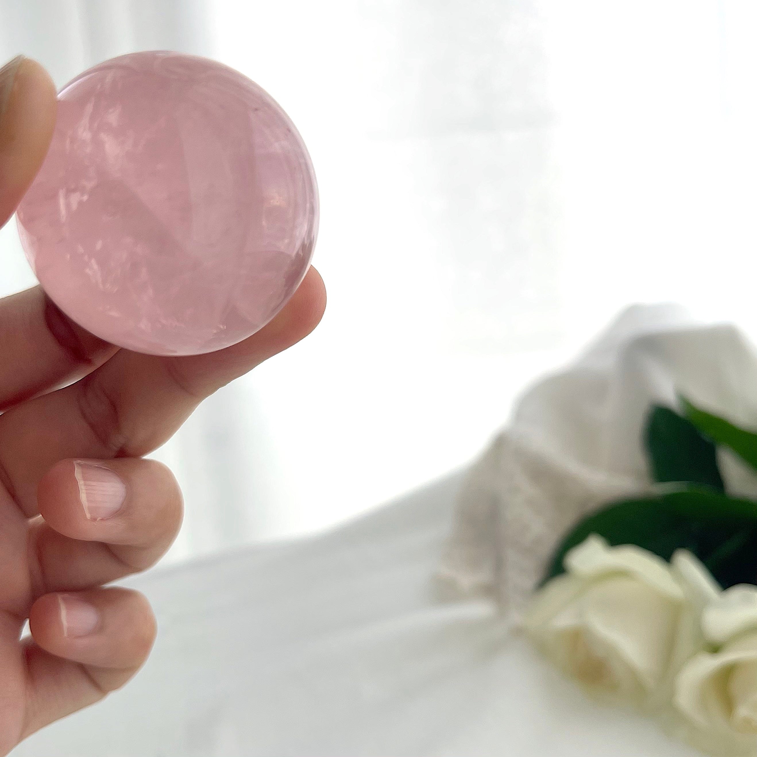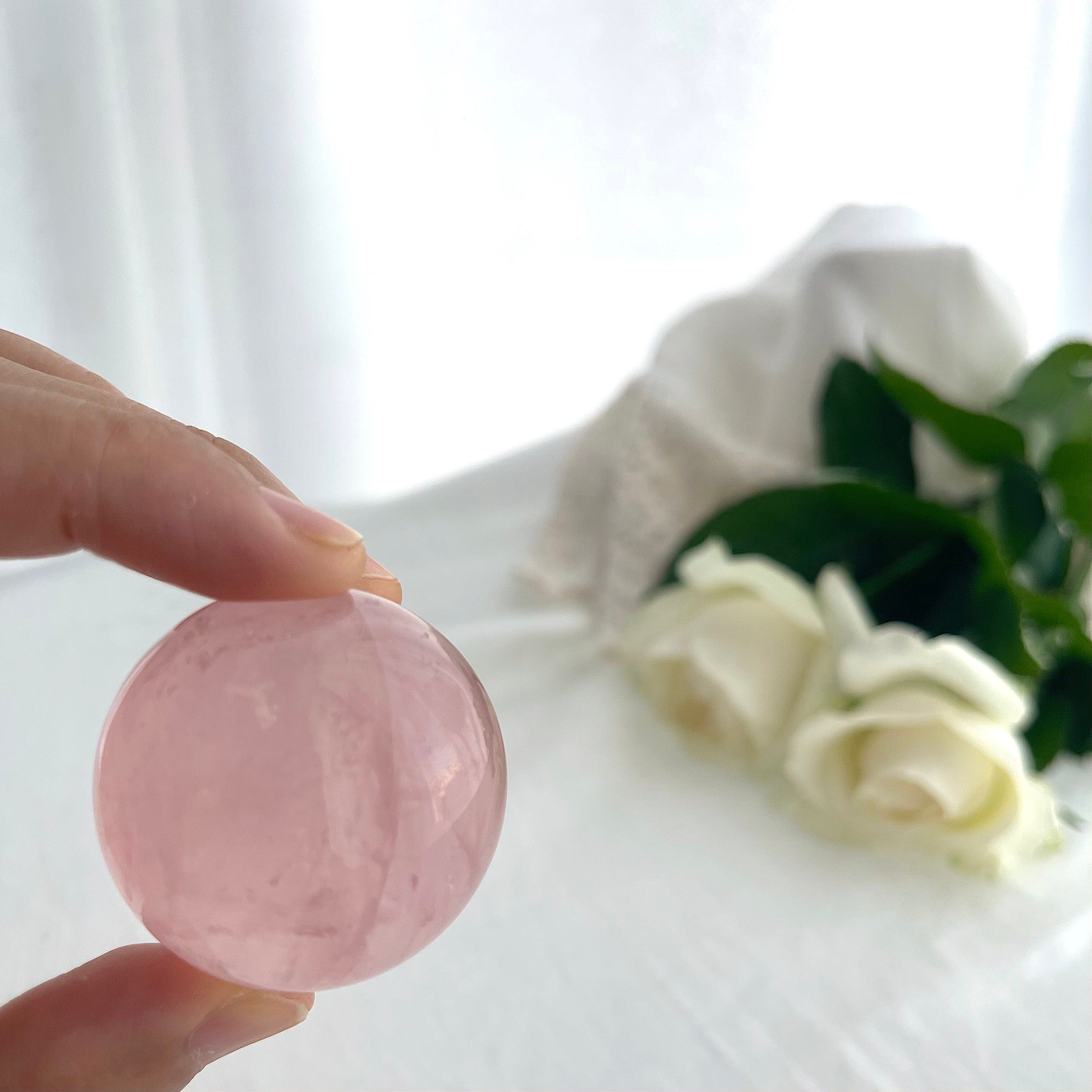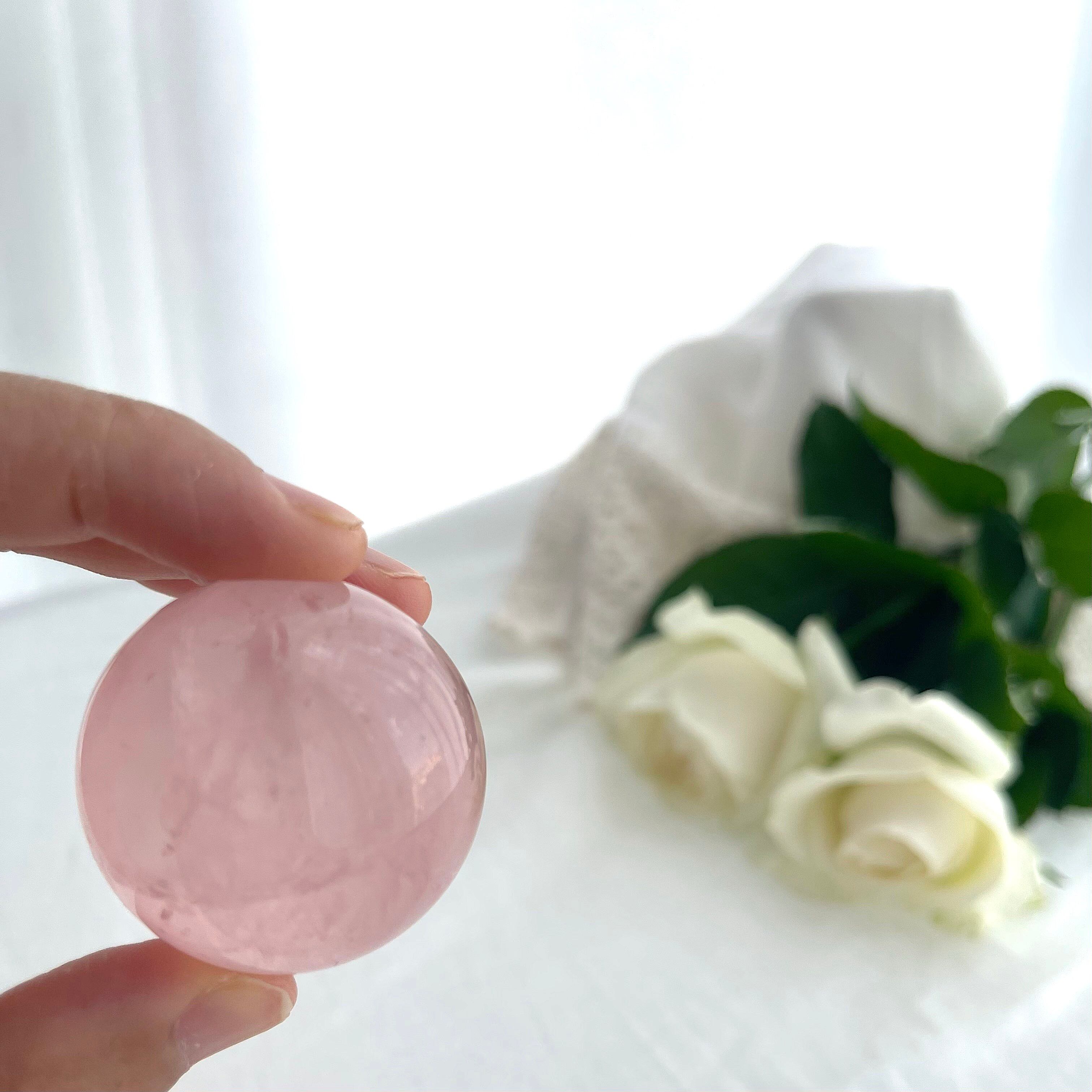 淡くやさしいピンクの中に、霧がかったようなインクルージョンが浮かぶ、詩的な美しさをたたえたスターローズクォーツのスフィア。
