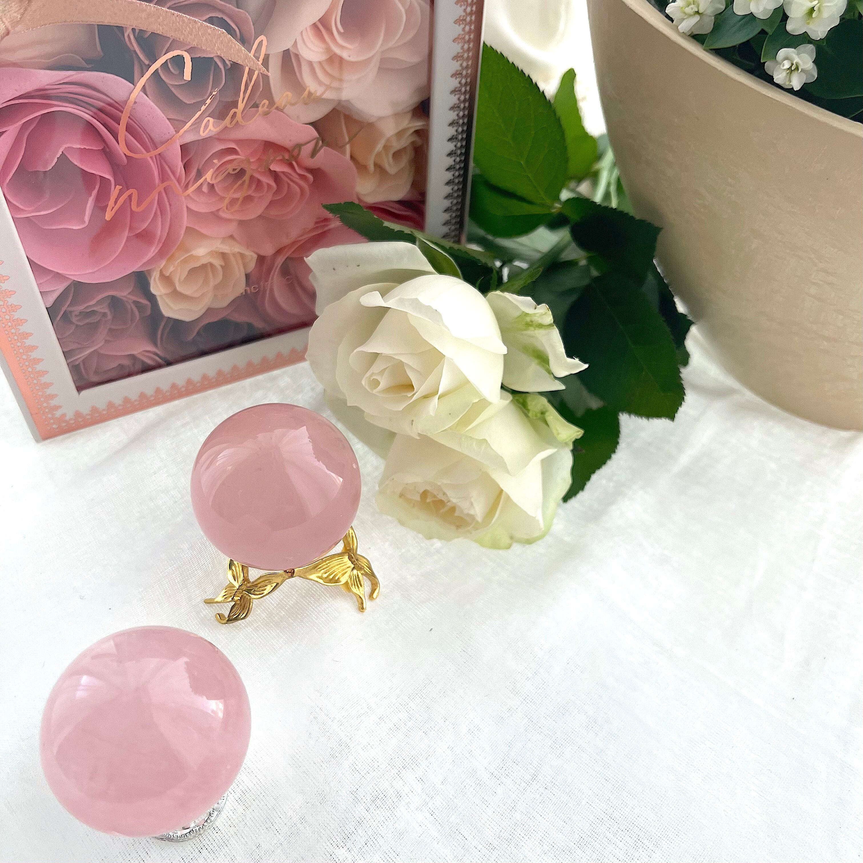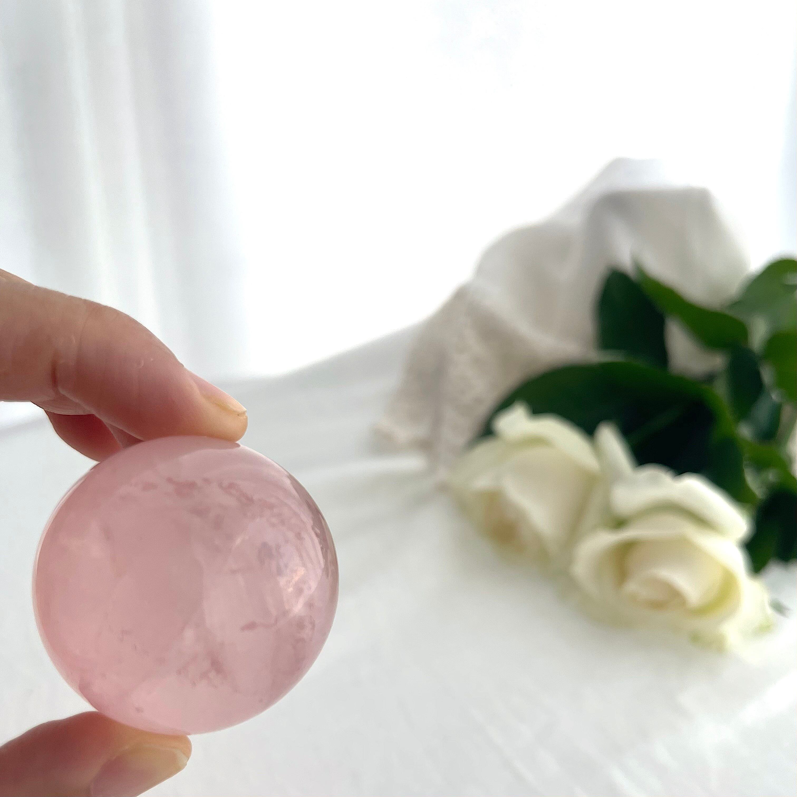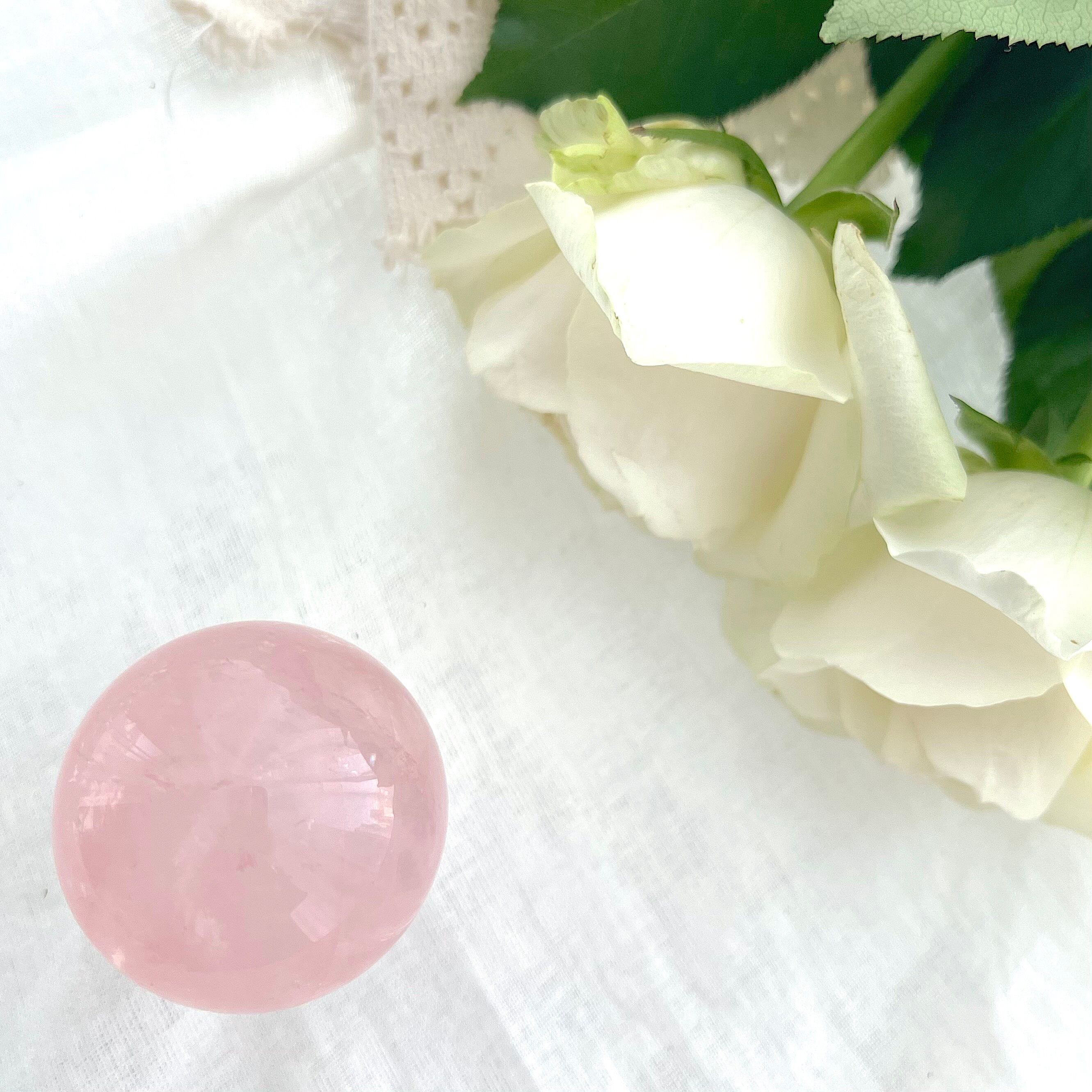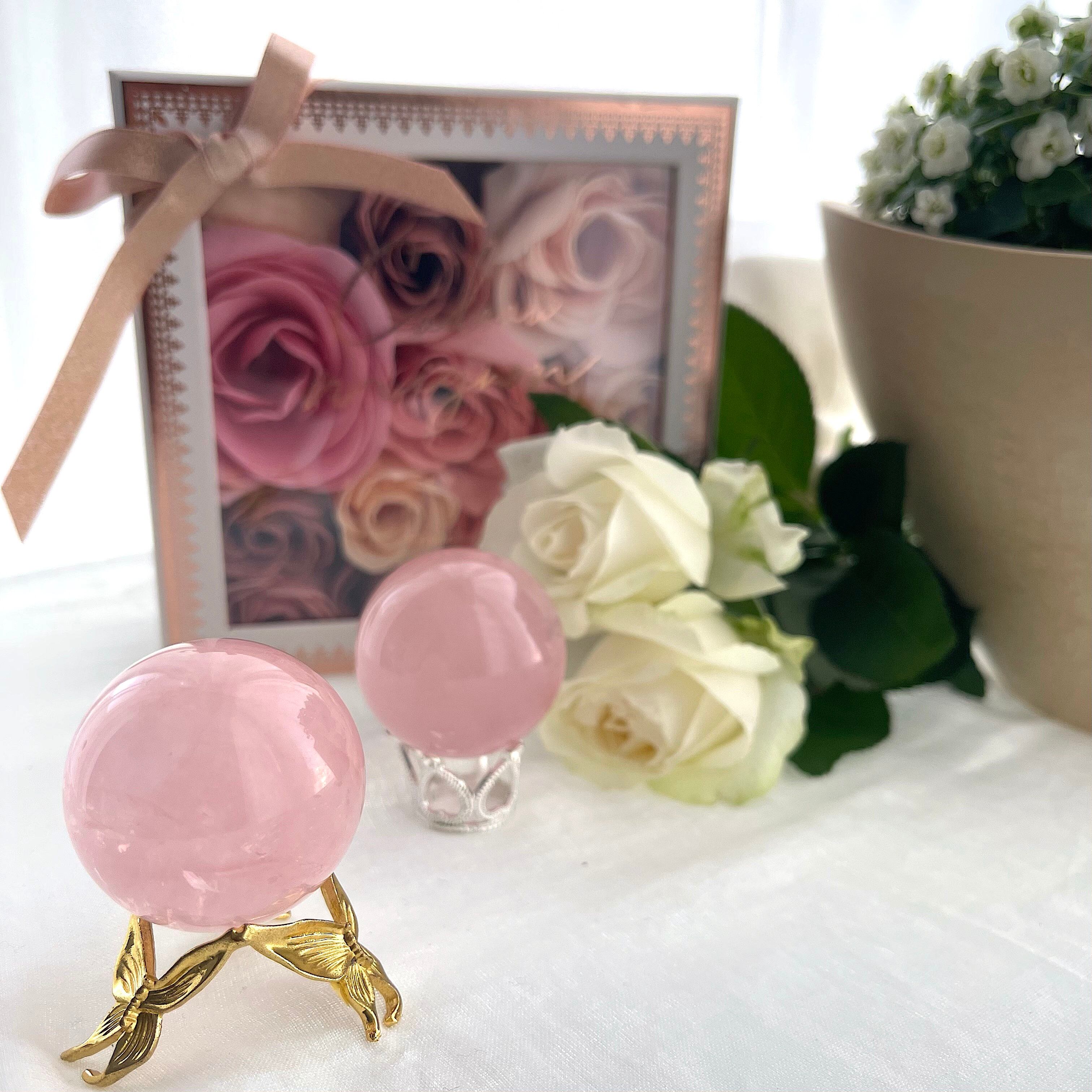 淡くやさしいピンクの中に、霧がかったようなインクルージョンが浮かぶ、詩的な美しさをたたえたスターローズクォーツのスフィア。