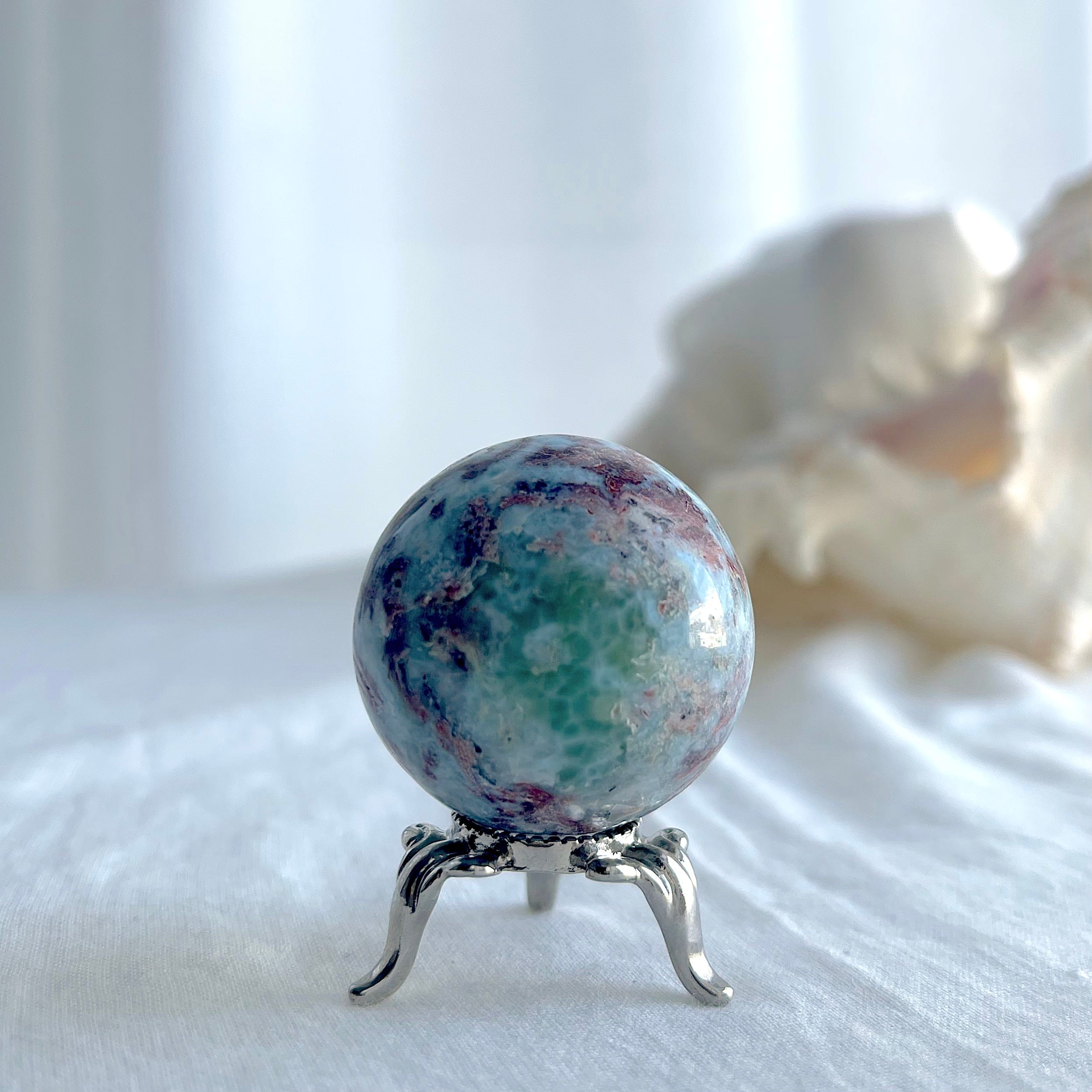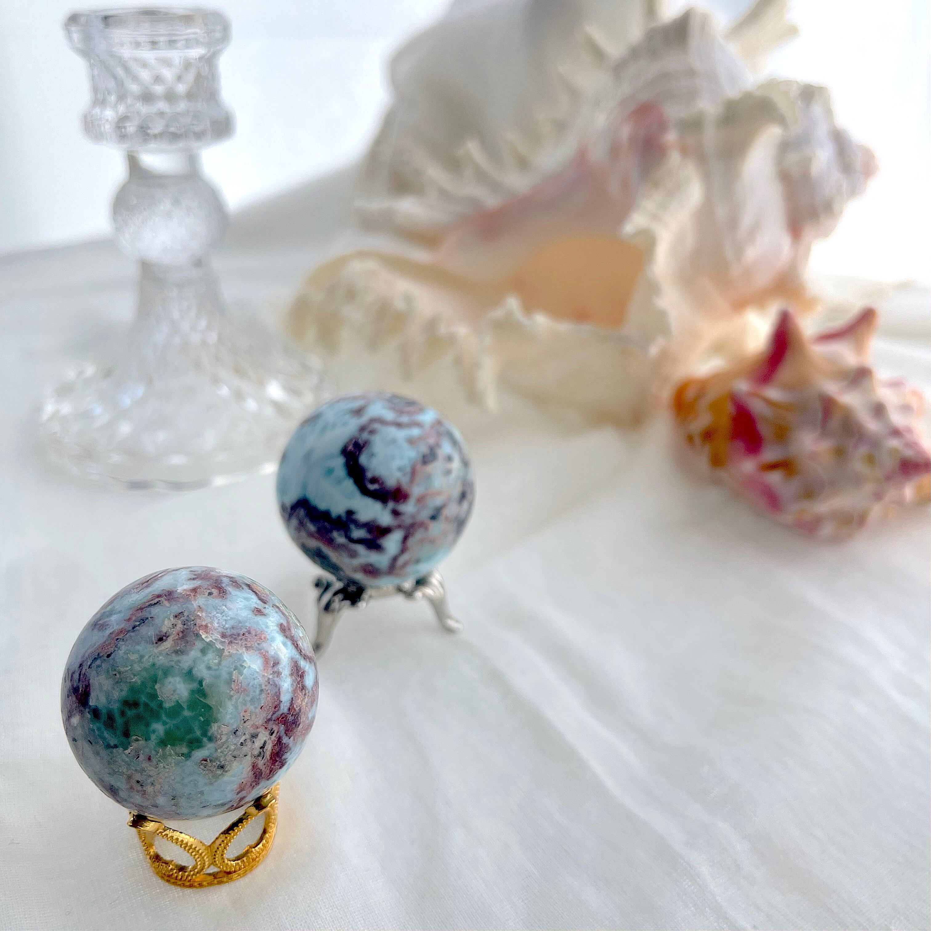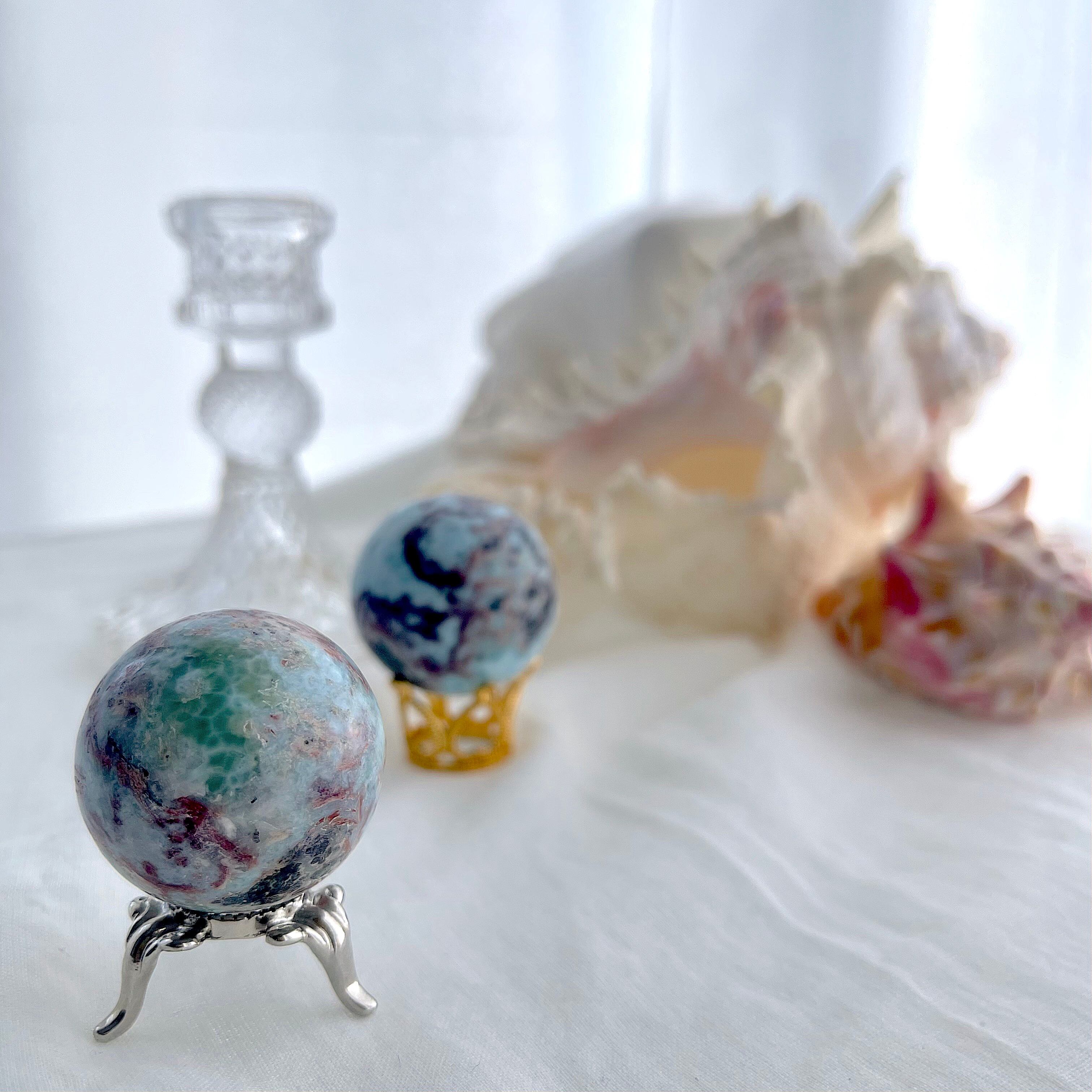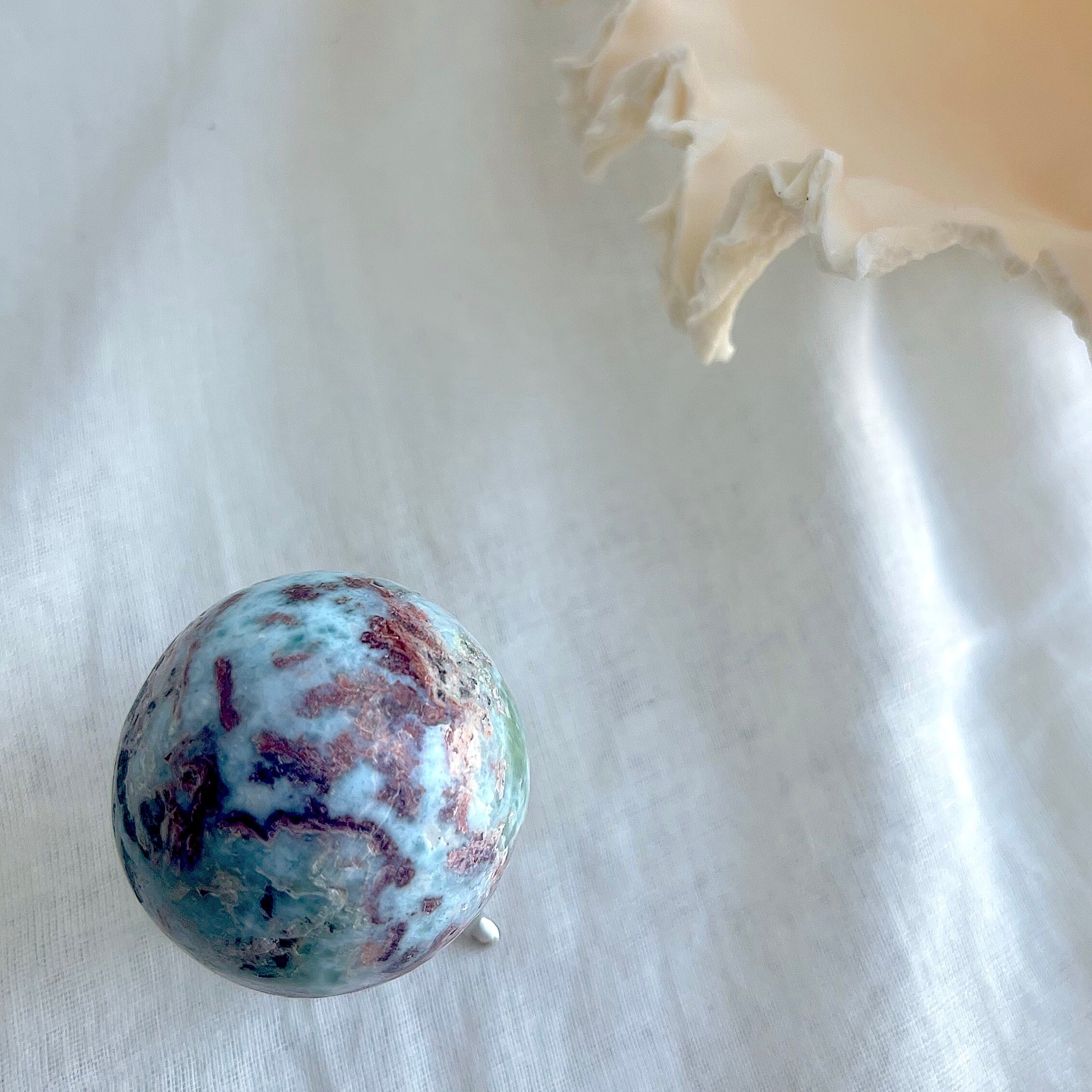 そこにエメラルドグリーンの輝きと、生成色に近い柔らかなニュアンスが加わり、まるで小さな惑星のようなスフィアです。