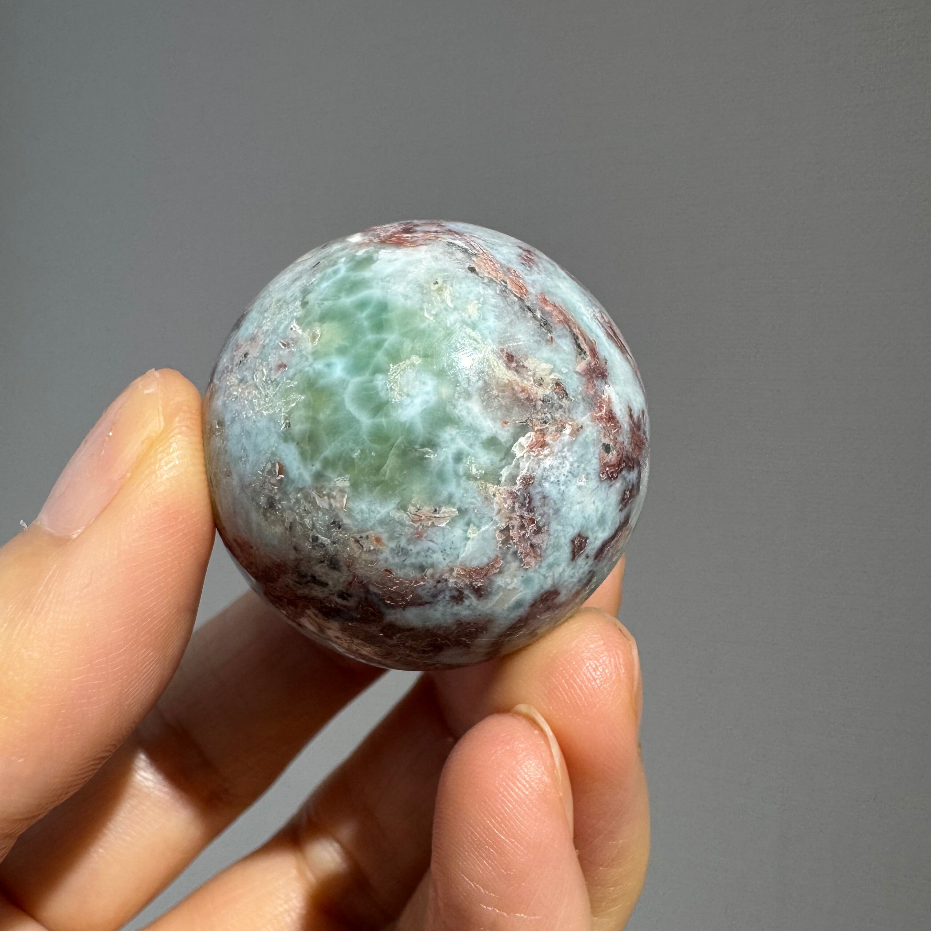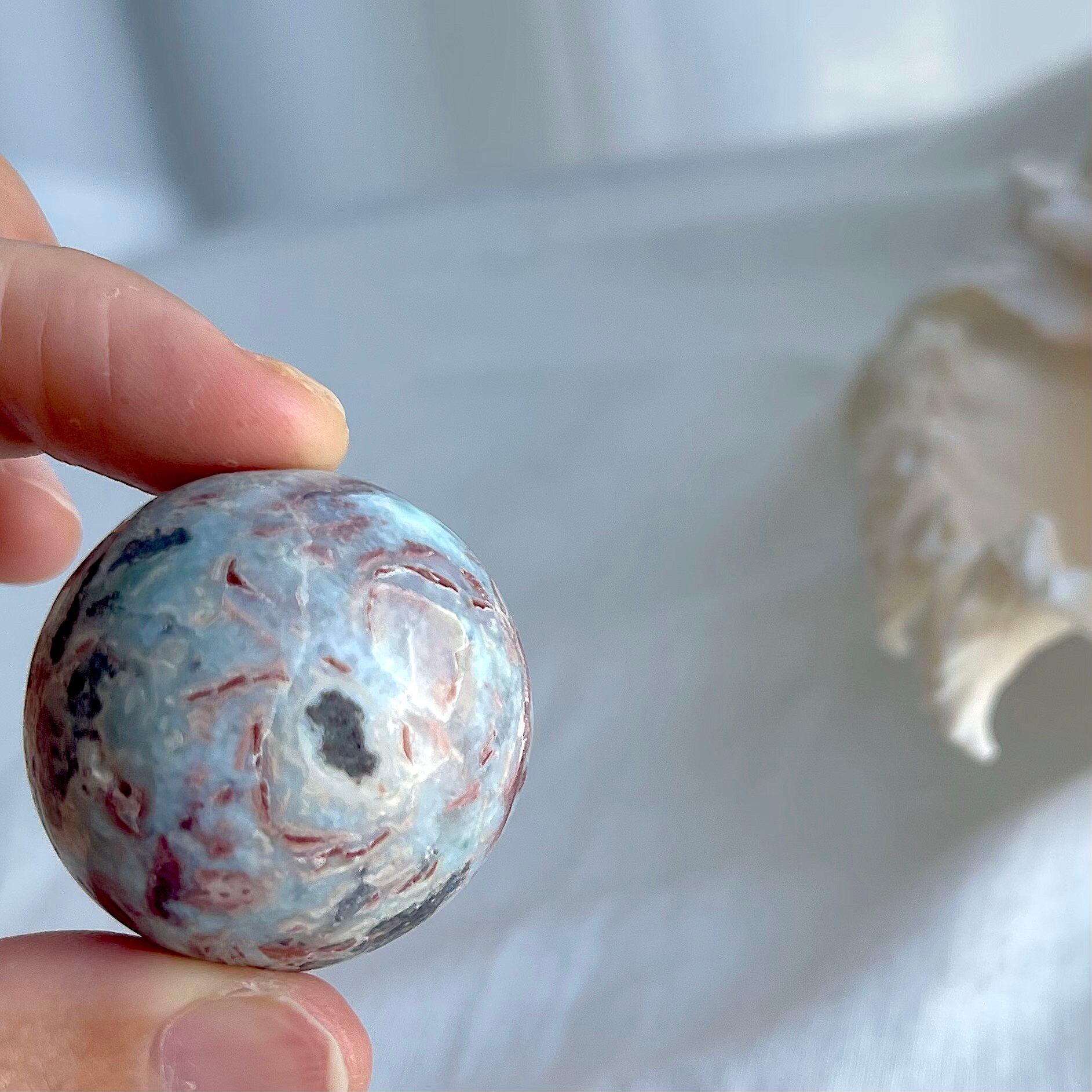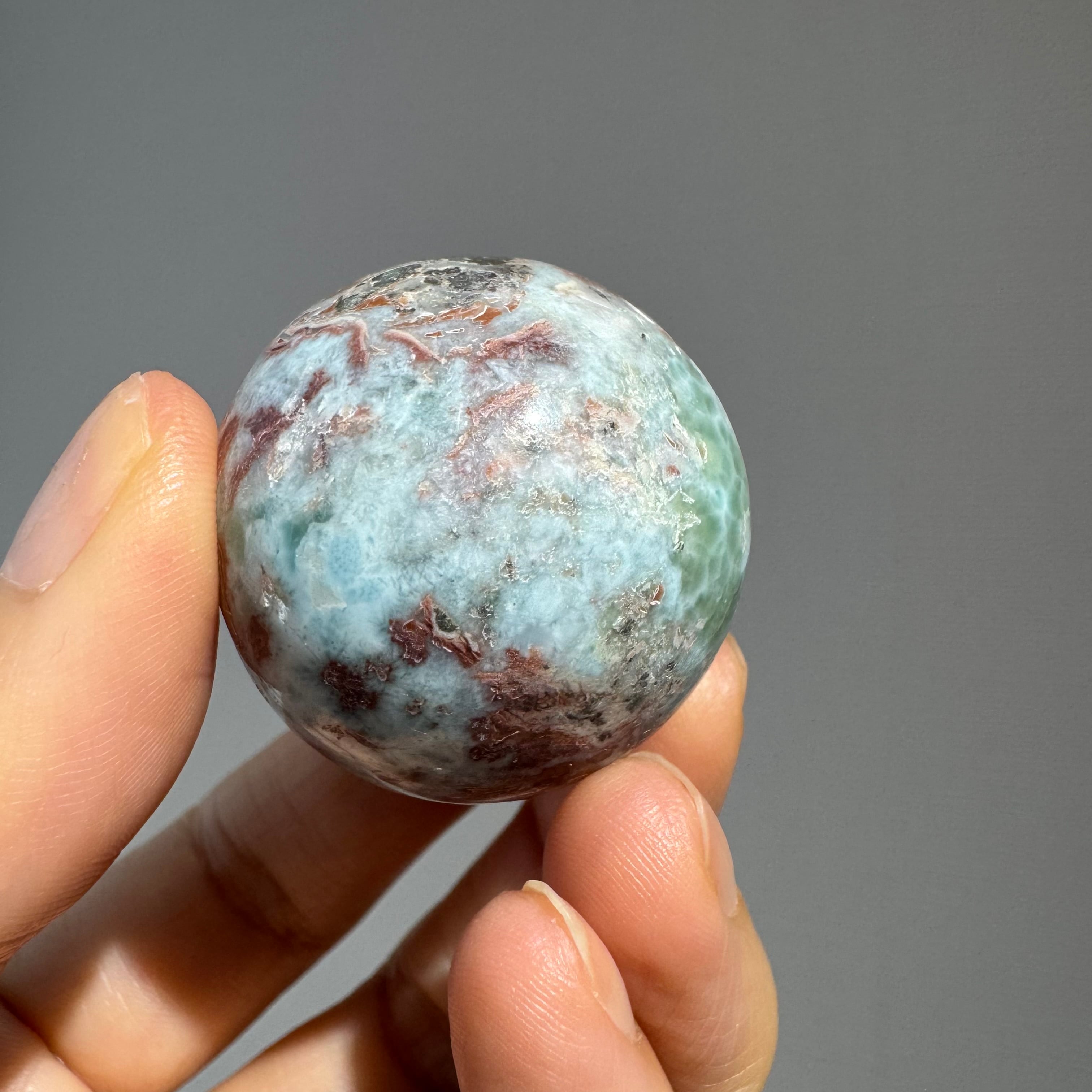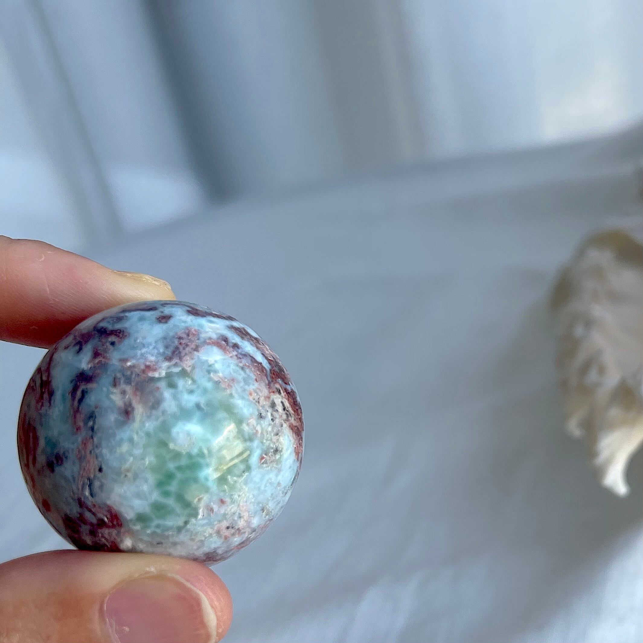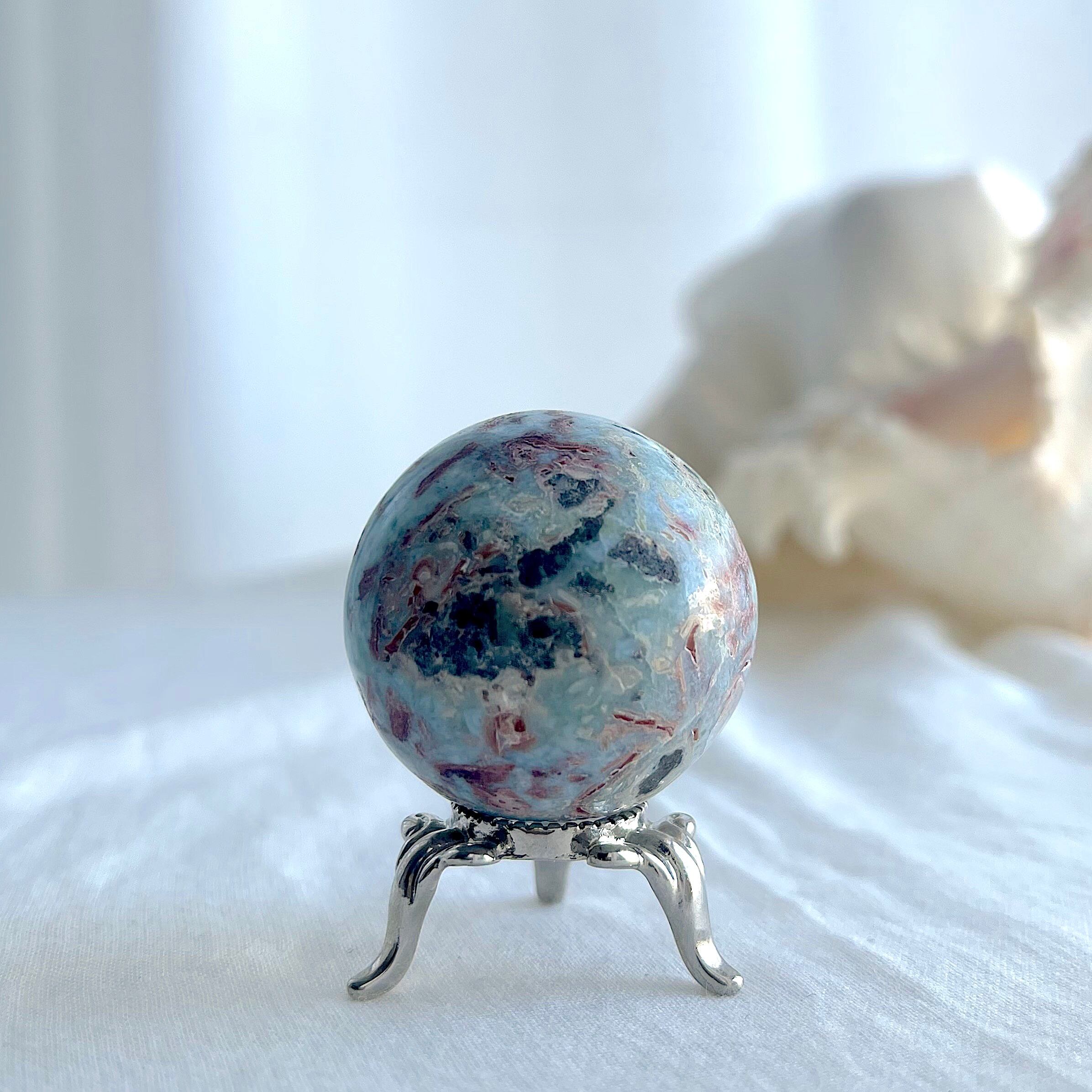 そこにエメラルドグリーンの輝きと、生成色に近い柔らかなニュアンスが加わり、まるで小さな惑星のようなスフィアです。
