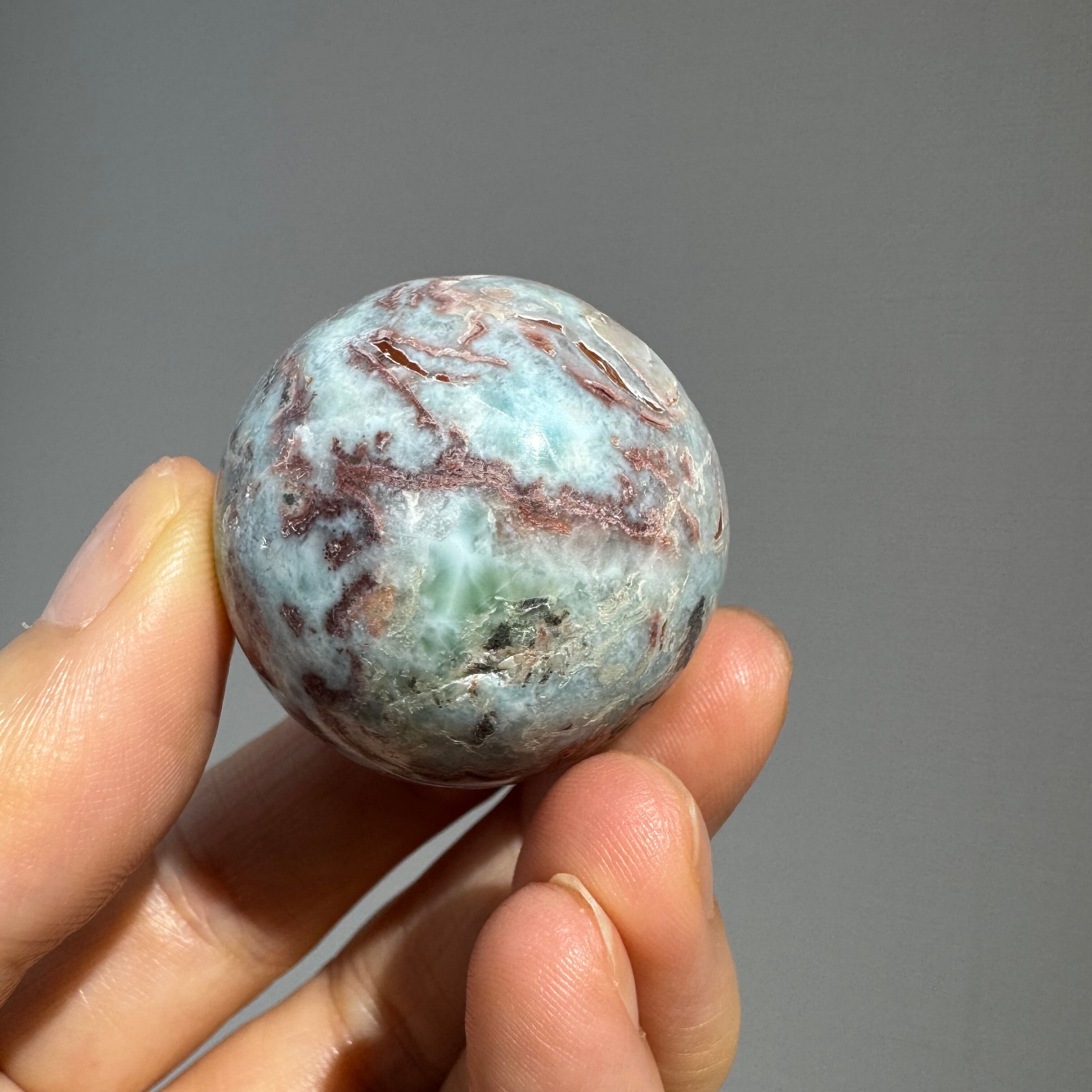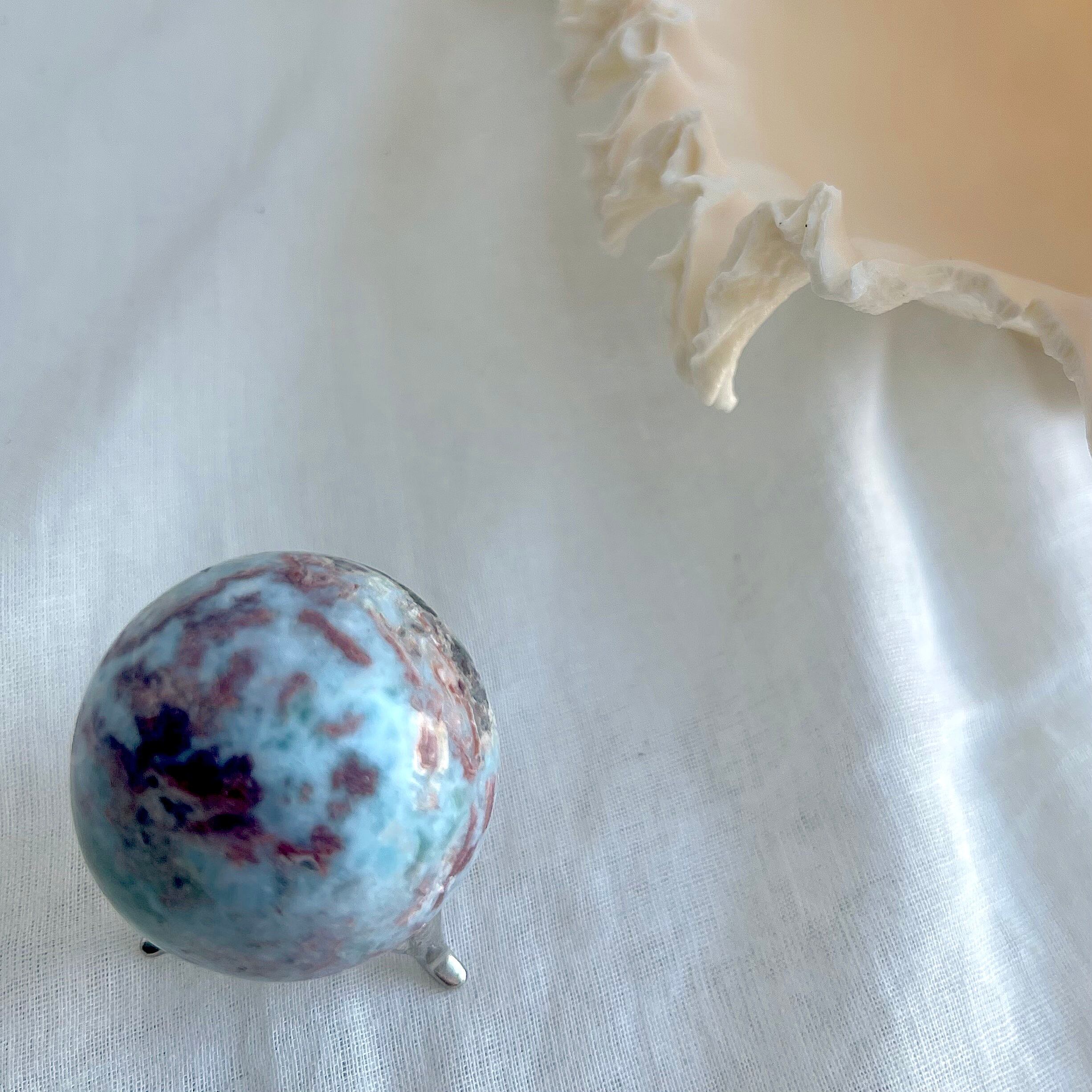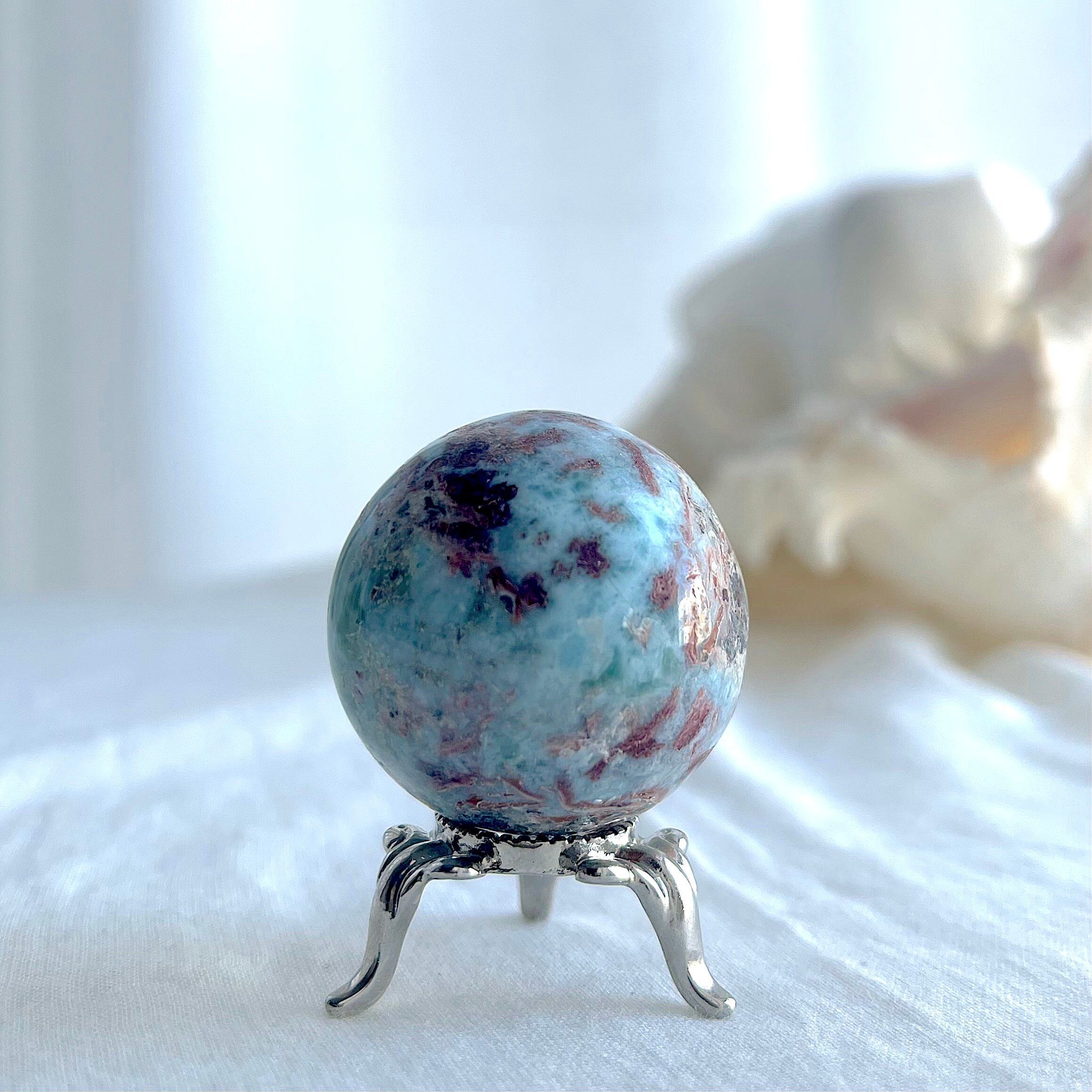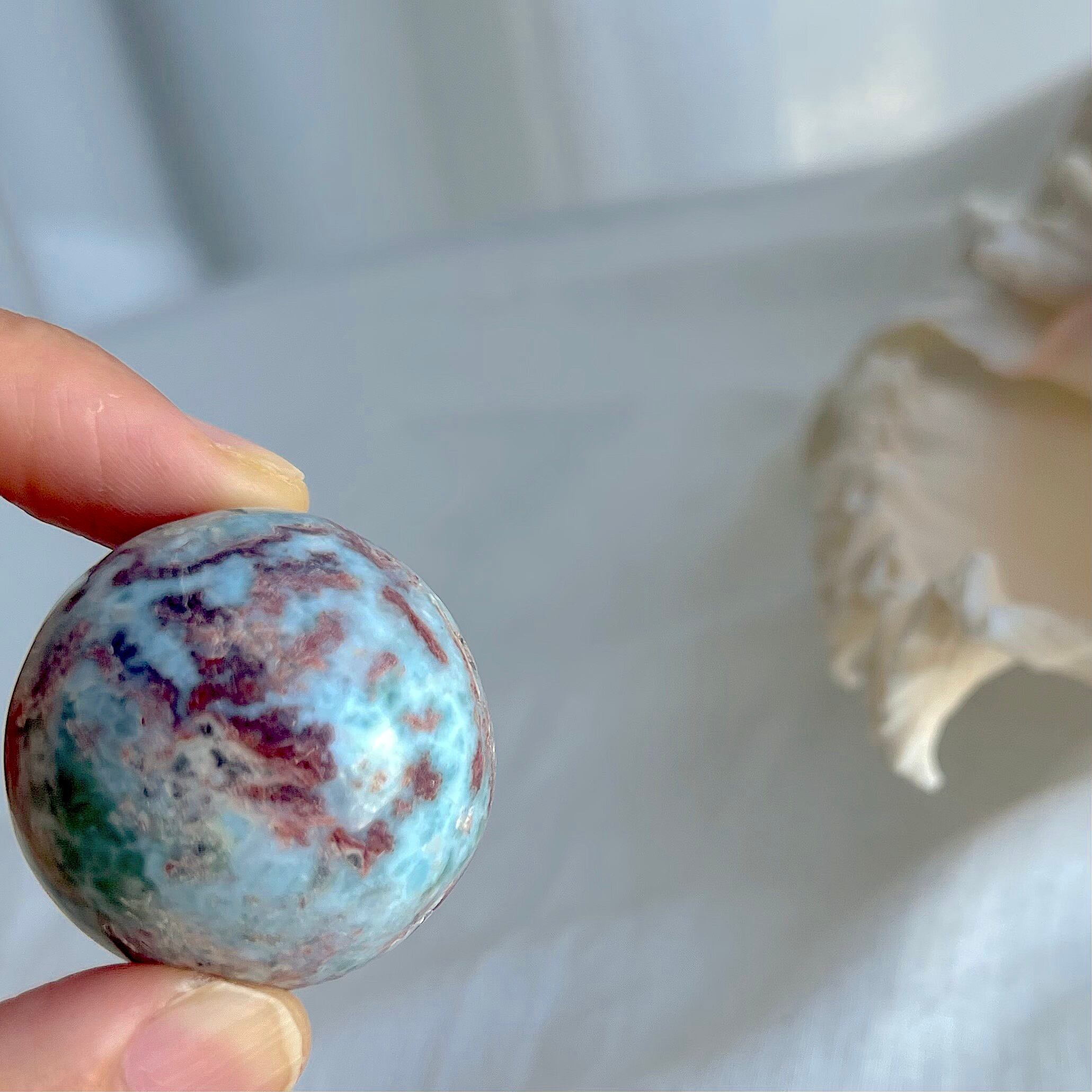 癒しと浄化をもたらすラリマーに、自然のエッセンスを詰め込んだような個体。自分らしいペースを取り戻したいとき、内なる旅に寄り添うような存在としておすすめです。