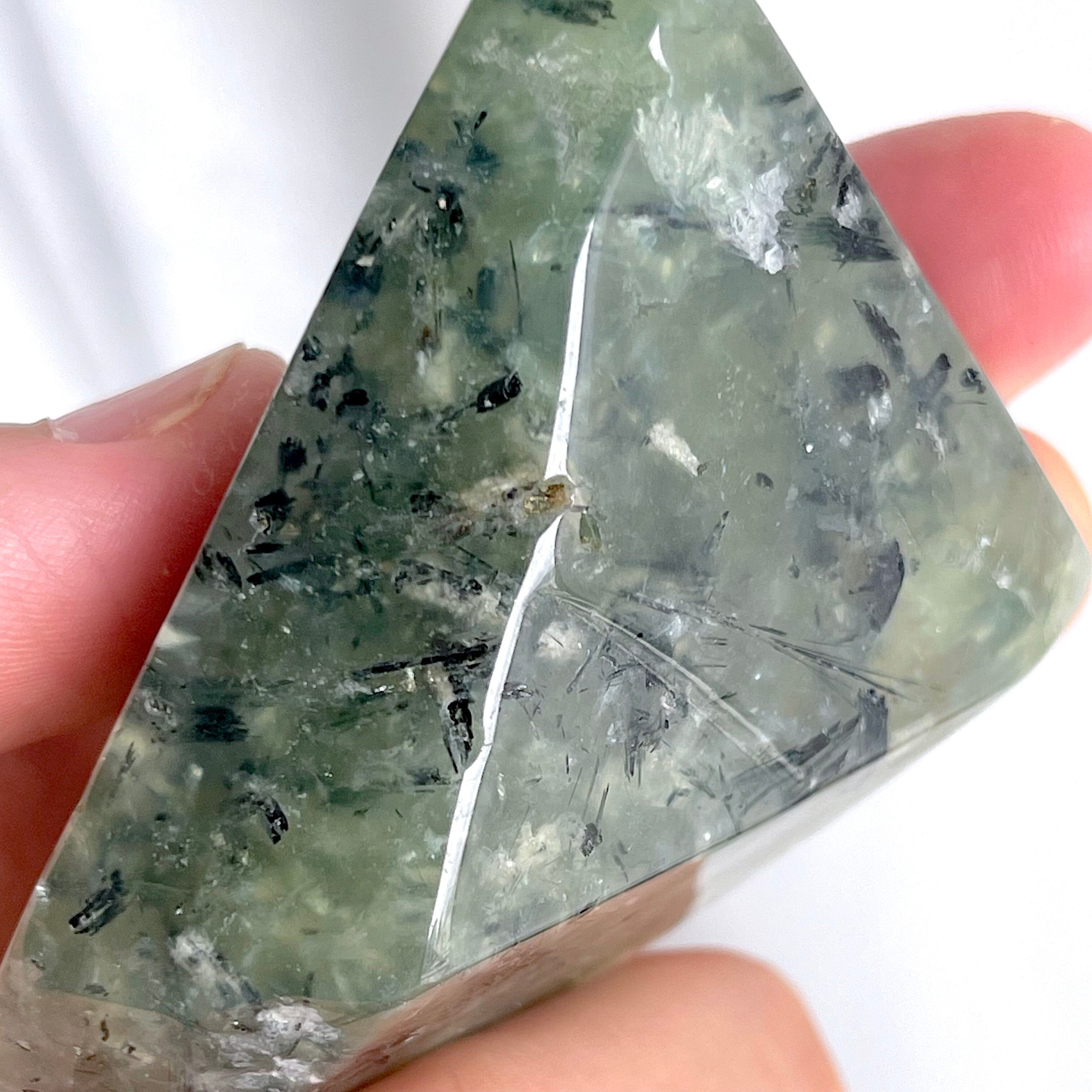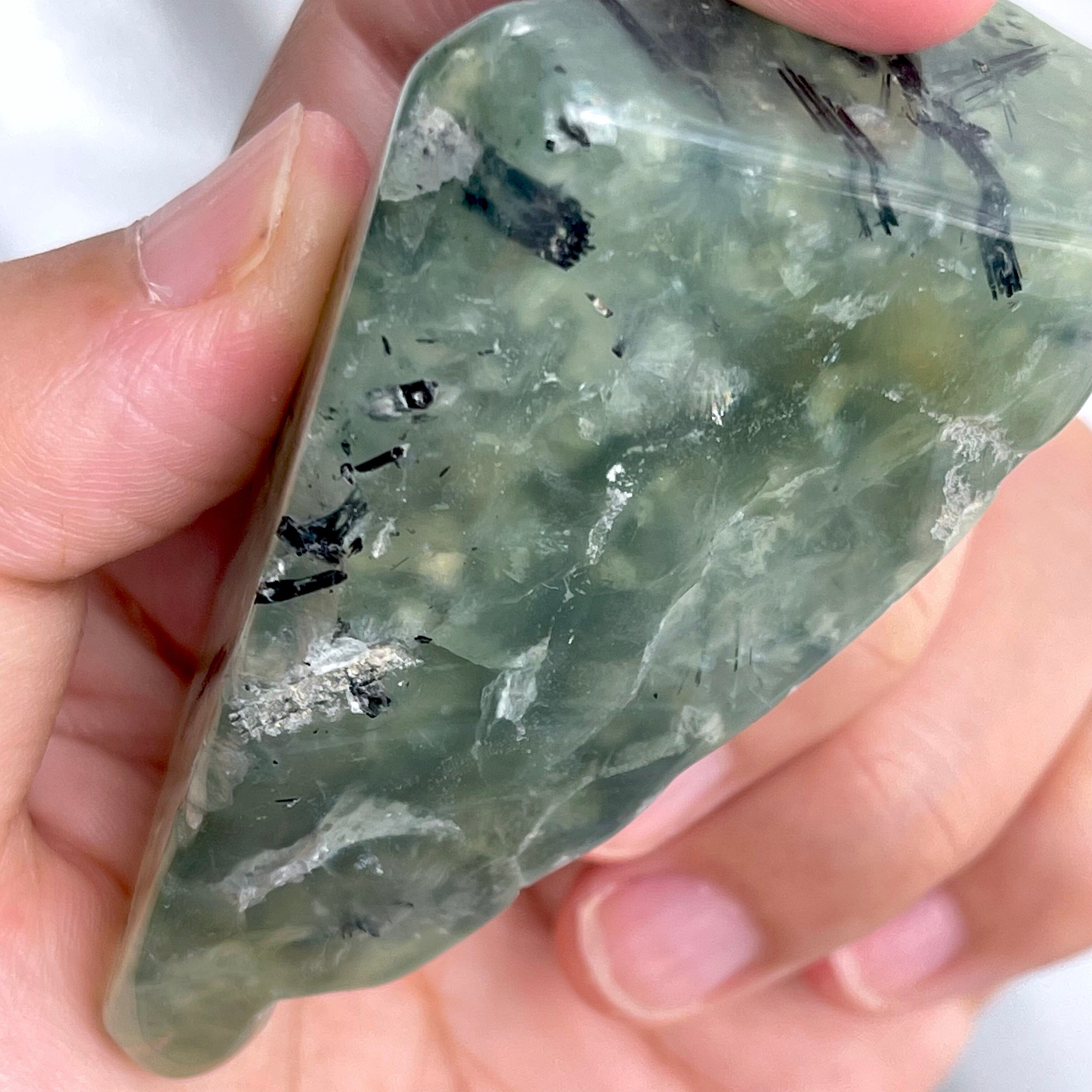 やわらかなアップルグリーンの中に、黒針のように広がるエピドートのインクルージョンが印象的なプレナイト。