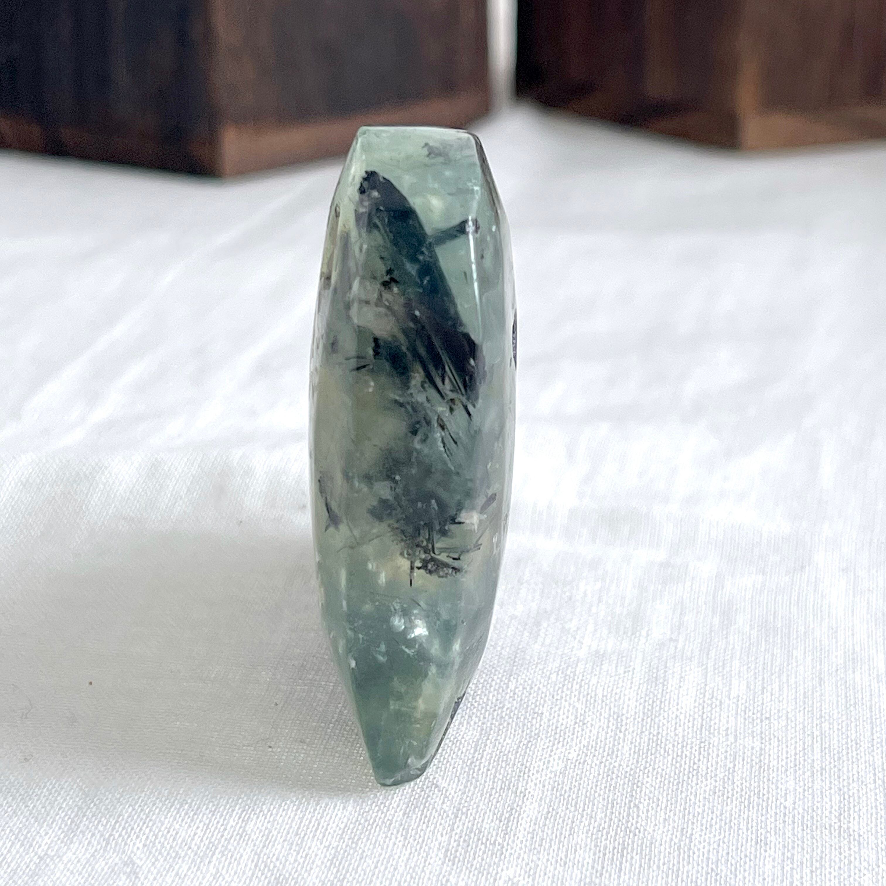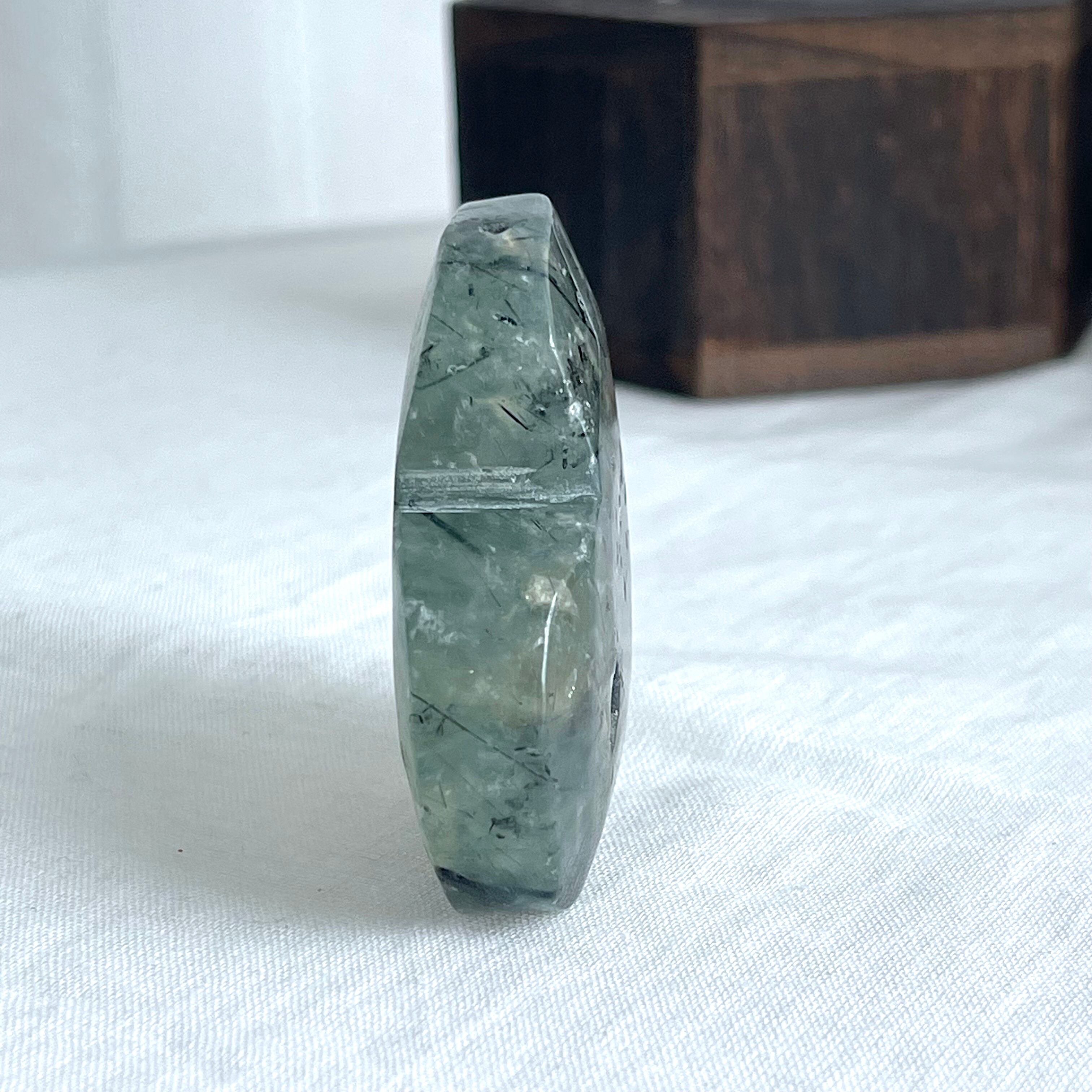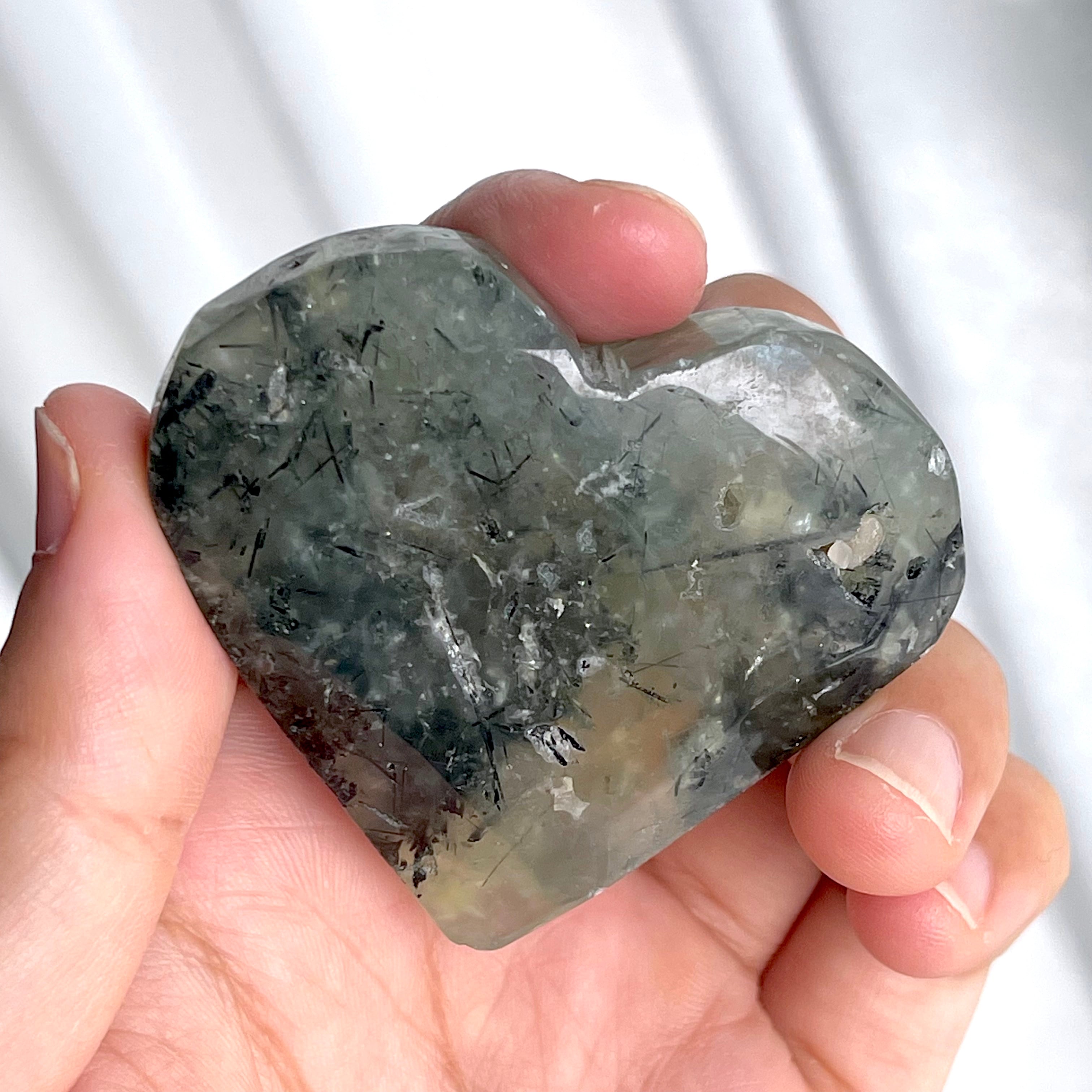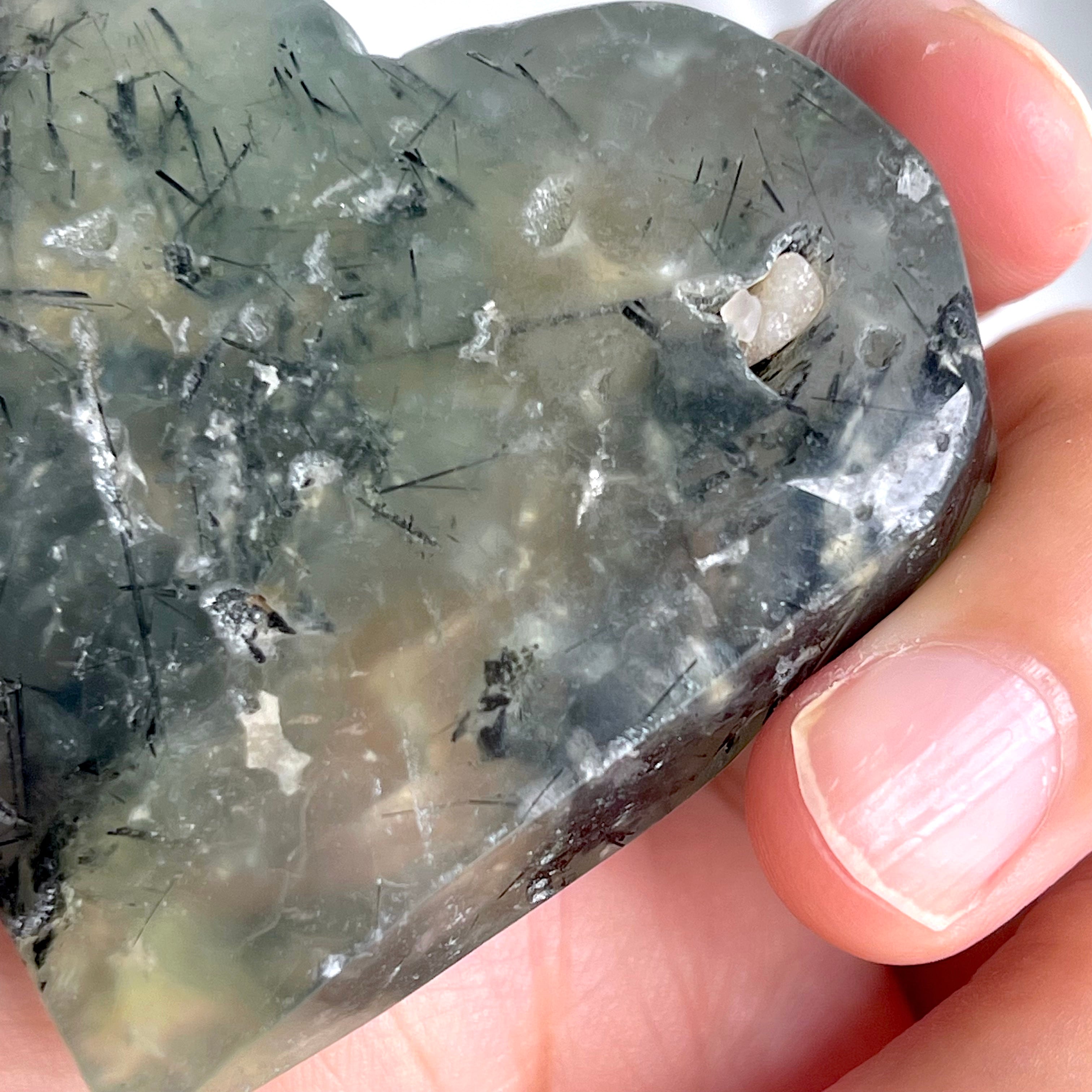 柔らかなグリーンのベースに、エピドートのインクルージョンが流れるハート型のプレナイト。
