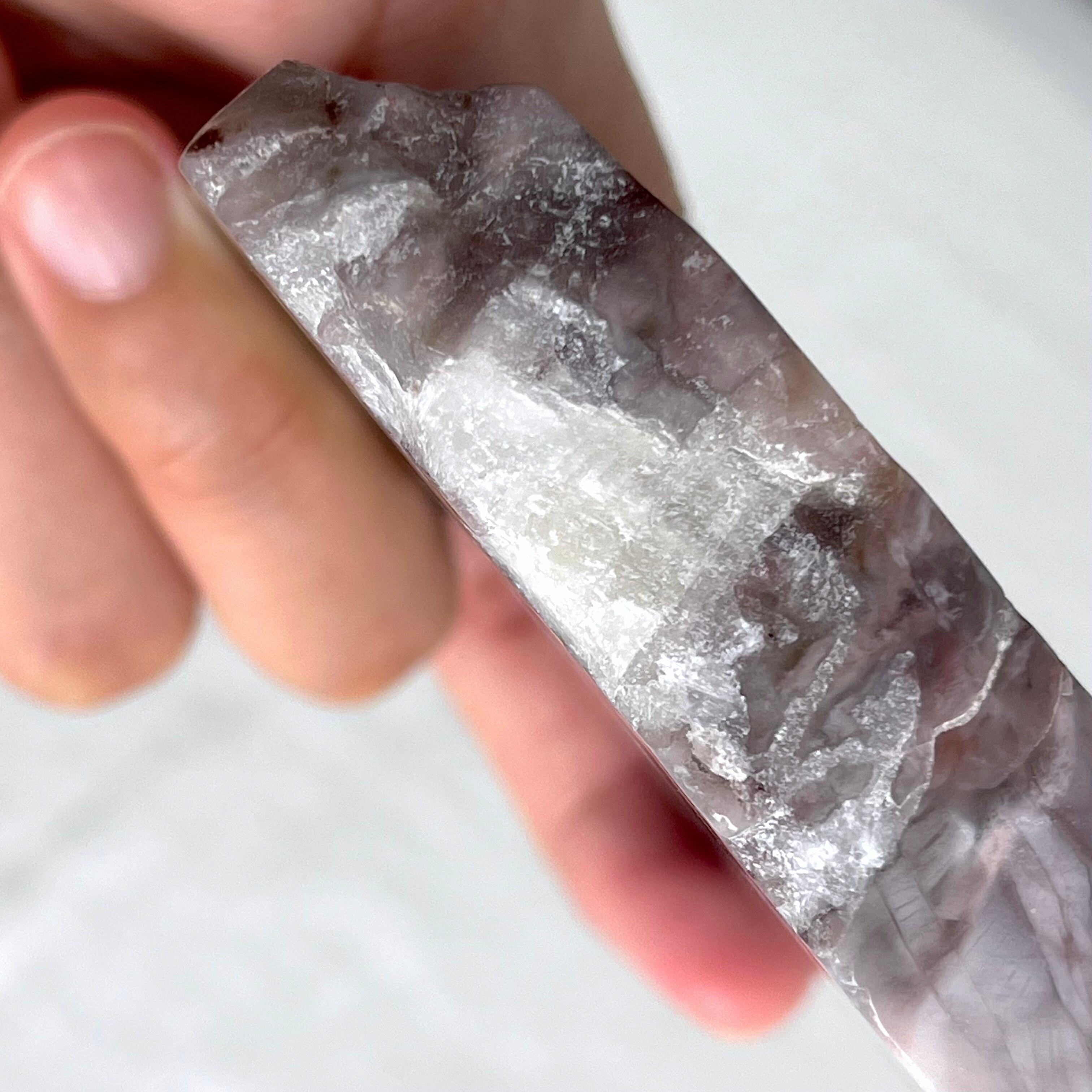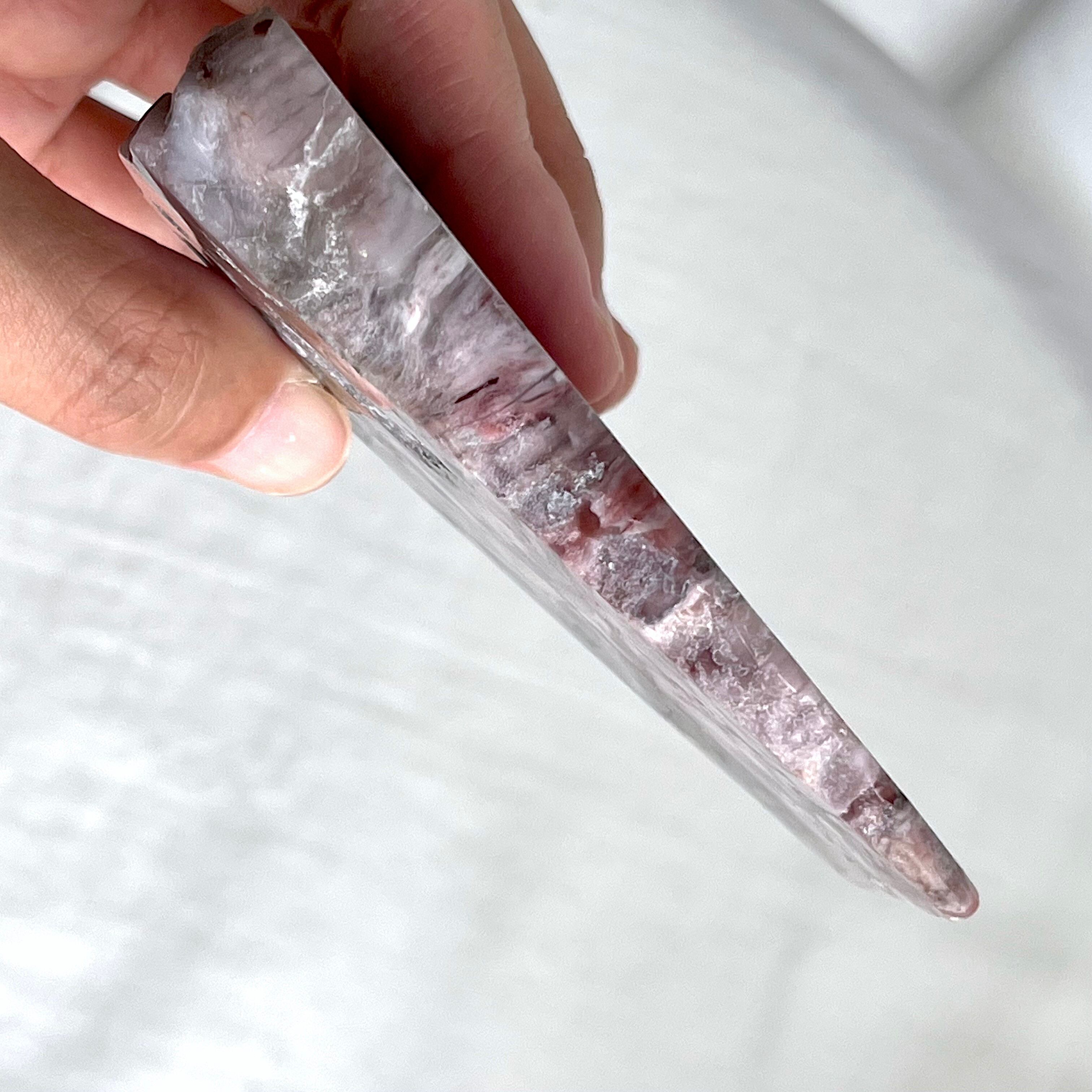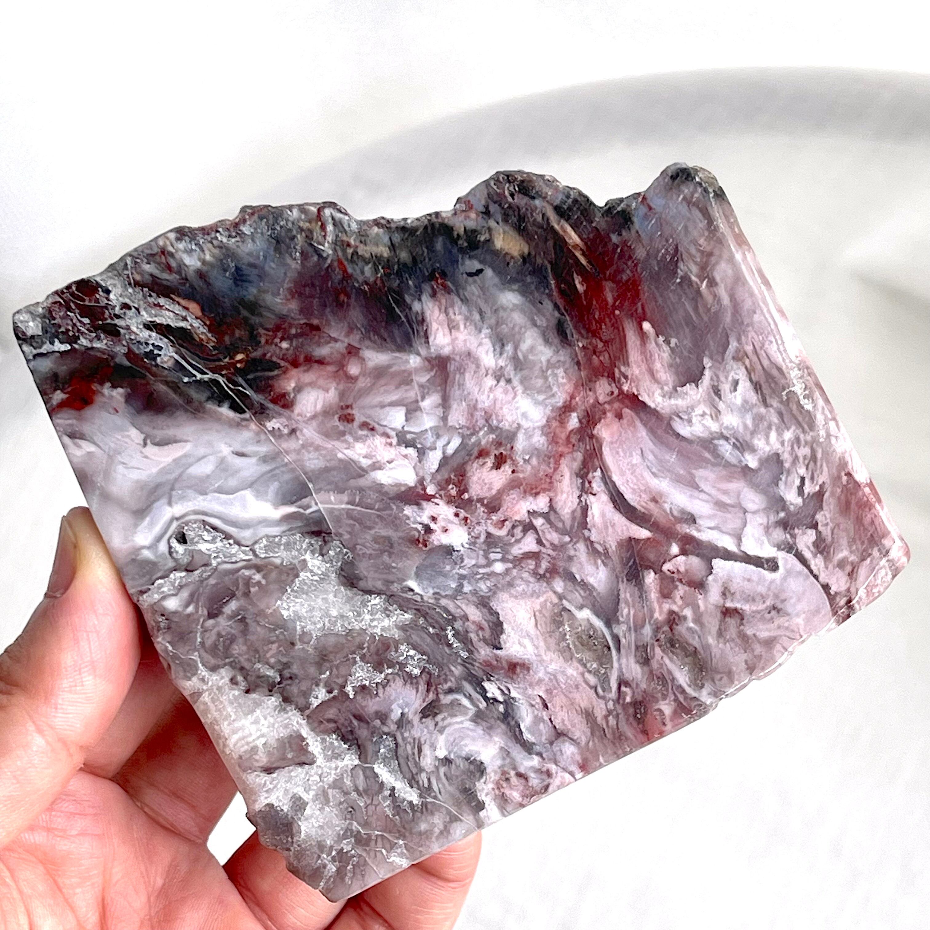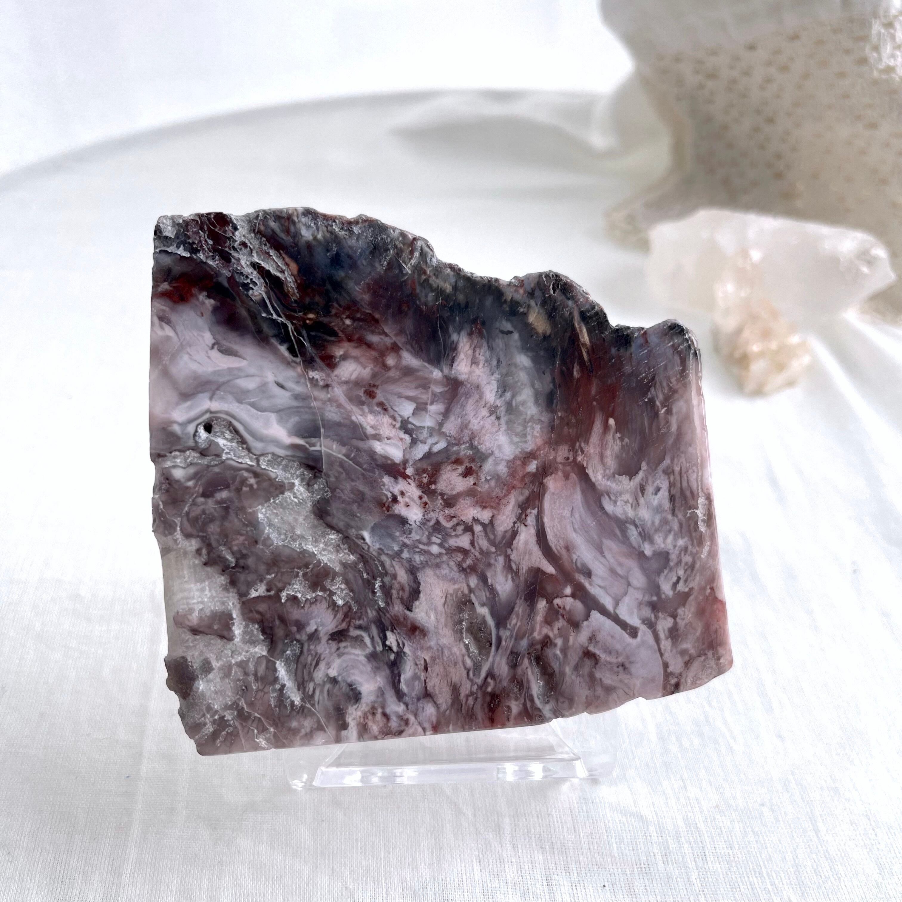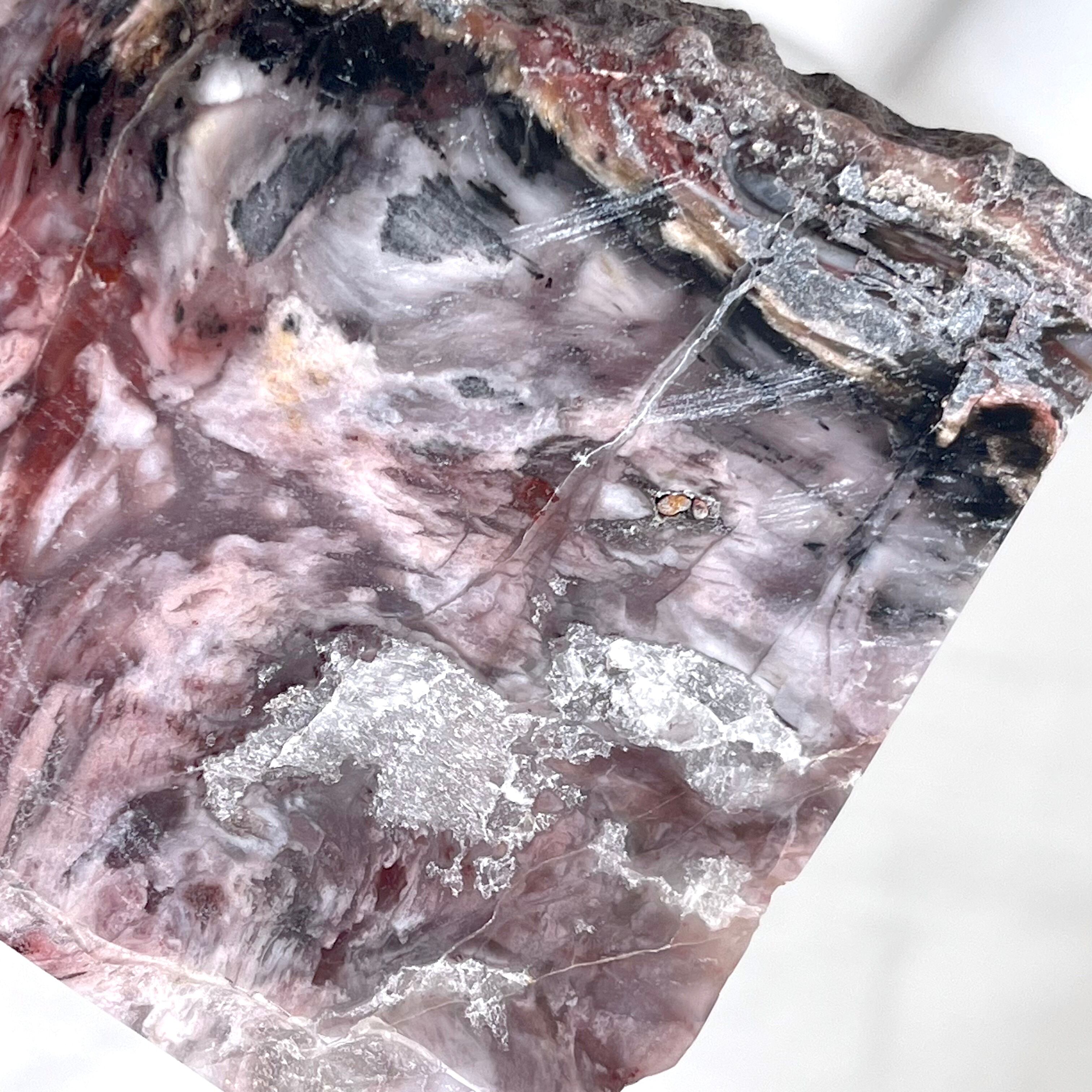 深みのある赤紫から、淡いグレーへと移ろう色彩が印象的なピンクペトリファイドウッド。