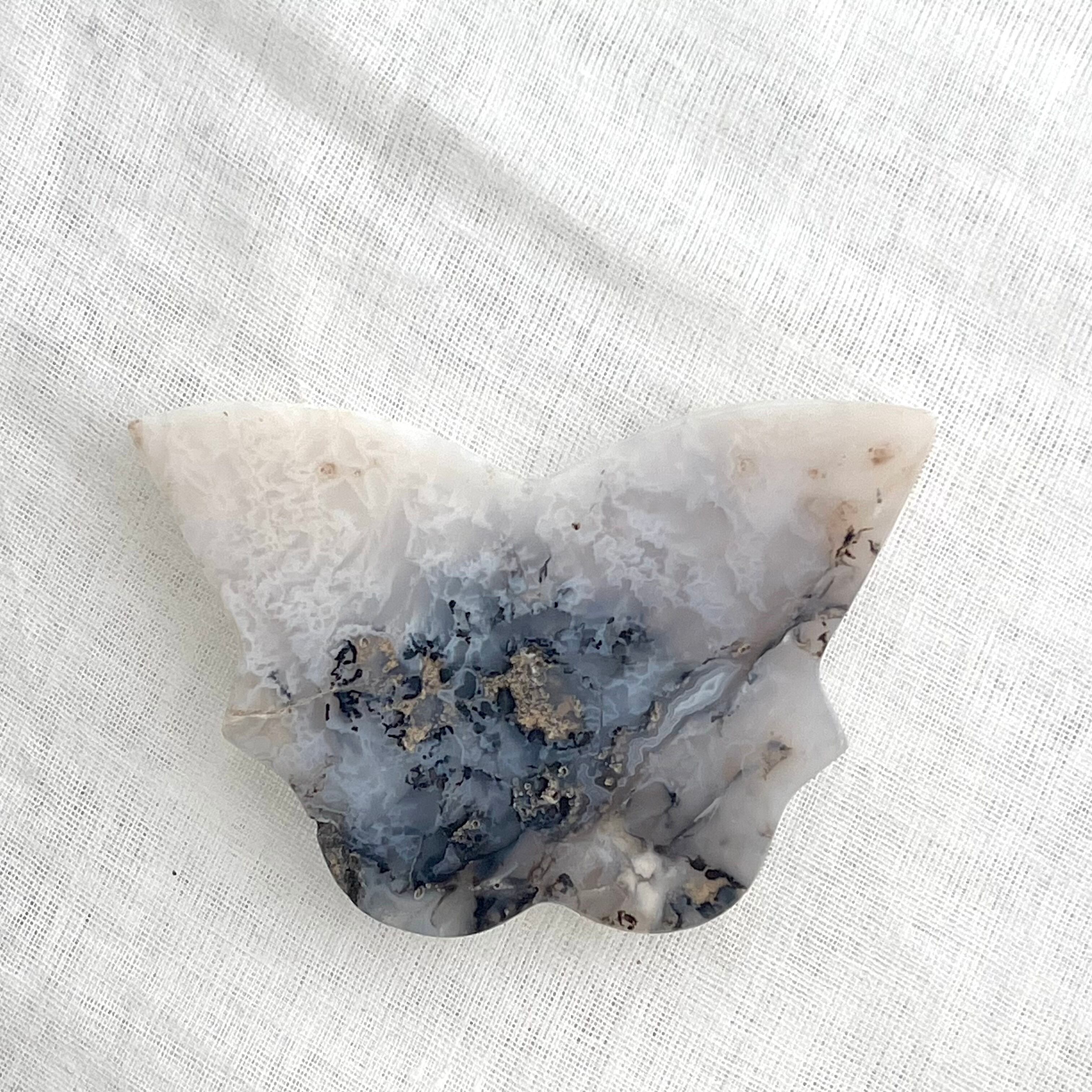 アゲートは調和と安定をもたらす石とされ、バタフライの形は変容や再生を象徴します。