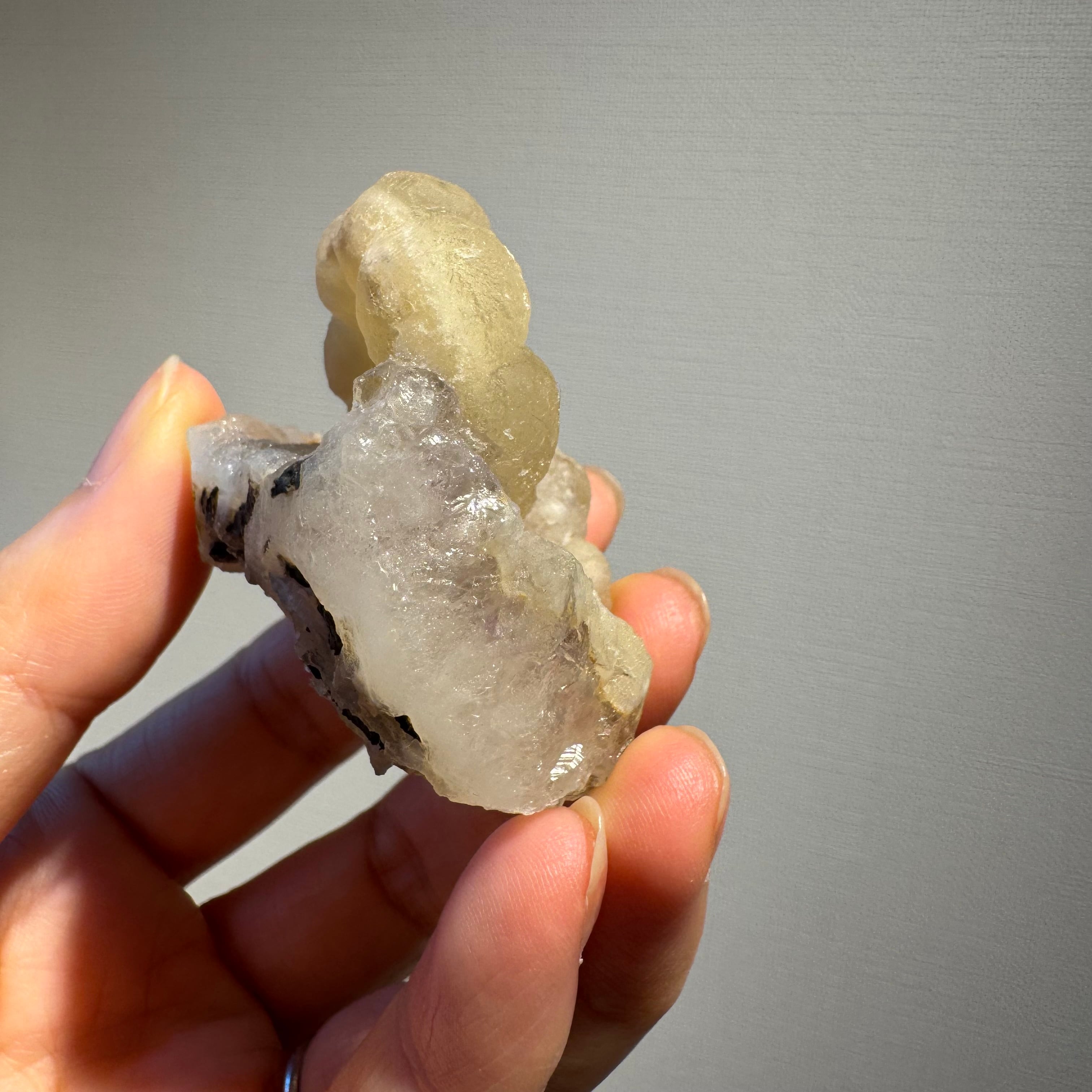 フローライトが球状に結晶し、それらが互いに融合することで形成される特殊形態。通常の八面体や立方体とは異なる、非常にレアな成長パターンです。