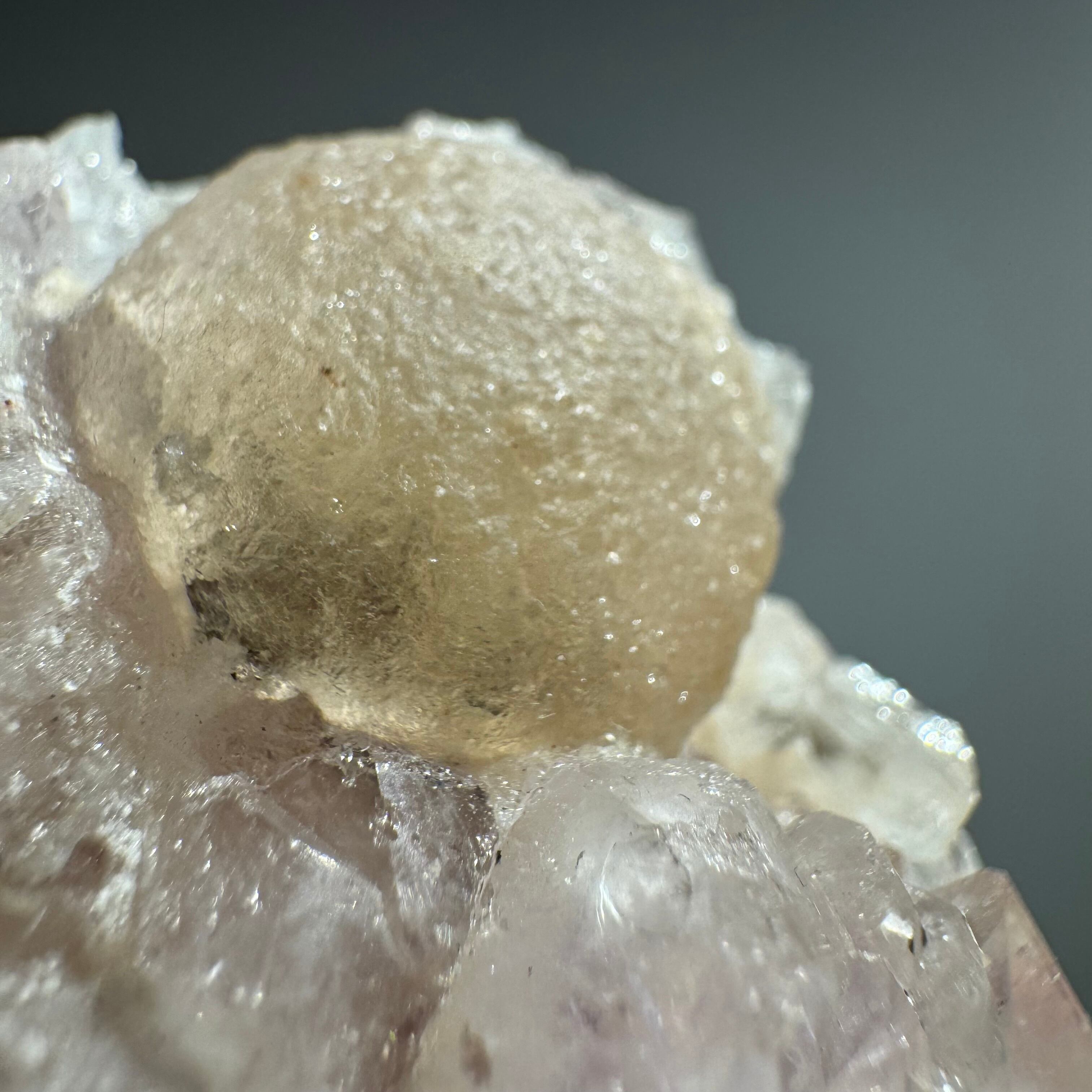 フローライトが球状に結晶し、それらが互いに融合することで形成される特殊形態。通常の八面体や立方体とは異なる、非常にレアな成長パターンです。
