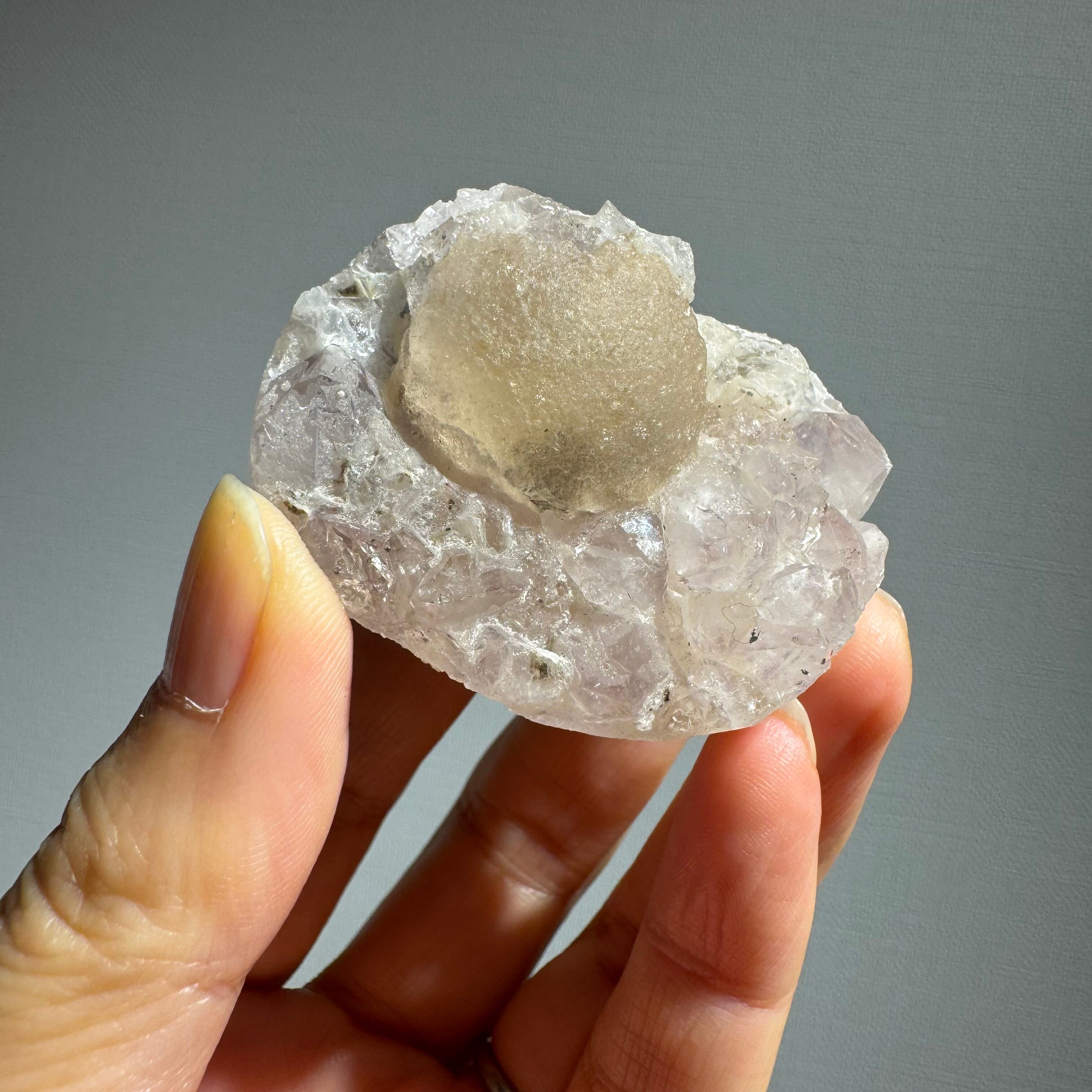 母体のアメシストがとても美しく、大きめの球体フローライトも光でキラキラと輝きます。