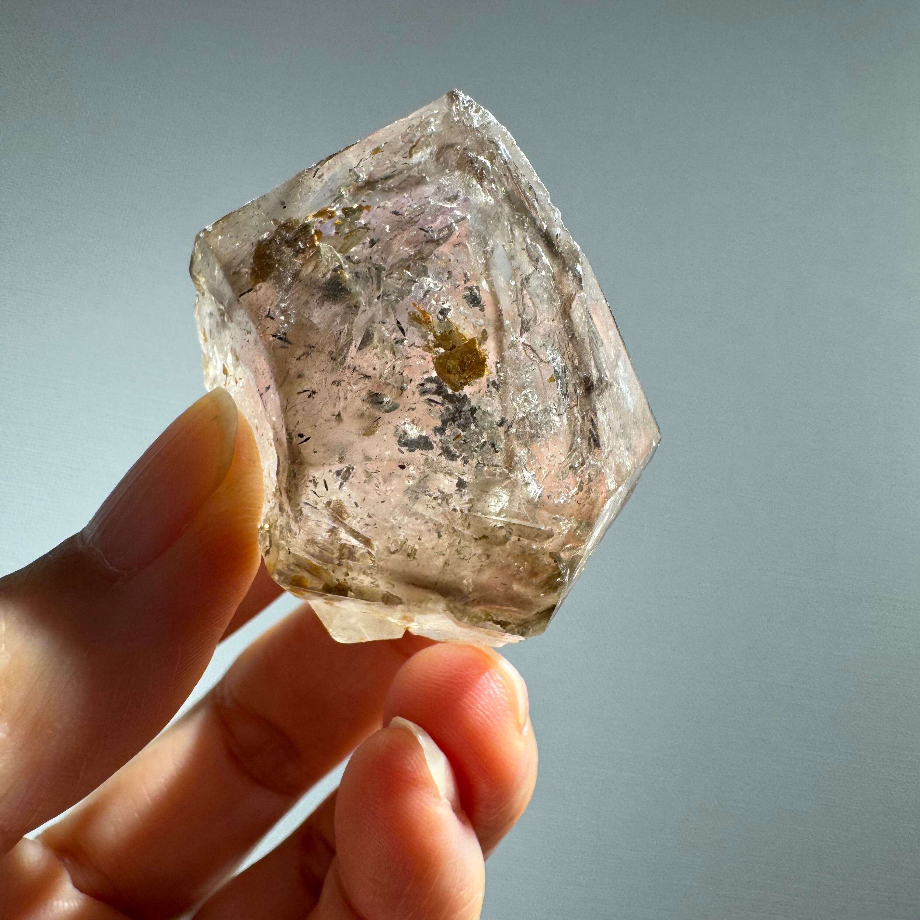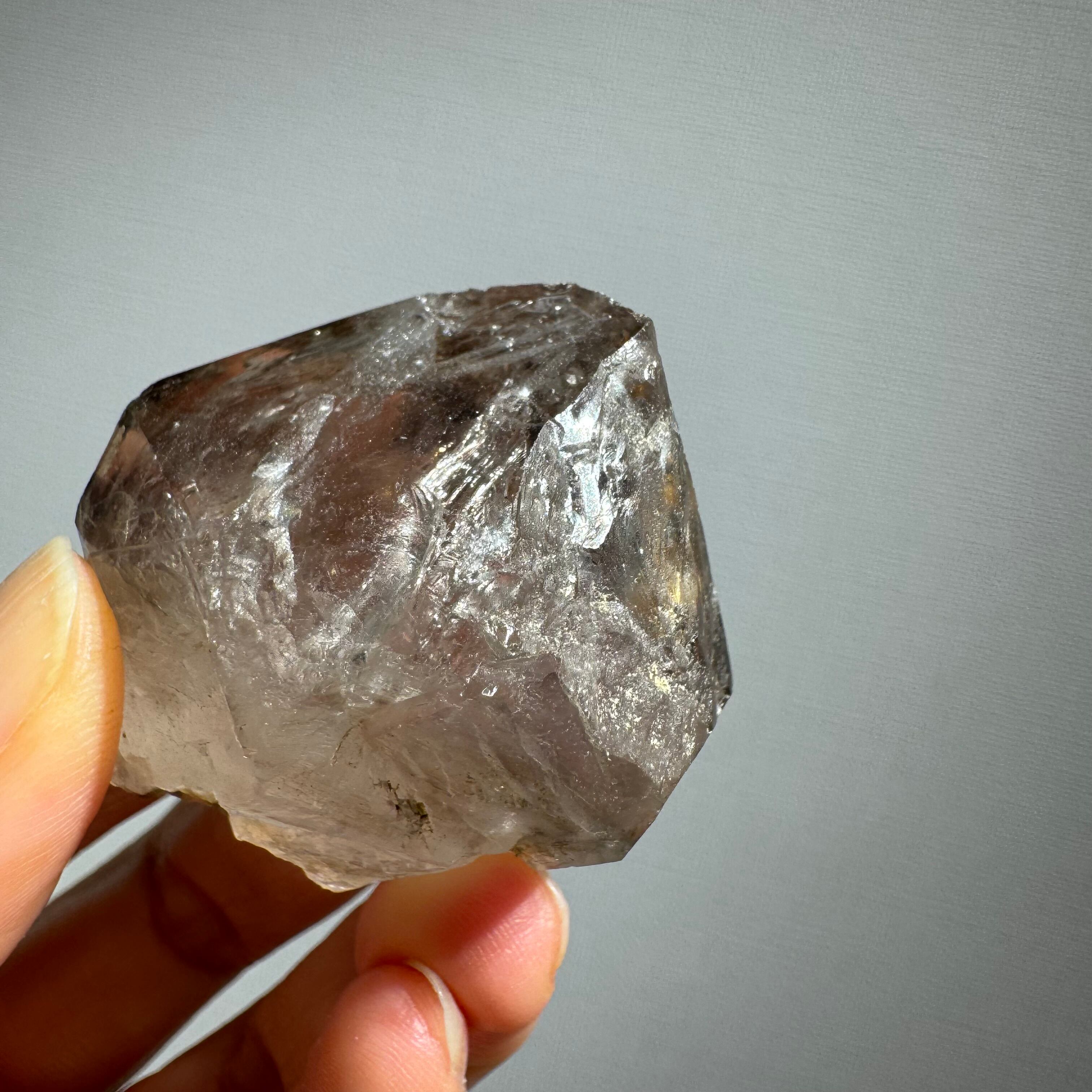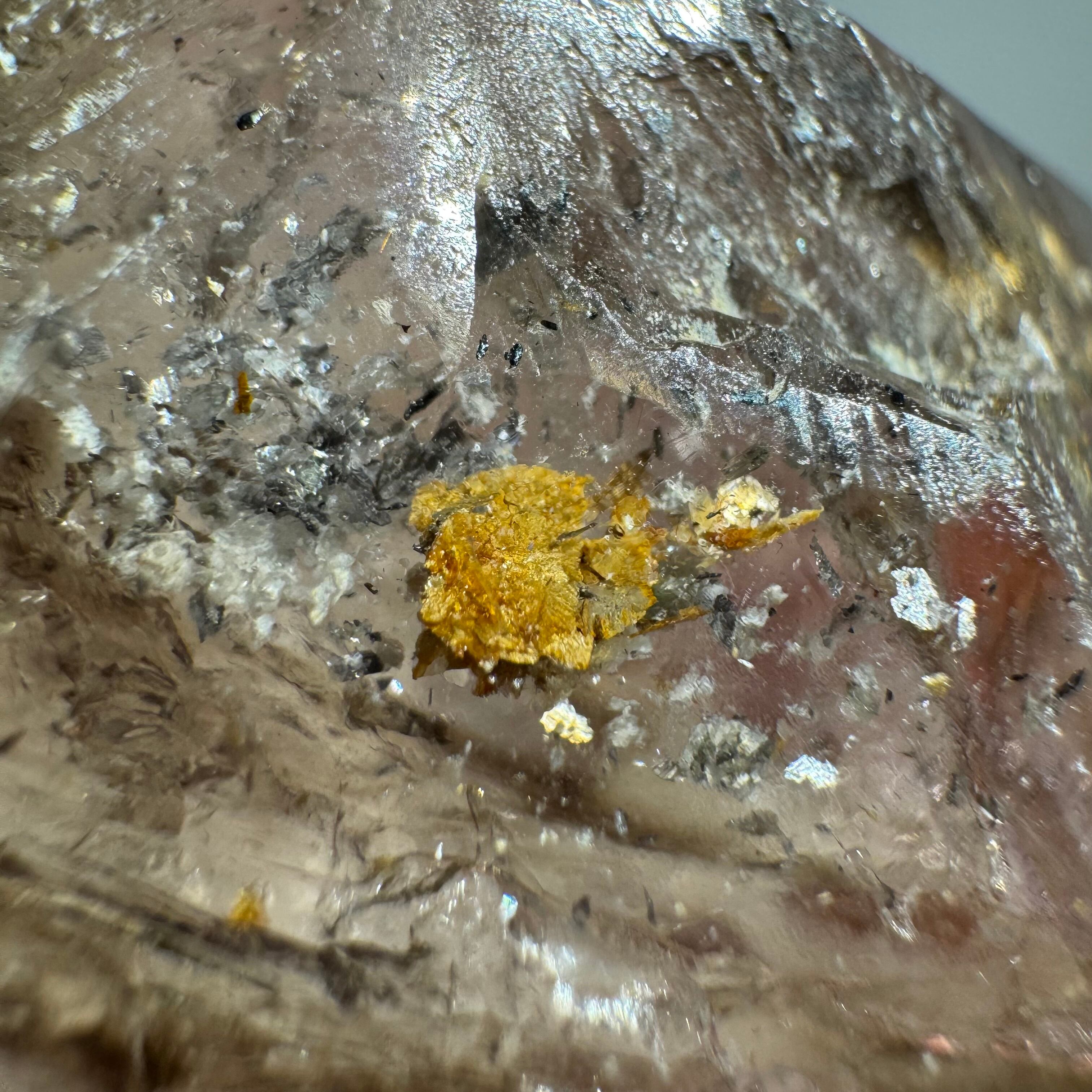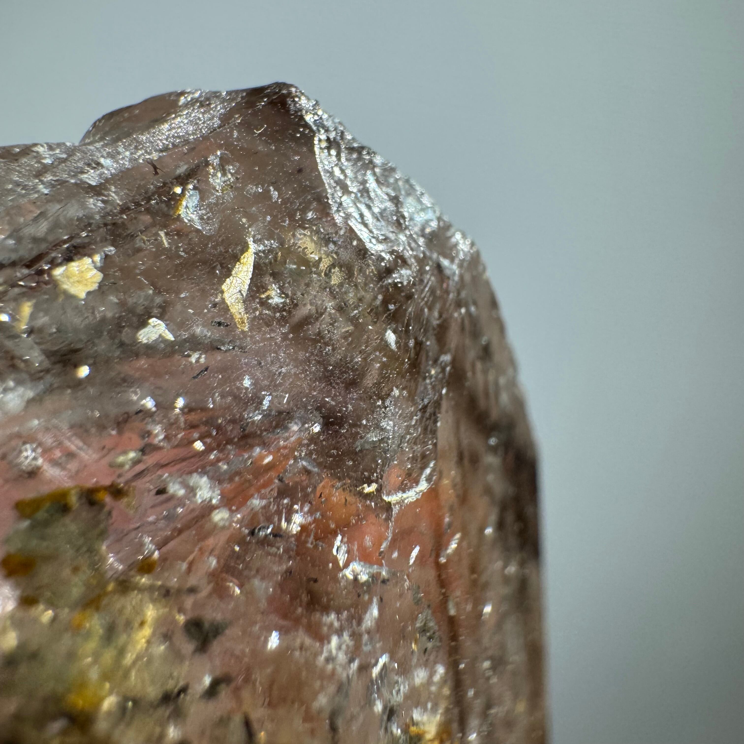 こちらは透明度が高く、スモーキーやアメシストの色味、ヘマタイトなどのインクルージョン、あちらこちらから美しいレインボーも見られます。