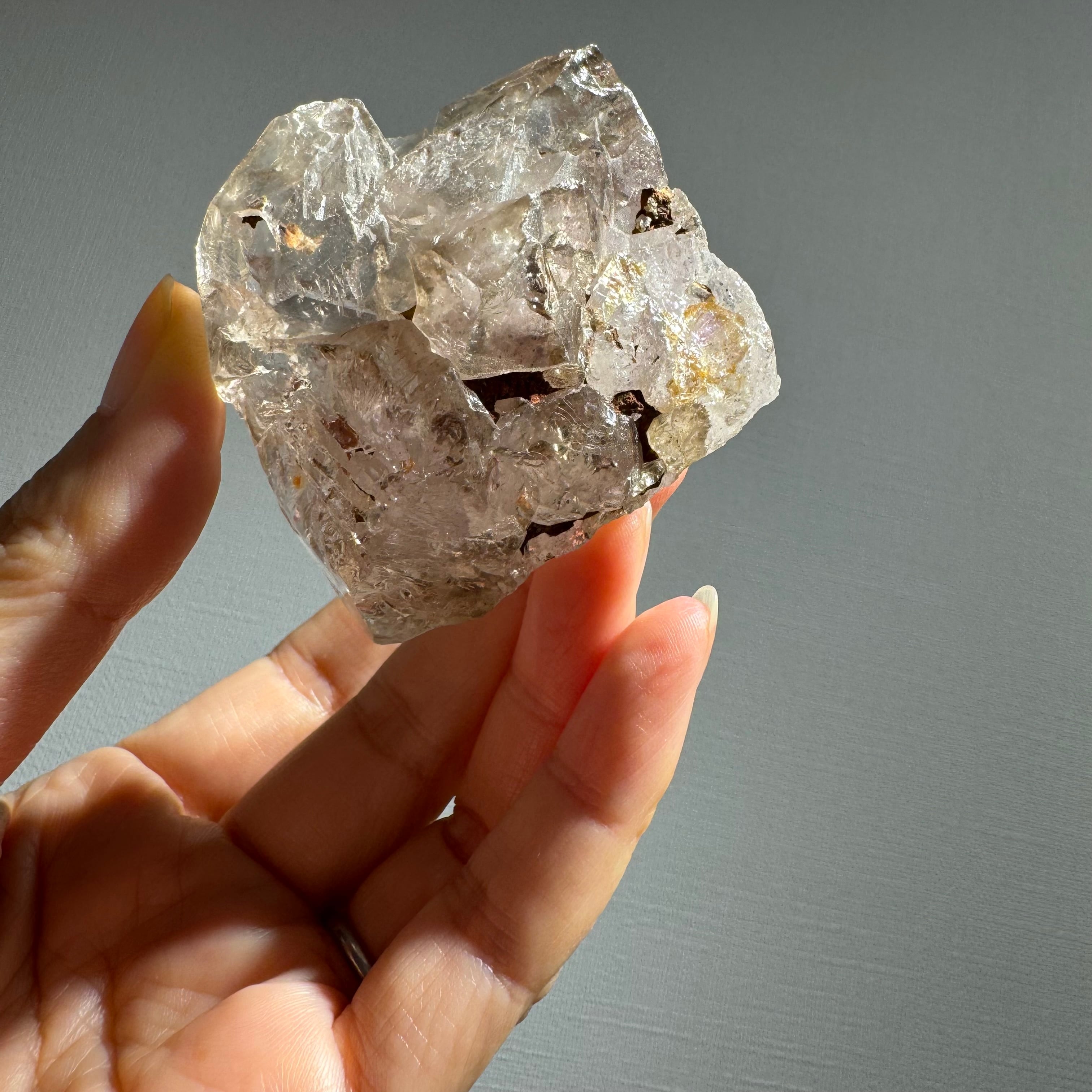 こちらは透明度が高く、スモーキーやアメシストの色み、ゲーサイトやヘマタイトなどのインクルージョン、美しいレインボーが見られる個体です。