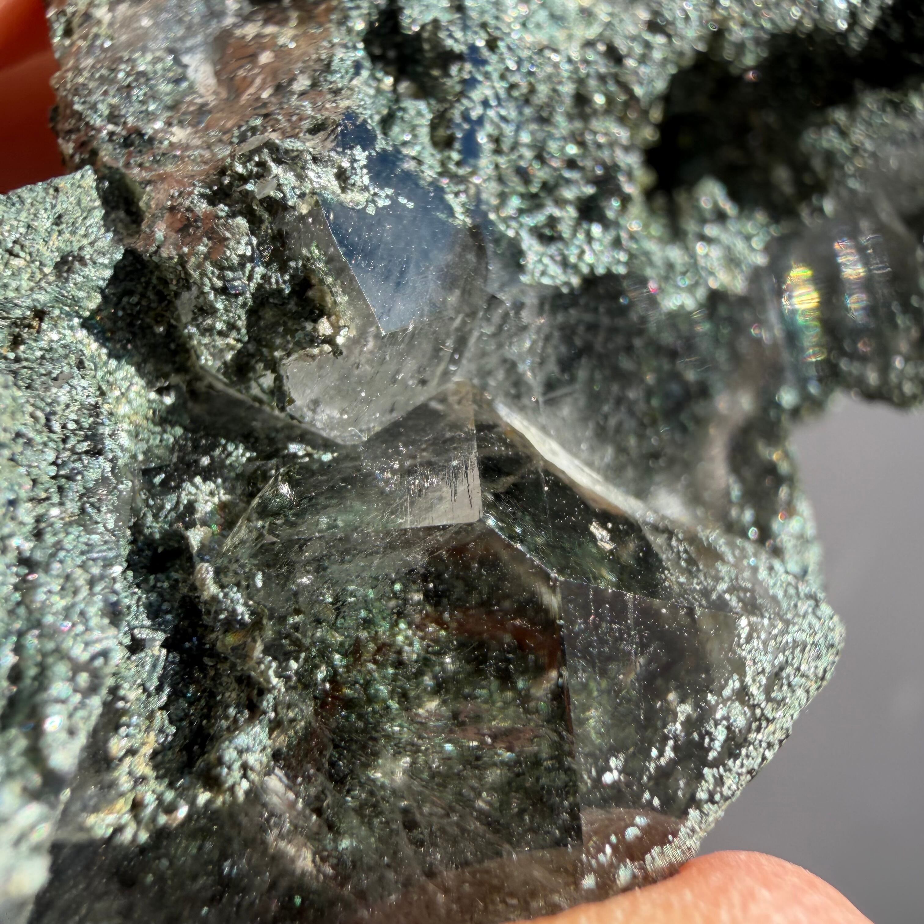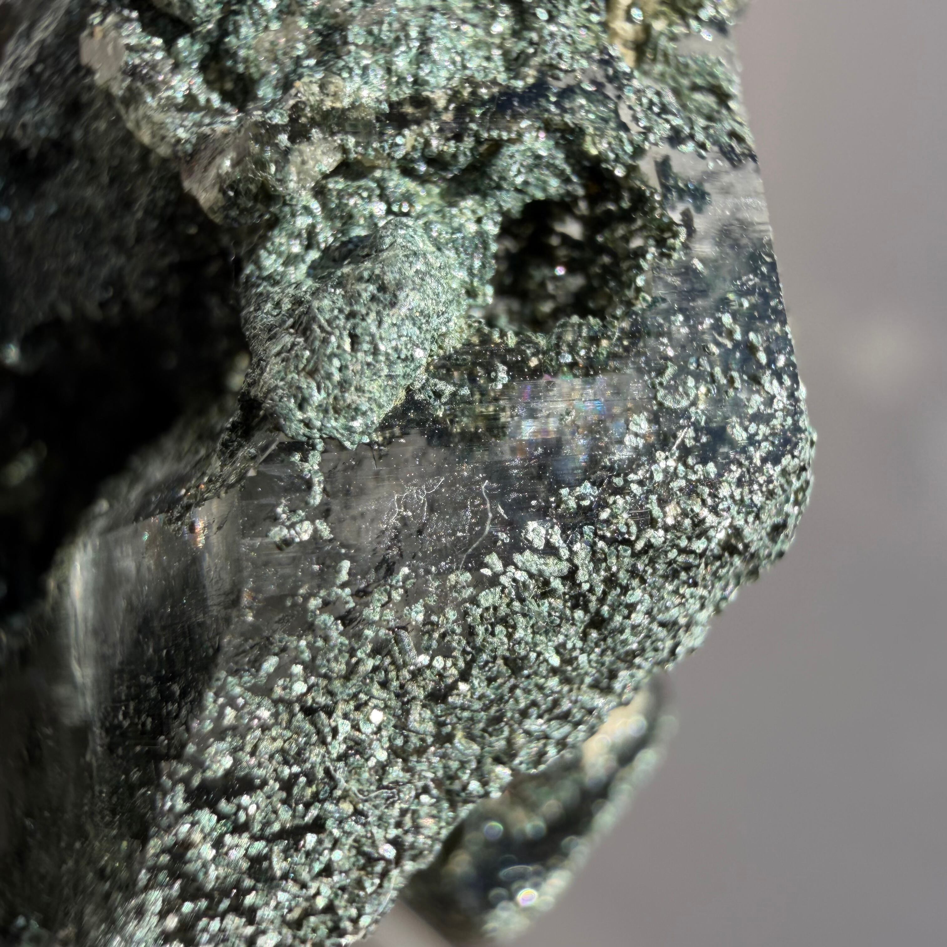 濃いクロライトに包まれた結晶の奥から清らかな透明感が立ち上がるマニハール産クラスターで、ファセットに光が当たるとレインボーが静かにきらめき、ヒマラヤの大地をそのまま手のひらに宿したような存在感があります。