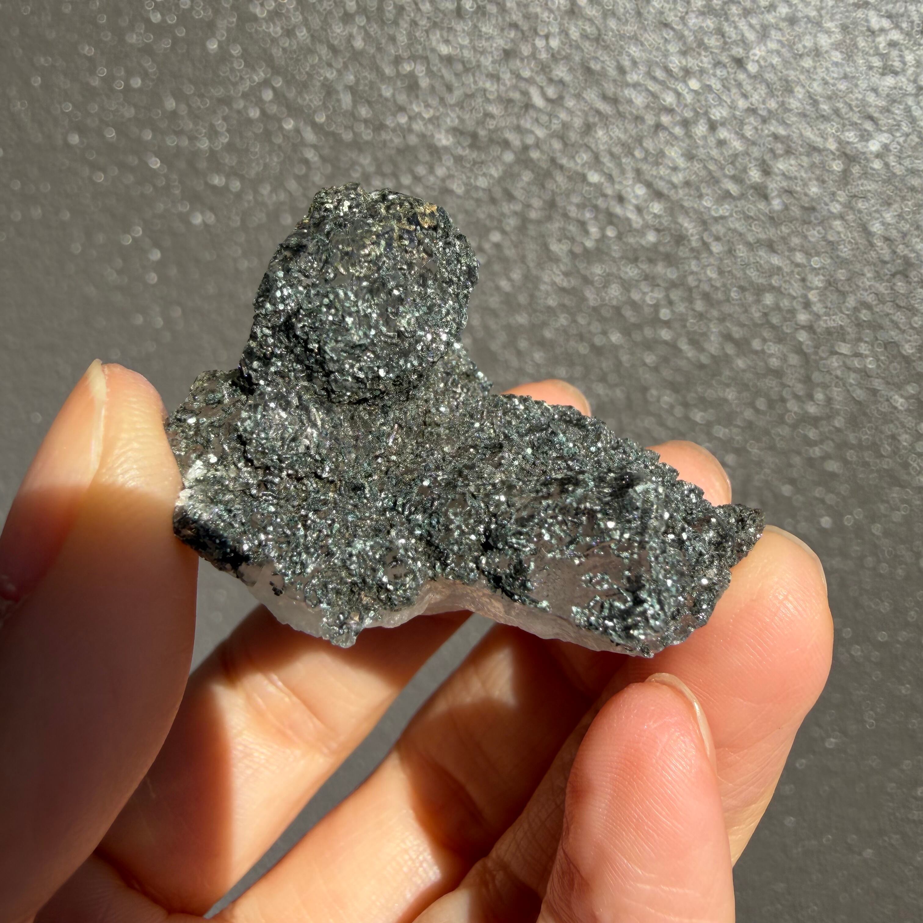 ヒマラヤ・マニハール産らしい、高標高特有の“銀色の微細結晶”がびっしりと付着した個性的な一点です。