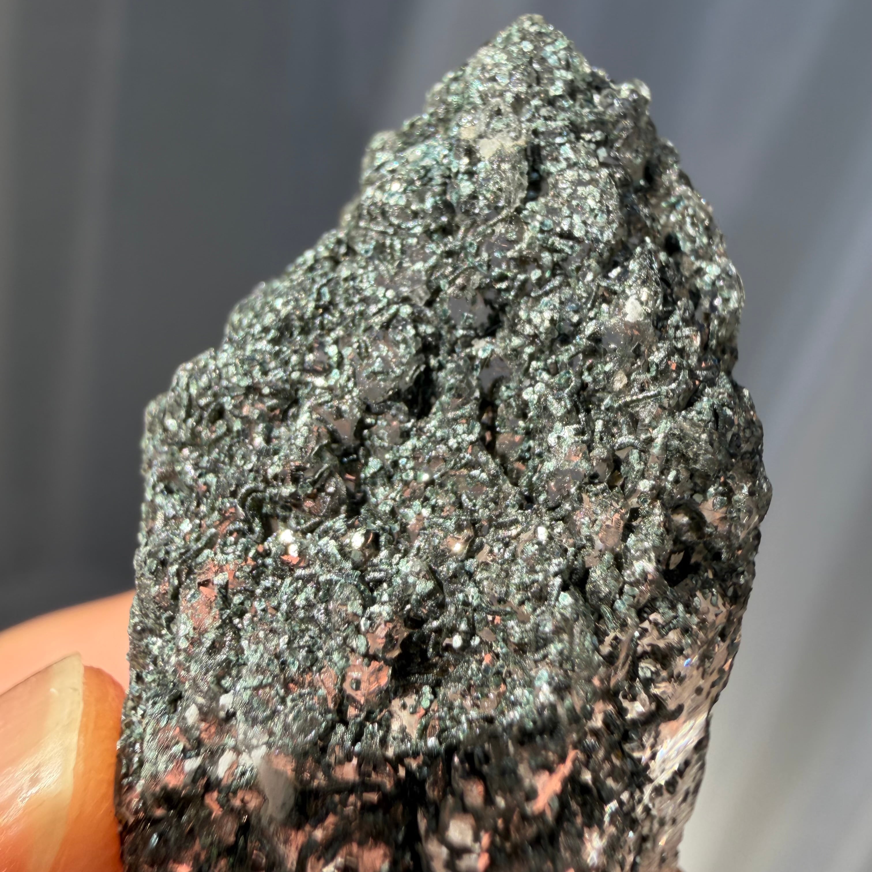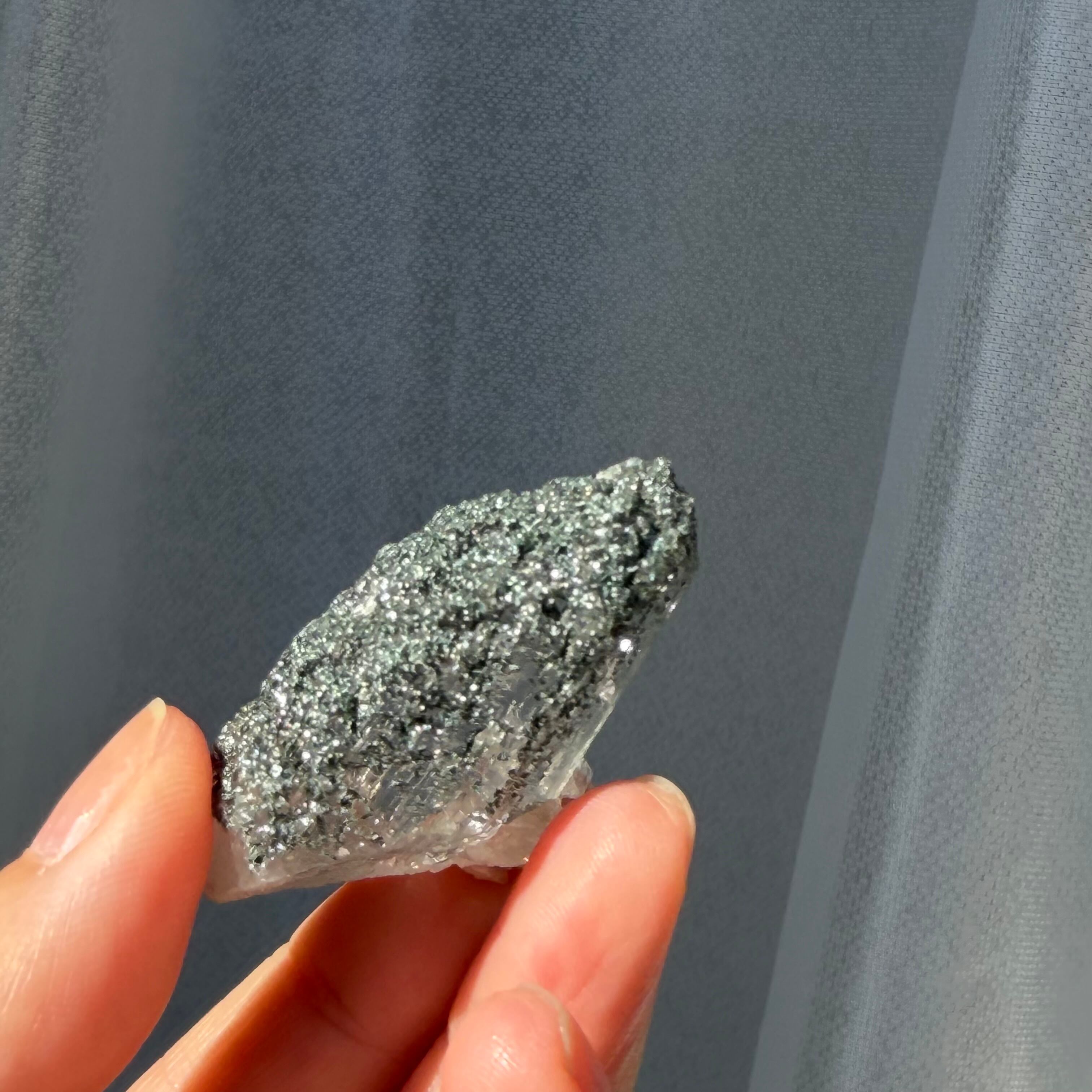 クリアな水晶の表面を深いモスグリーンの微細鉱物が覆い、光を受けるたびに銀色の星屑のようにきらめく印象的なネパール・ガネーシュヒマール水晶。