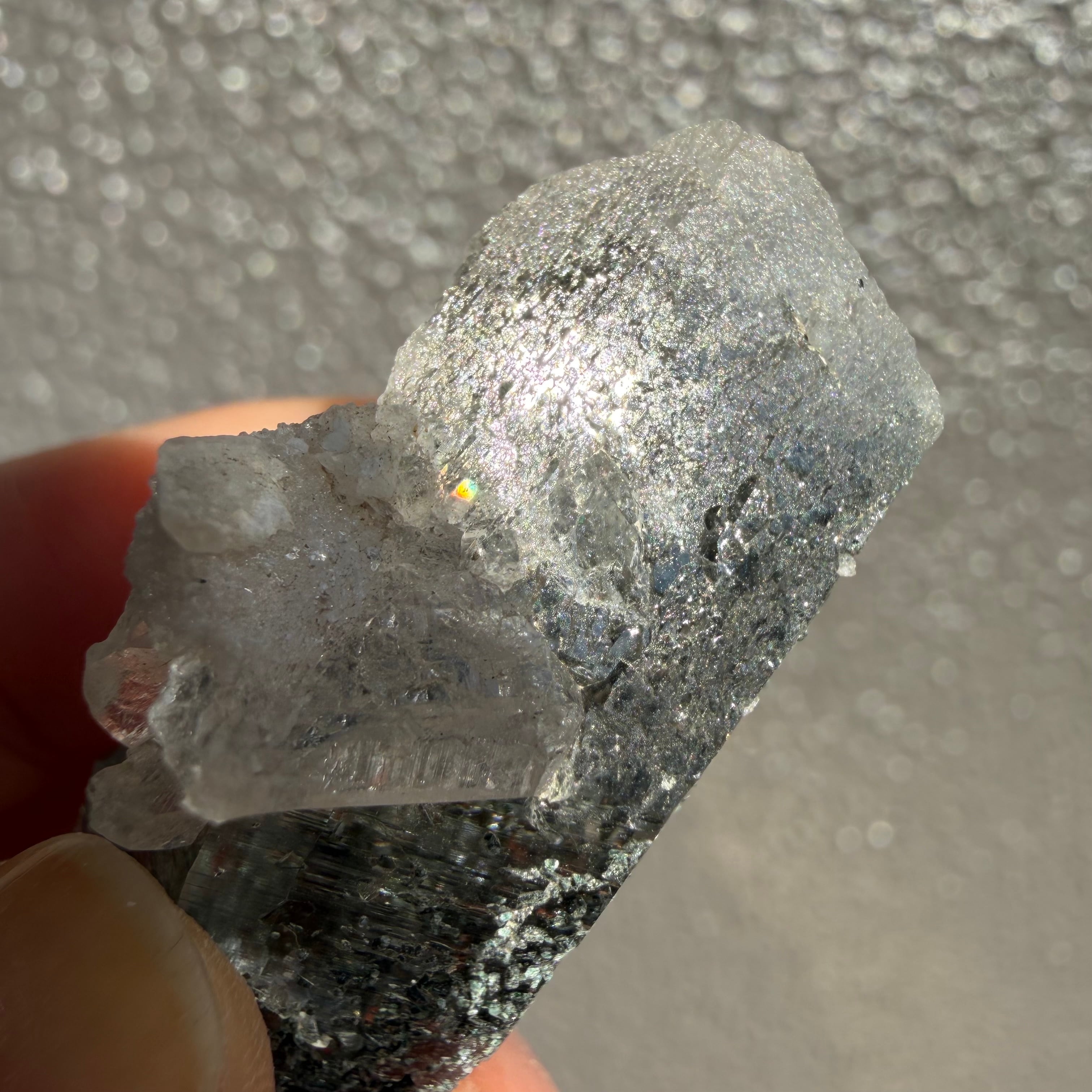 透明度の高い柱面には成長線や内包されたレインボーが見られ、表面のモスグリーンとのコントラストが、この産地ならではの雰囲気をより強く感じさせてくれます。