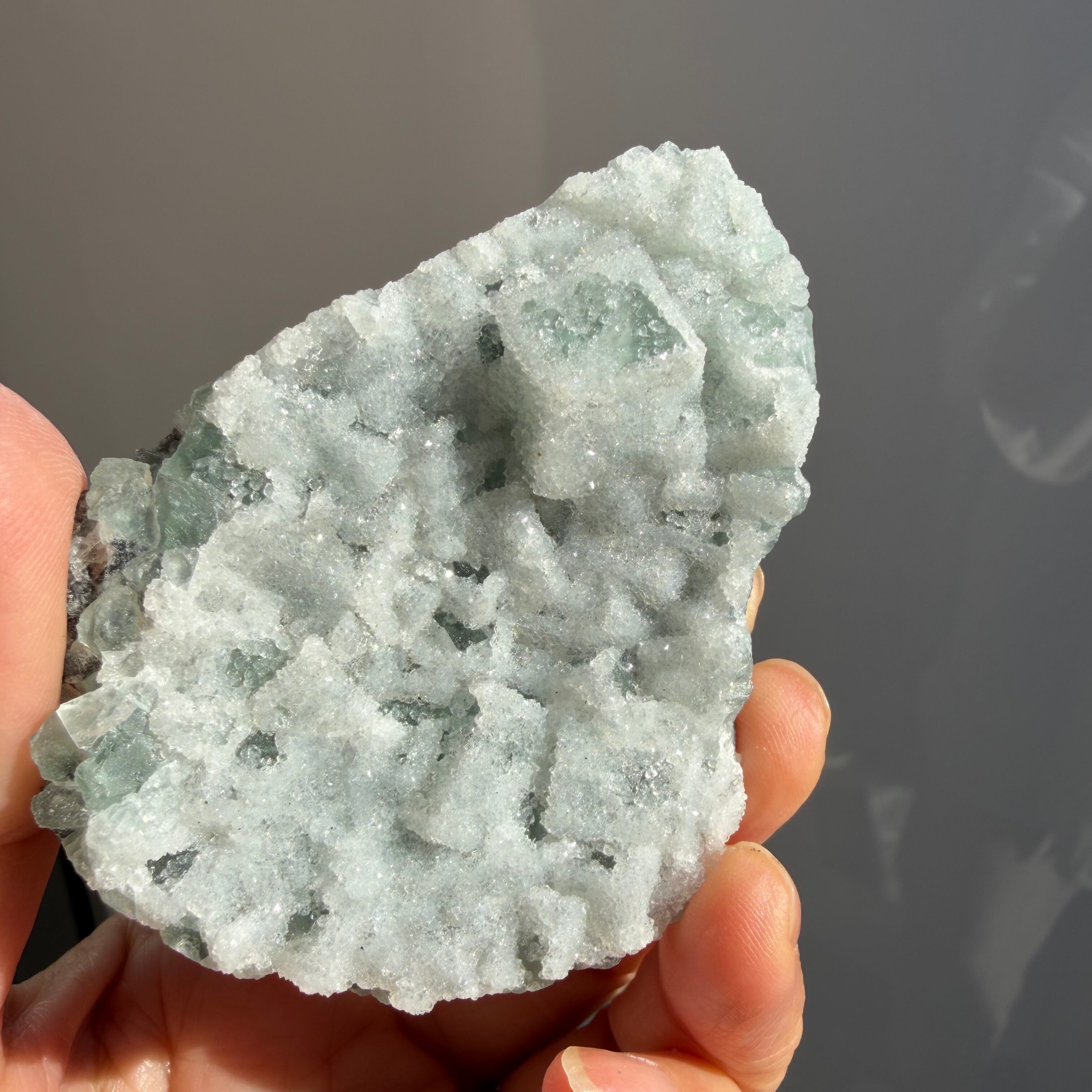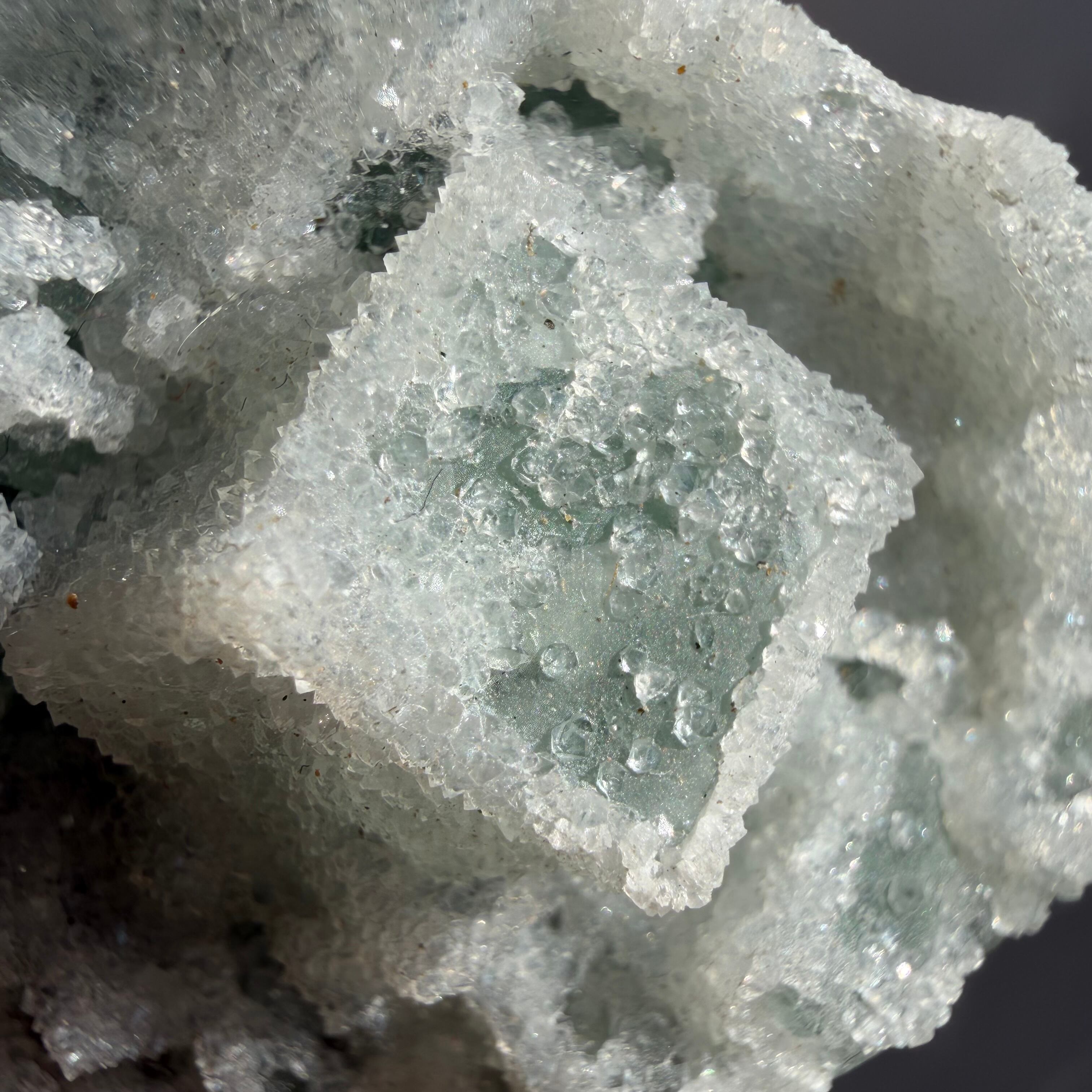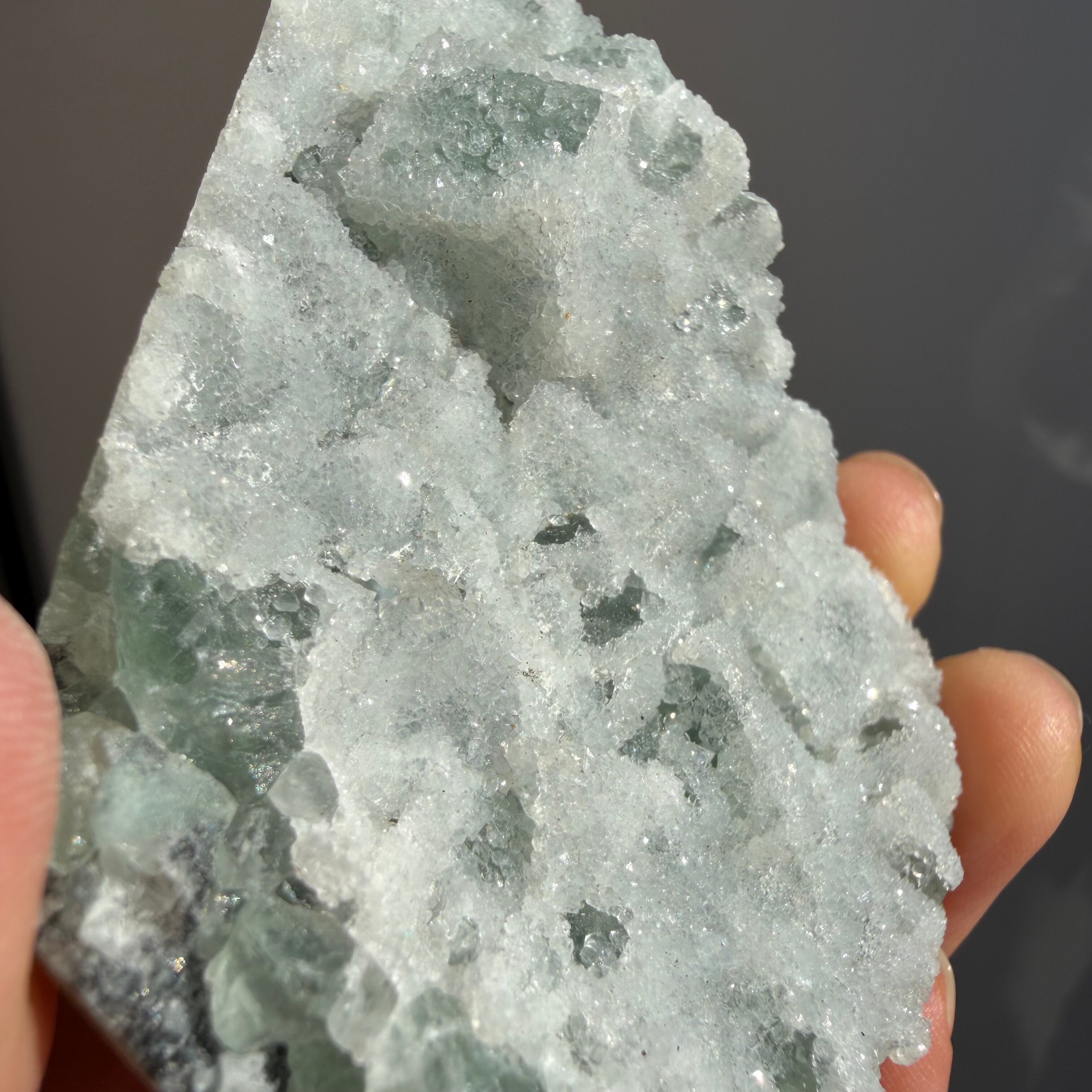 淡いミントグリーンのフローライトに、砂糖菓子のようなシュガードゥルージーがふんわりと広がり、表面全体にきらきらとした光をまとっています。