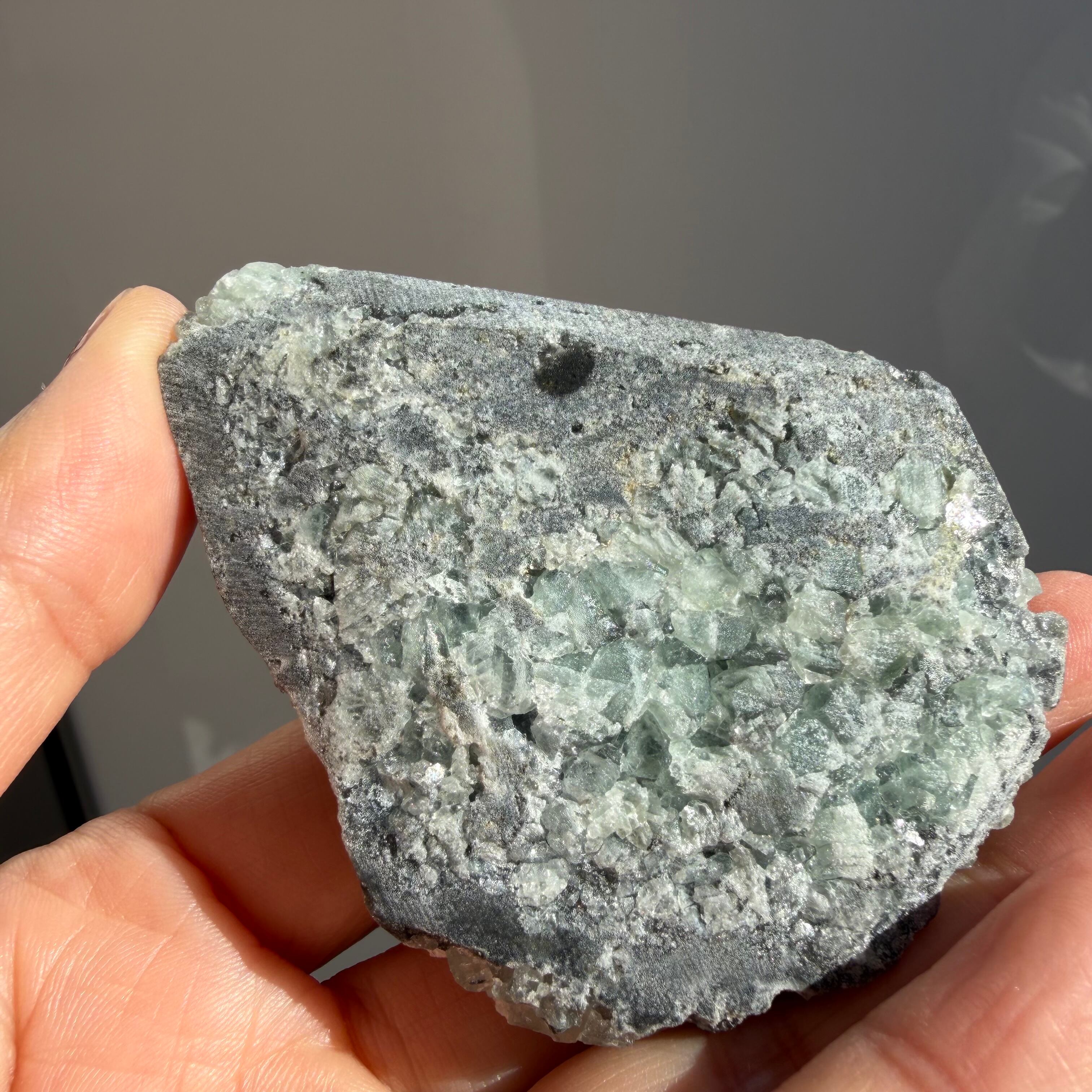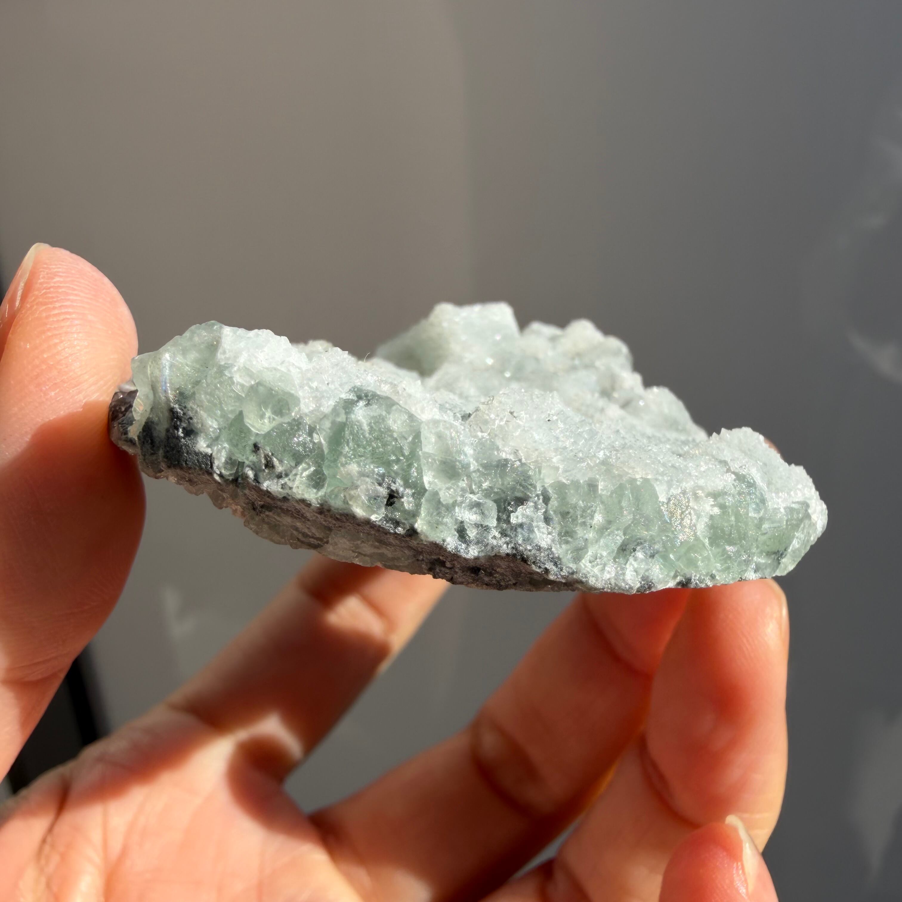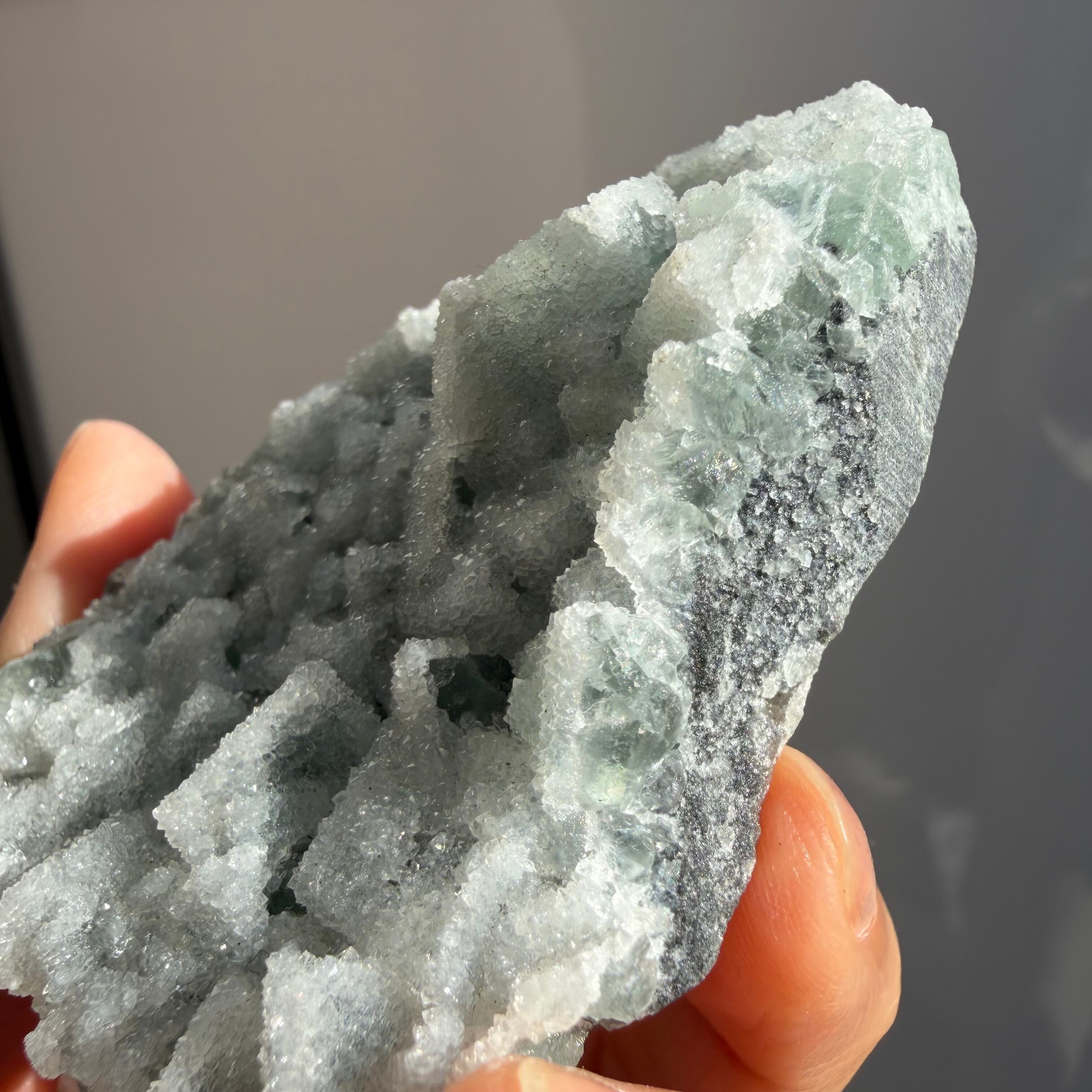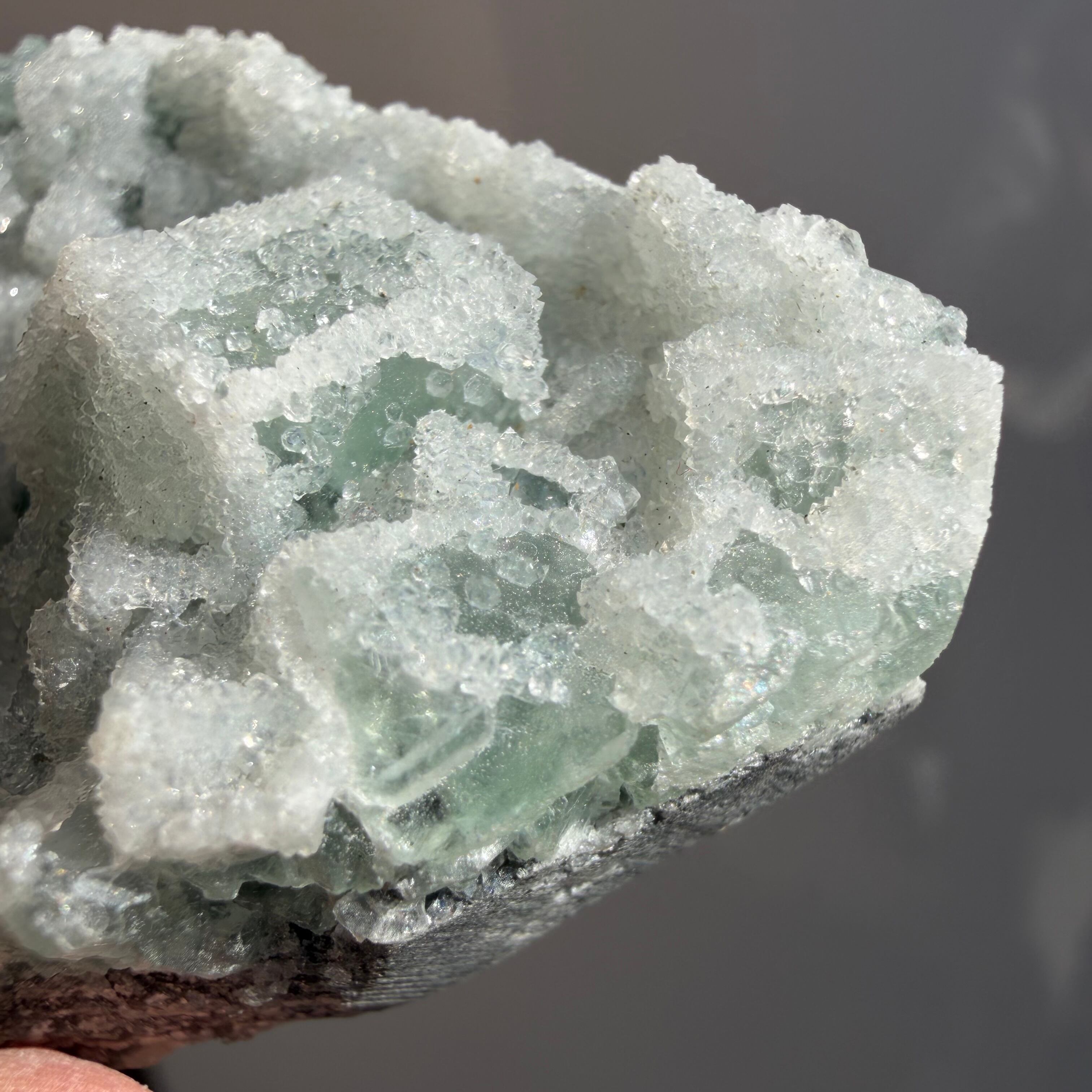 淡いミントグリーンのフローライトに、砂糖菓子のようなシュガードゥルージーがふんわりと広がり、表面全体にきらきらとした光をまとっています。