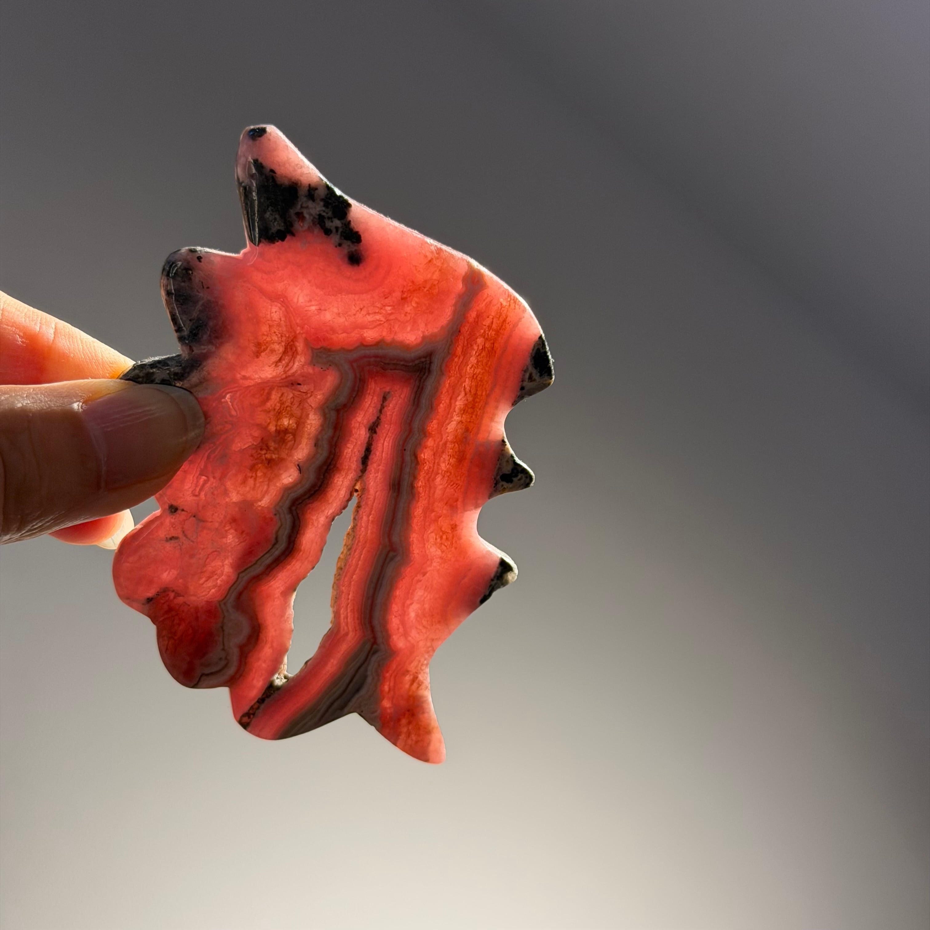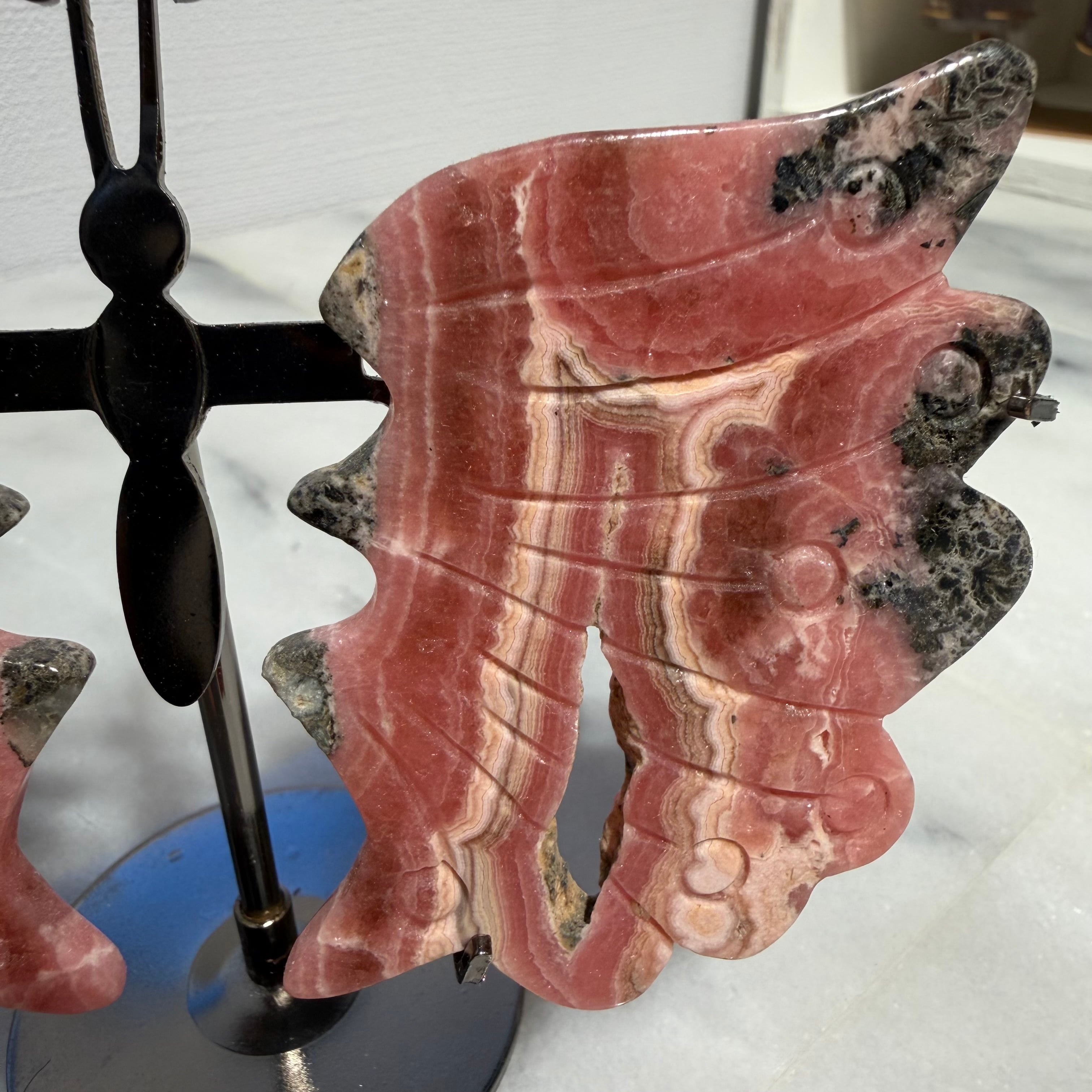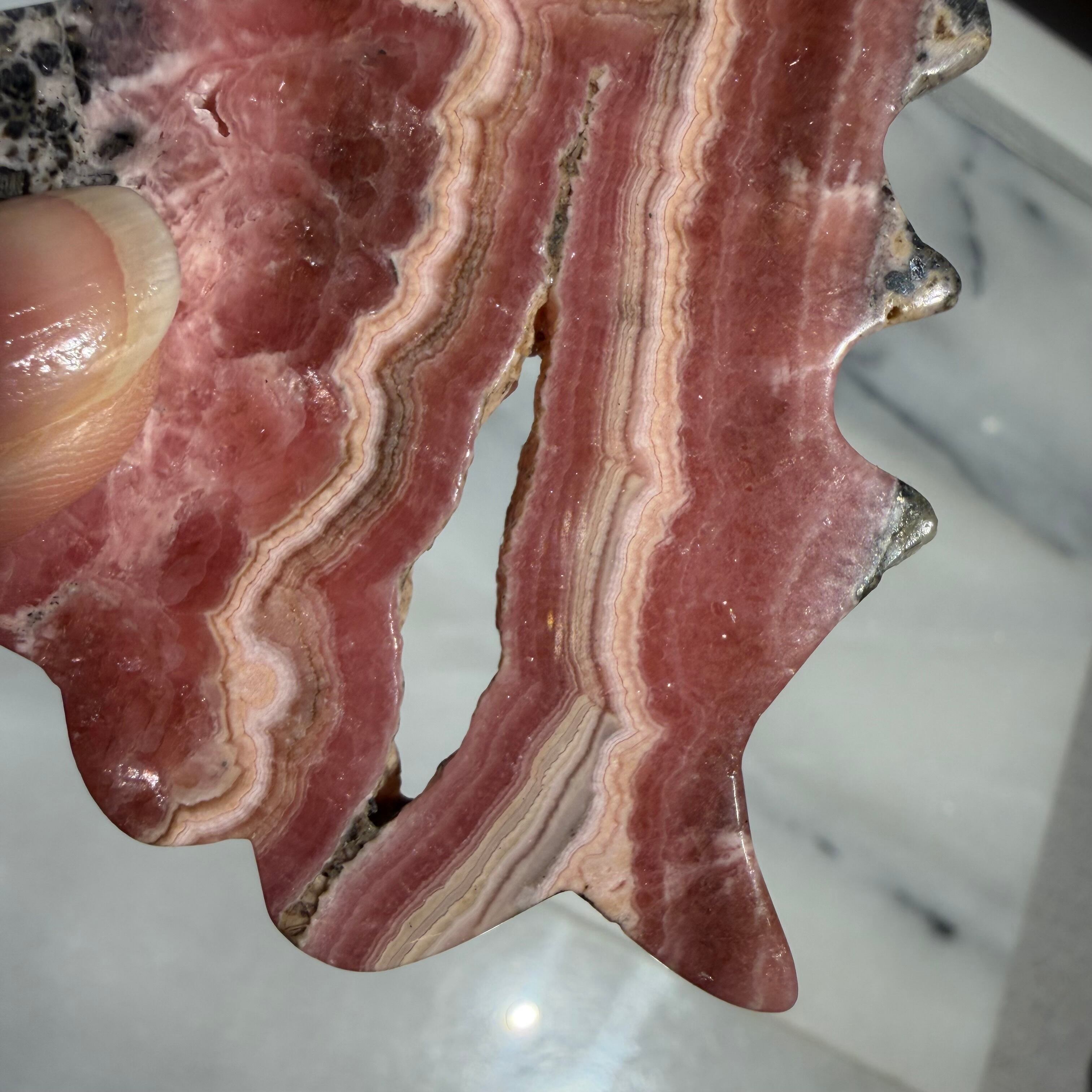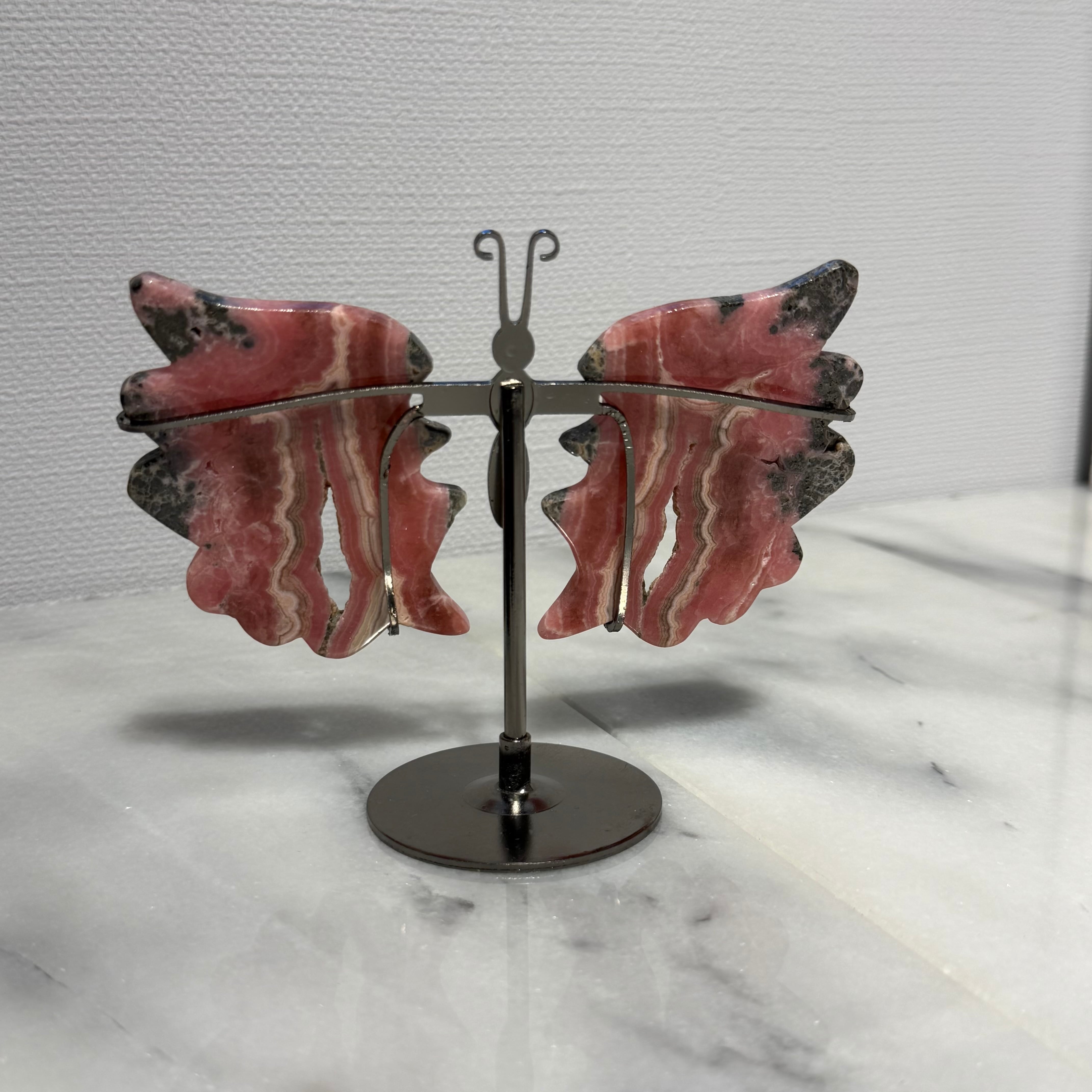鮮やかなローズピンクから深い紅色までが層をなして広がる、アルゼンチン産ロードクロサイトのバタフライカービングです。