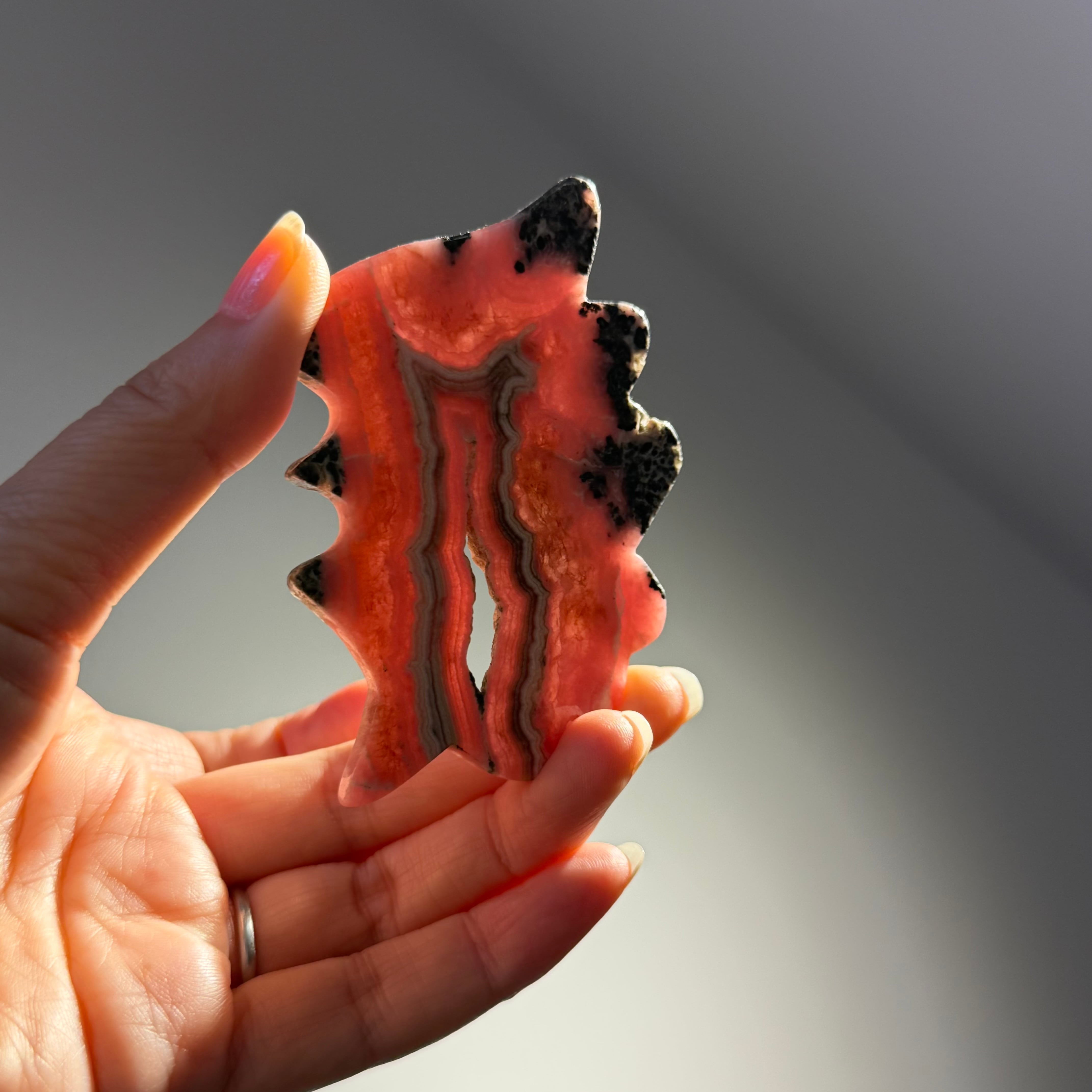ロードクロサイトの中でも発色が良く、光を通すと内側から燃えるような赤が浮かび上がります。
