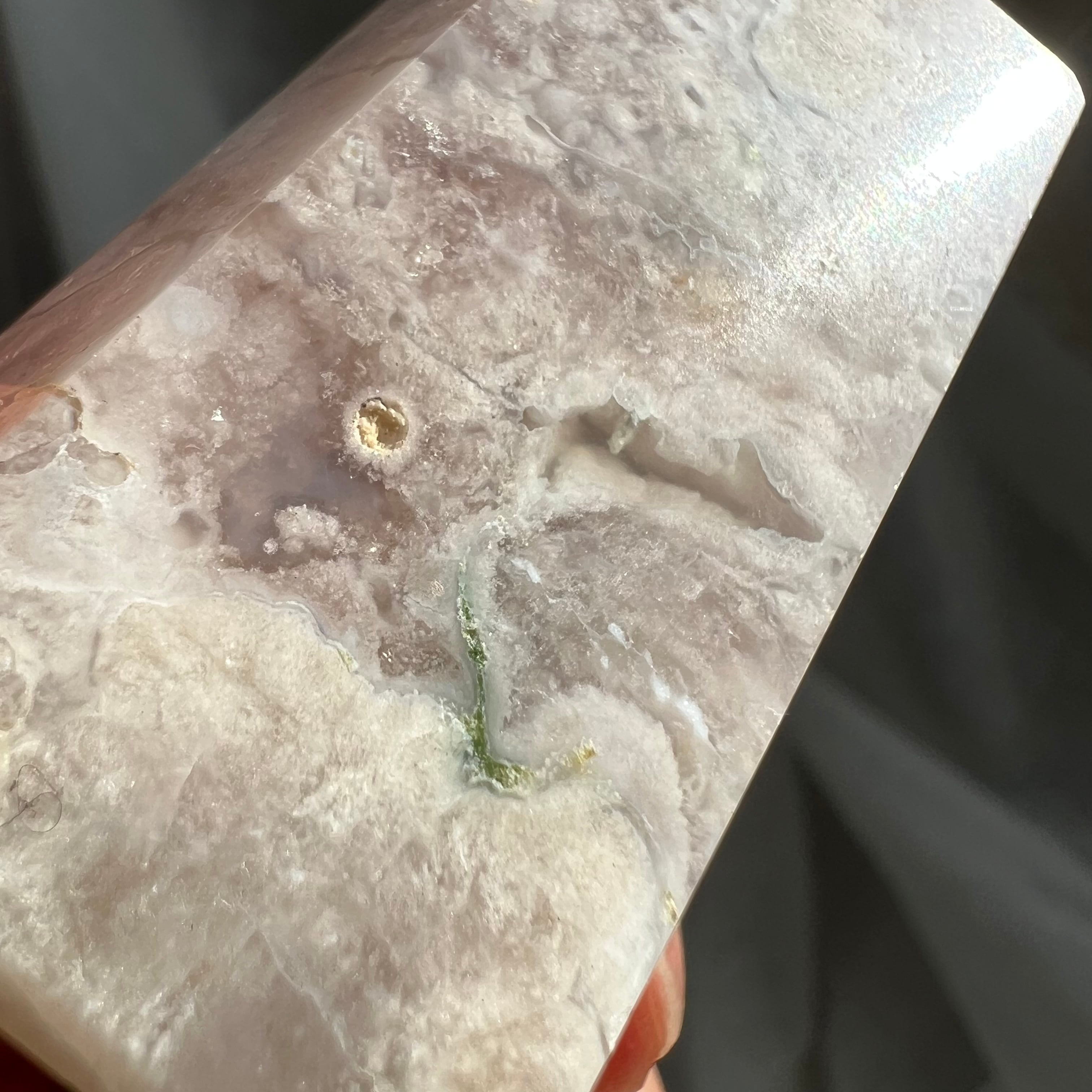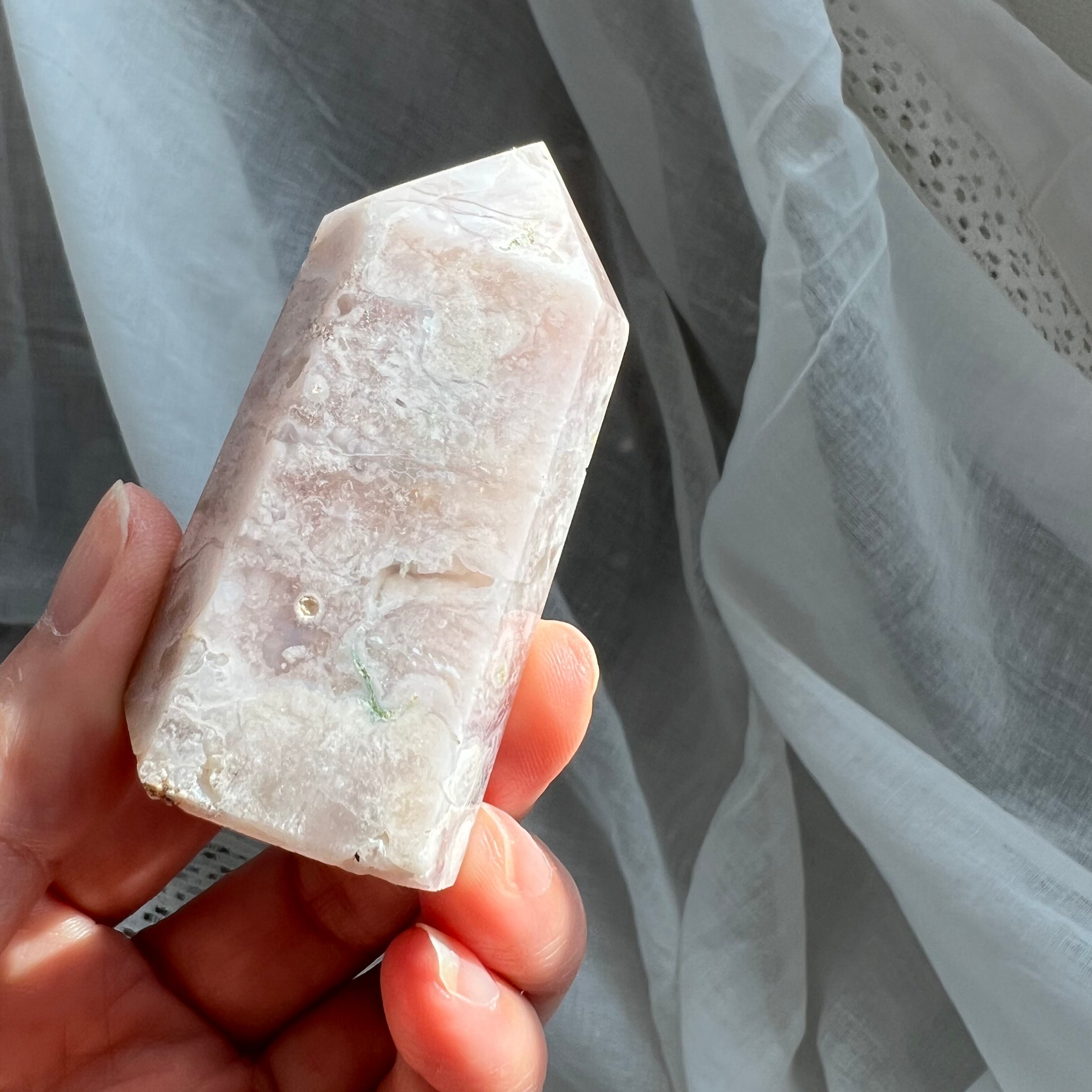 ピンク、グレージュのベースカラーの中にふわふわと花が咲くフラワーアゲートのポイントです。