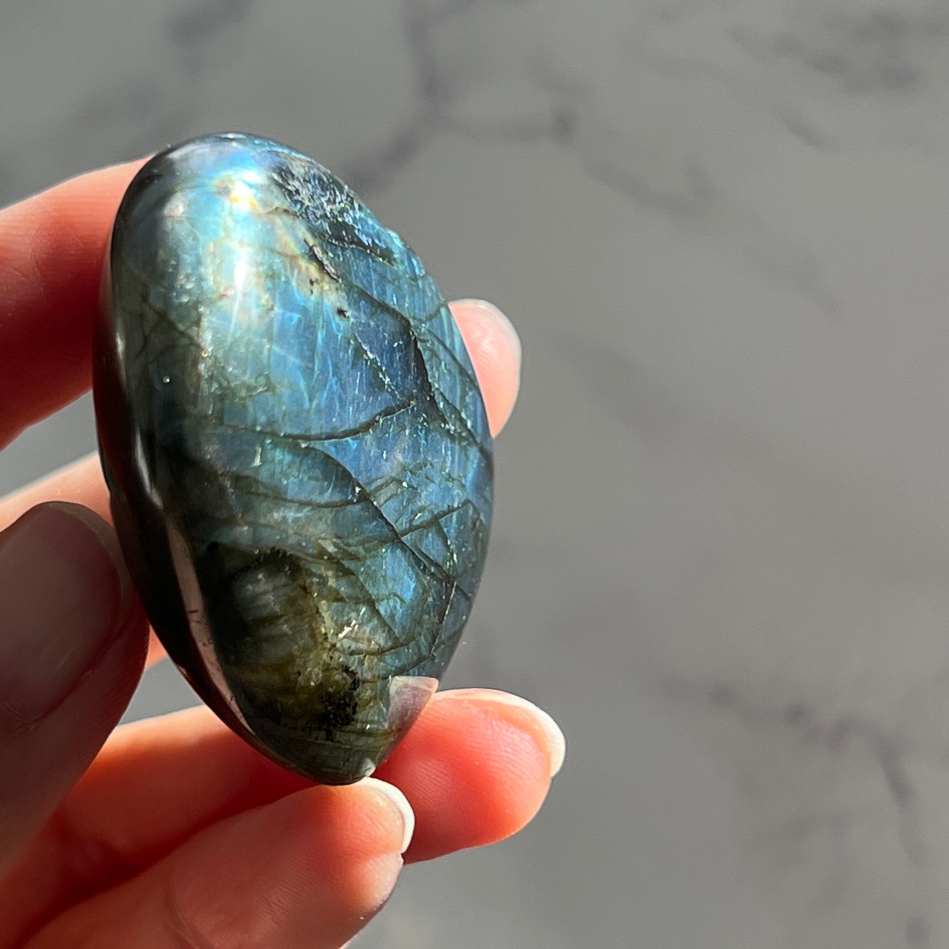 とても強く美しいシラーが輝くラブラドライトのハートシェイプ。