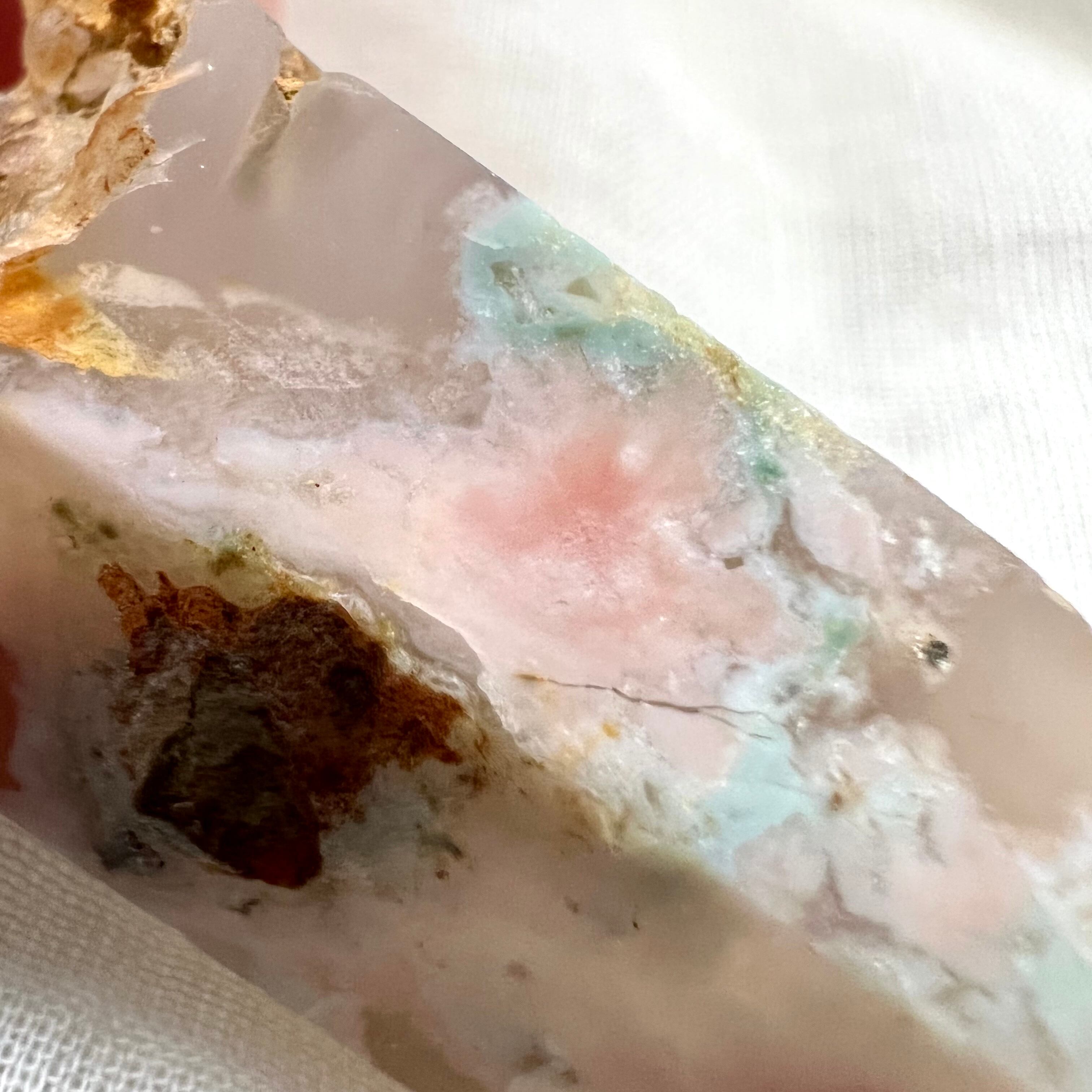 グレージュベースの中に可愛らしいピンクとグリーンがふんわりと見られ、一箇所透けたレッドがとても美しい個体です。