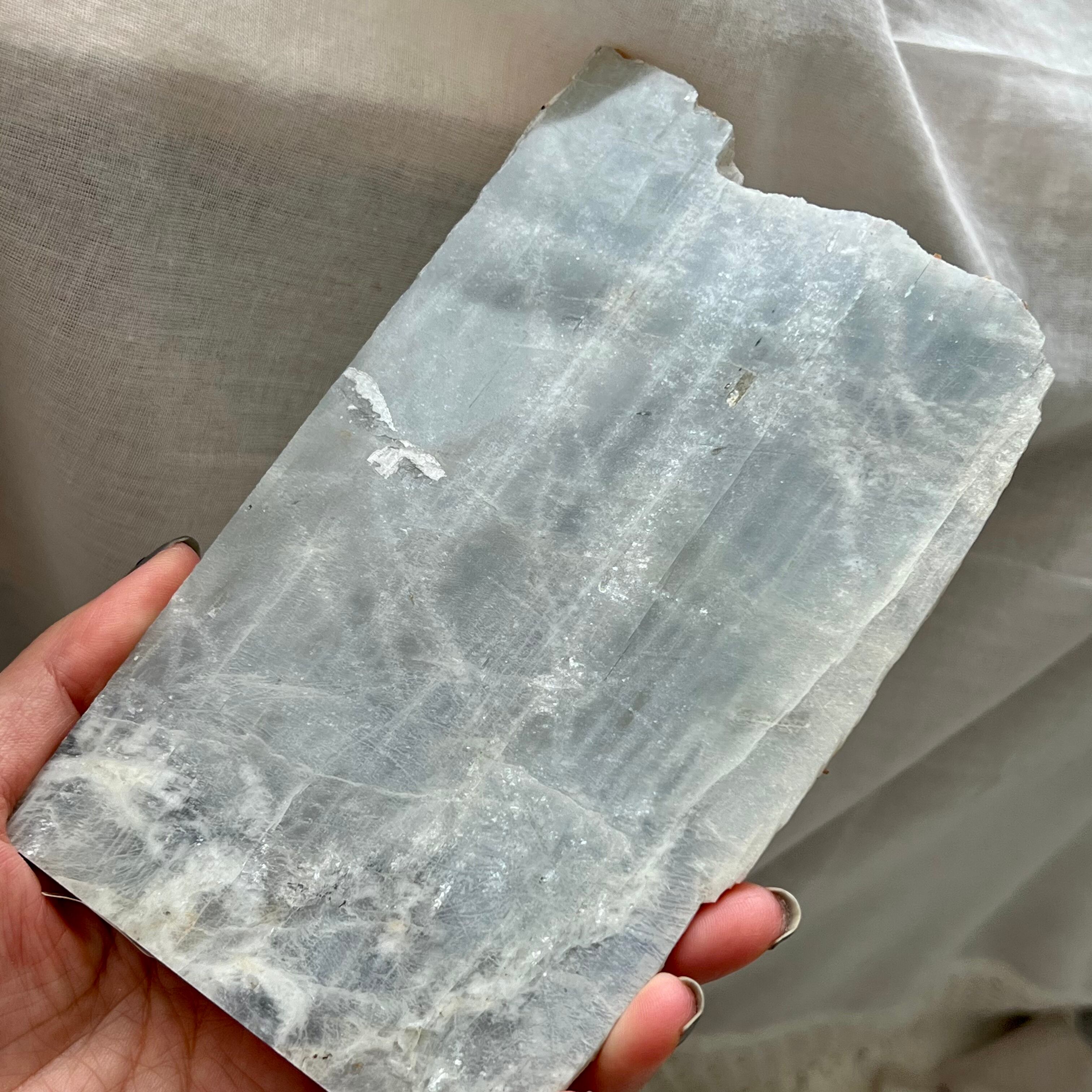 ライトグレーのボディーの内側からブルーシラーが走り抜ける美しいムーンストーンのプレートです。