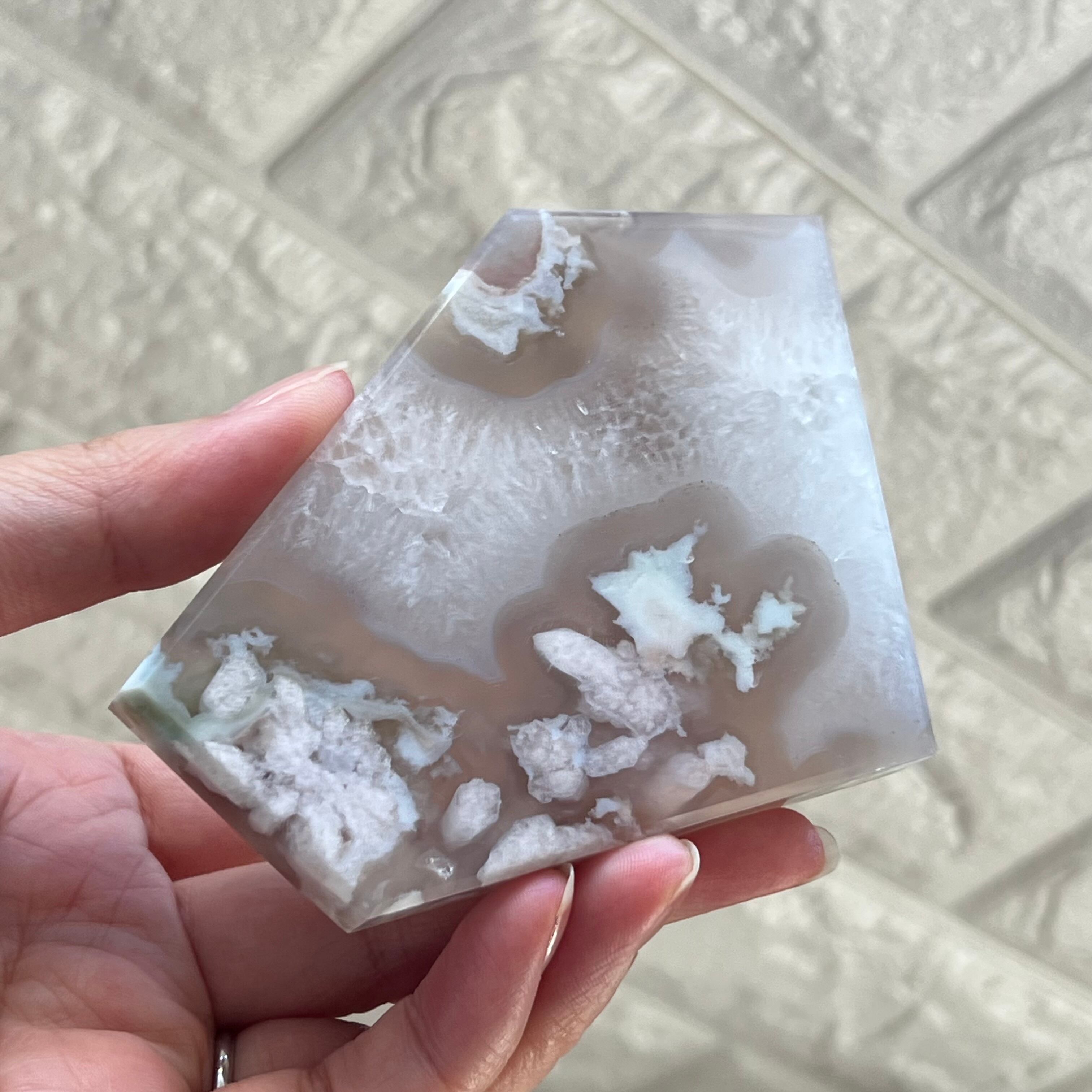 ザクザクとした結晶とアゲートのトロンとした質感の中に見られるグリーンを含んだフラワーが華やかです。